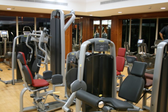 The gym has every conceivable instrument of torture that you could possible want. We have booked a session with the trainer on Monday but until then we’re just trying out all the gadgets. Since there is no chance of walking outside at the moment this is our only way to stay (read ‘get’) fit.