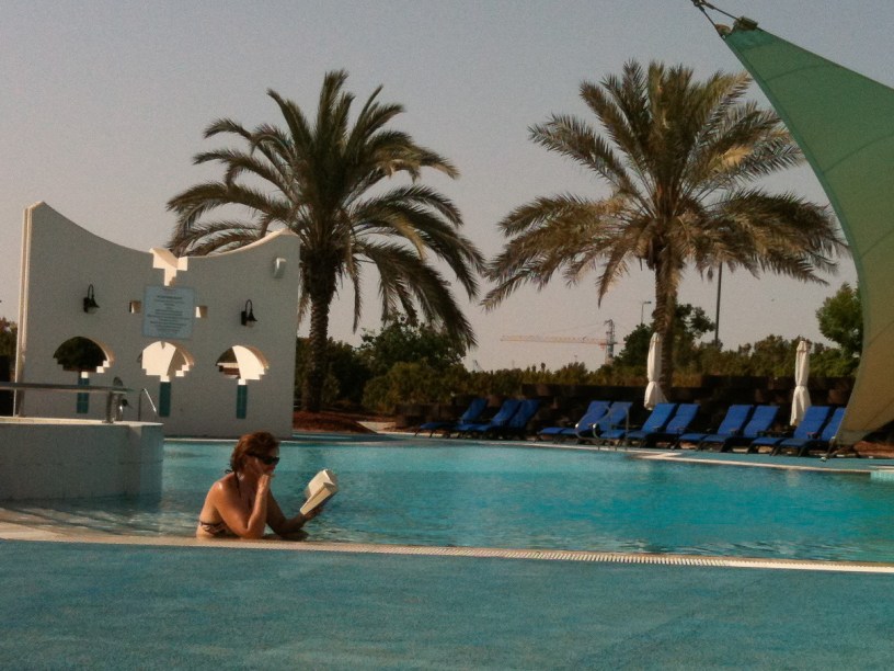This is the pool at the golf club. Sue decided that it was too hot to sit under the umbrella and so read in the pool (which is chilled!).