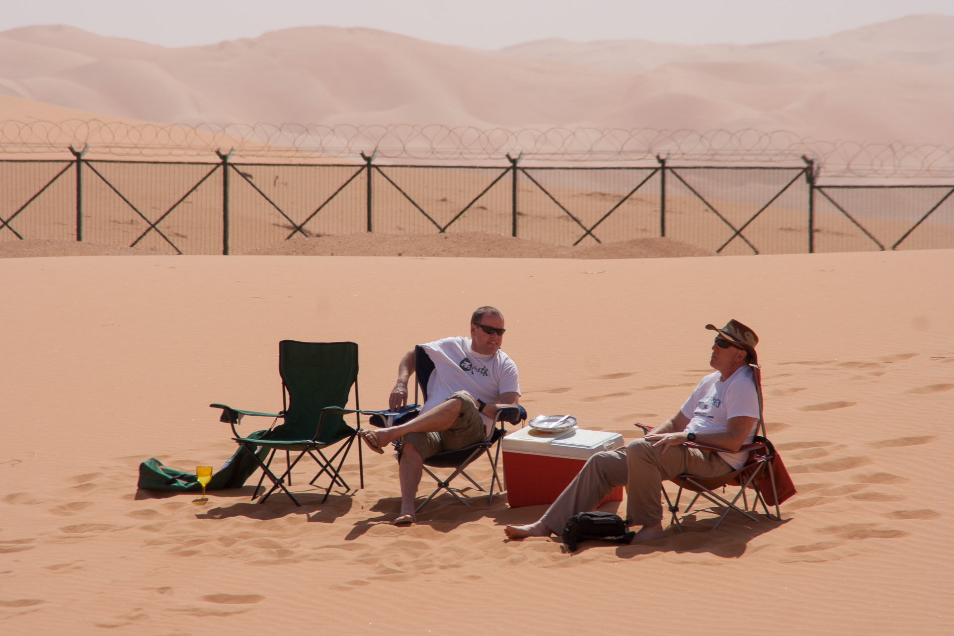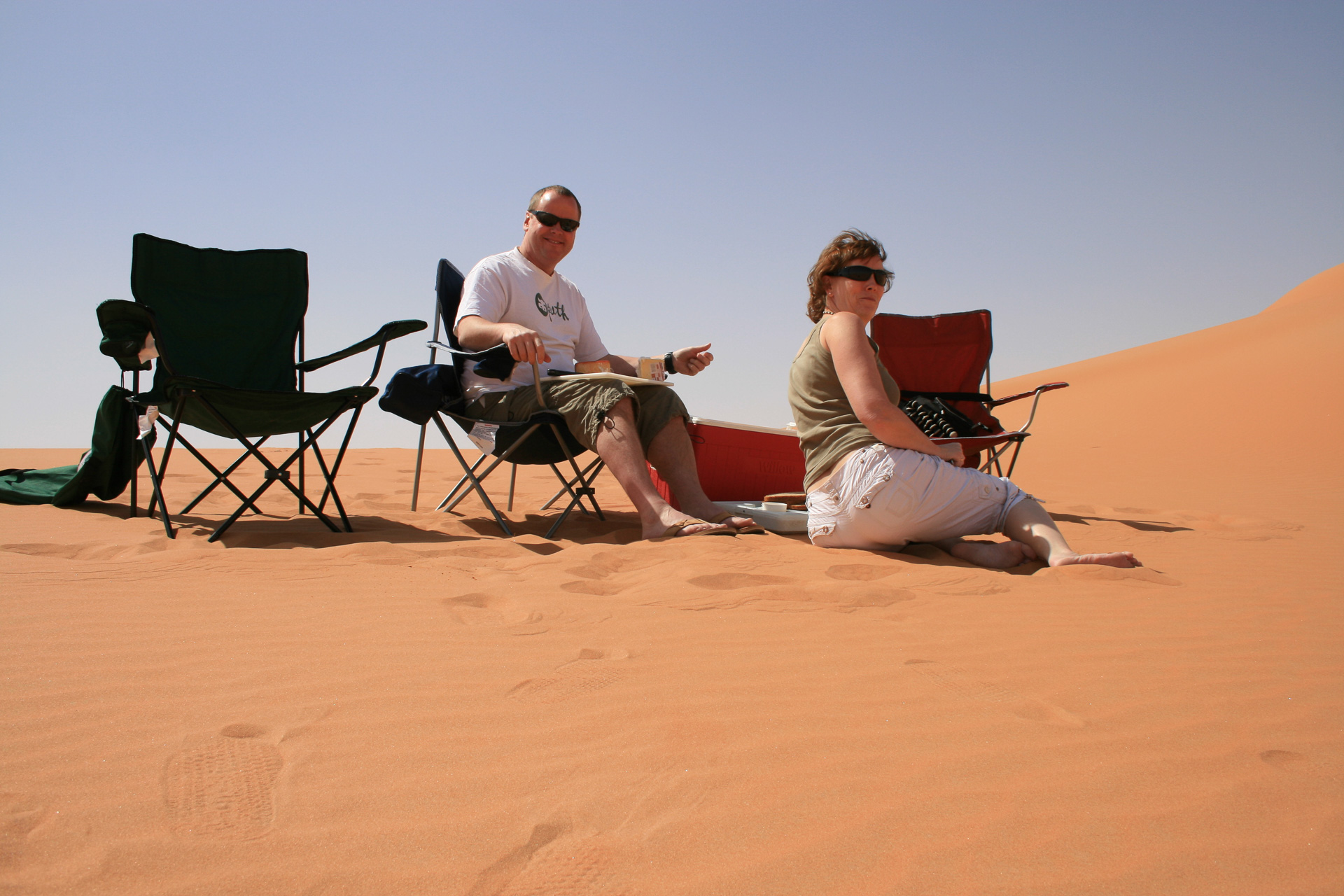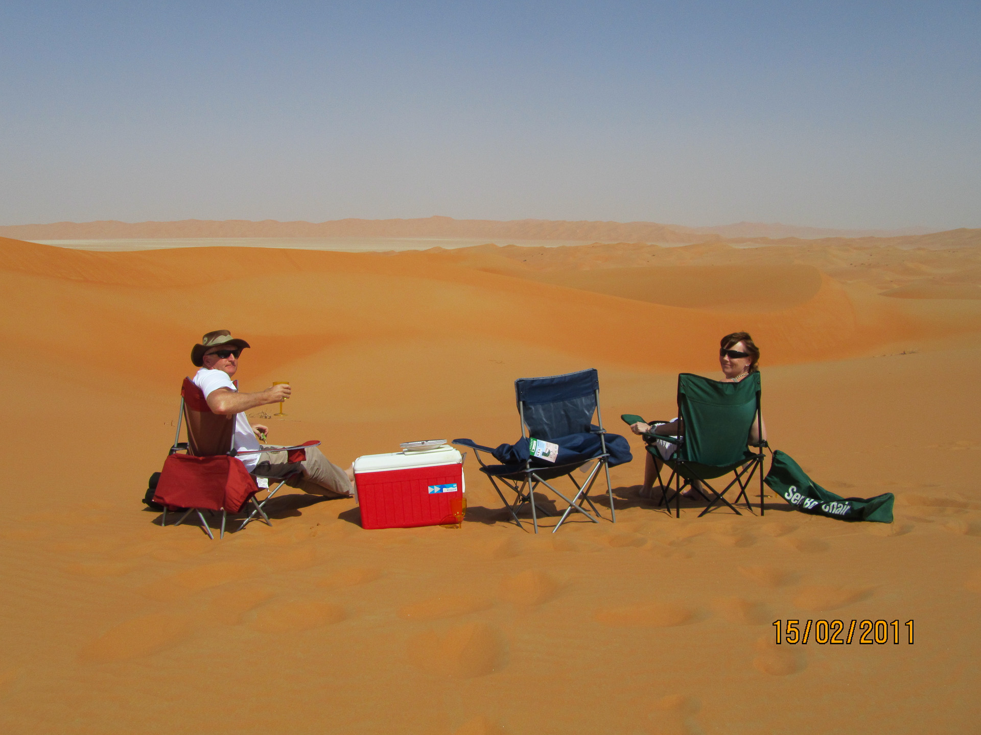 Eventually we called a halt, parked by the side of the road and carried deck chairs and chilly bin over a sand ridge to enjoy our lunch with spectacular views over the red dunes of Rub’ al Khali or The Empty Quarter.