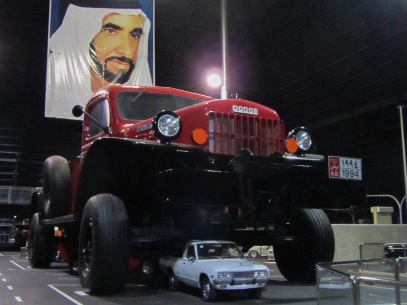 The road took is past the Emirates National Car Museum, the private collection of Shaikh Hamad. The museum was closed for renovations but the guard and the cafe manager clearly spotted a chance to make a few dirhams. So after freshly squeezed juices at the cafe we were let into the pyramid. True! The museum is inside a corrugated iron pyramid in the middle of nowhere. Take a look at the website to see more. The monster truck and caravan feature in the Guinness Book of Records and were actually driven across the desert to qualify. Also inside is a collection of Mercedes each painted in a different colour of the rainbow.