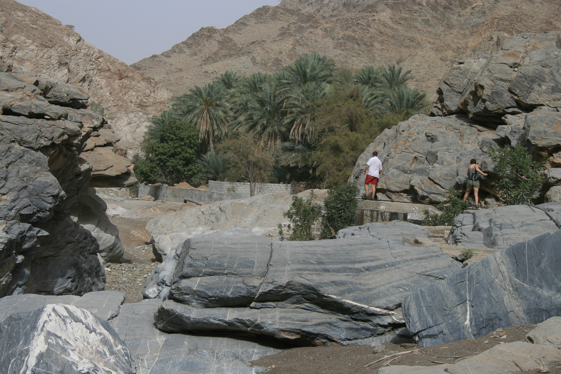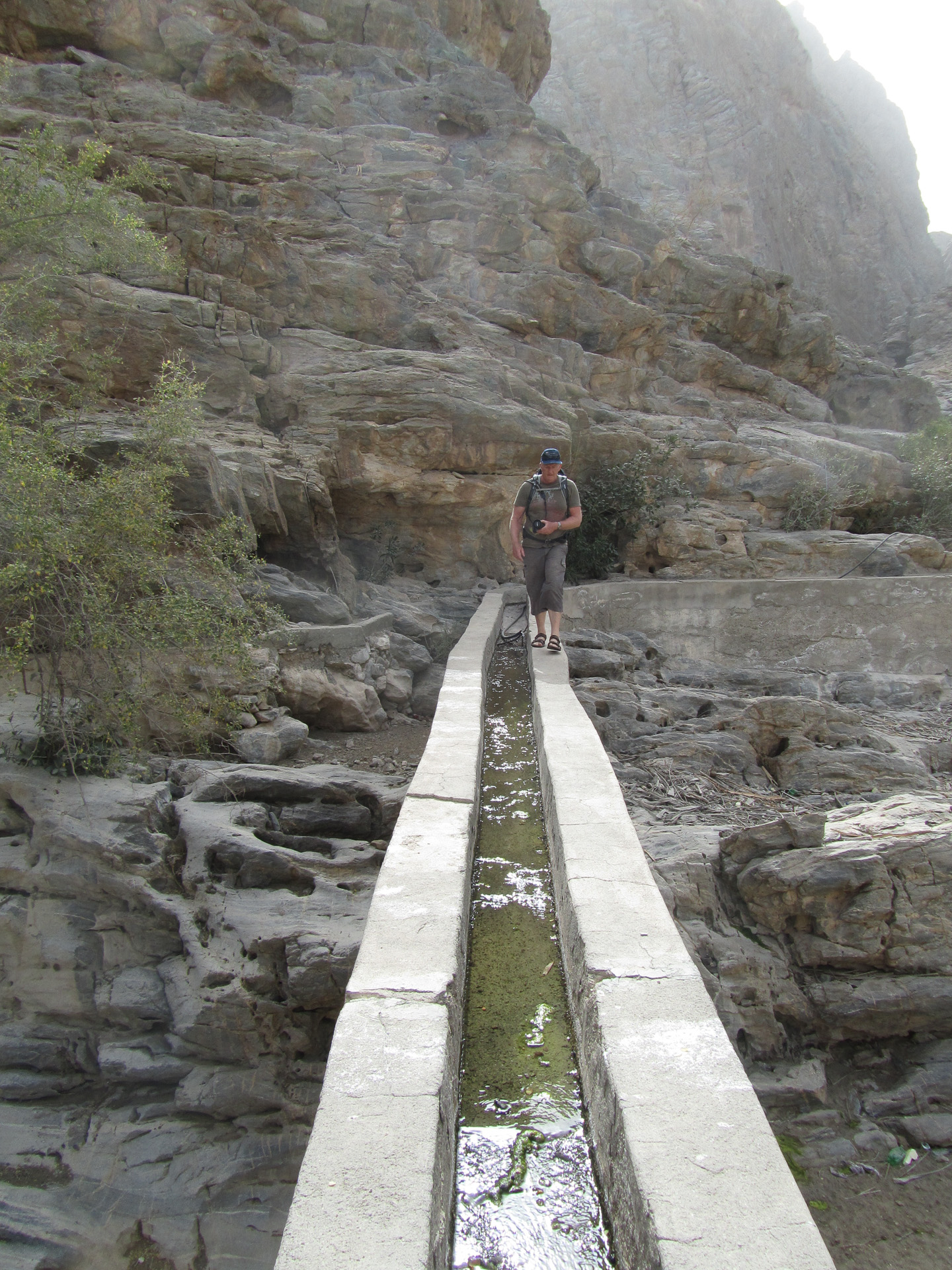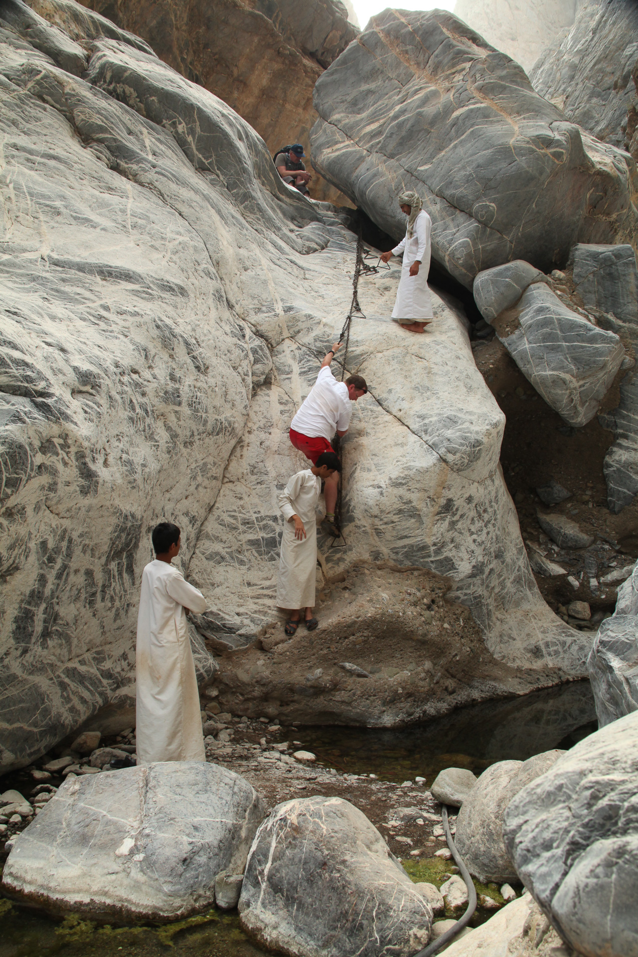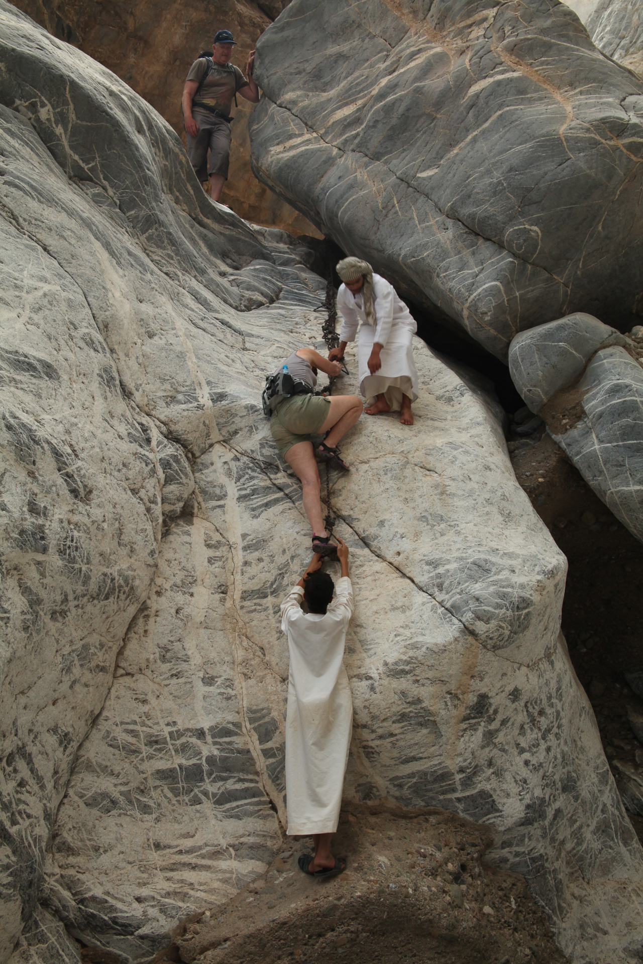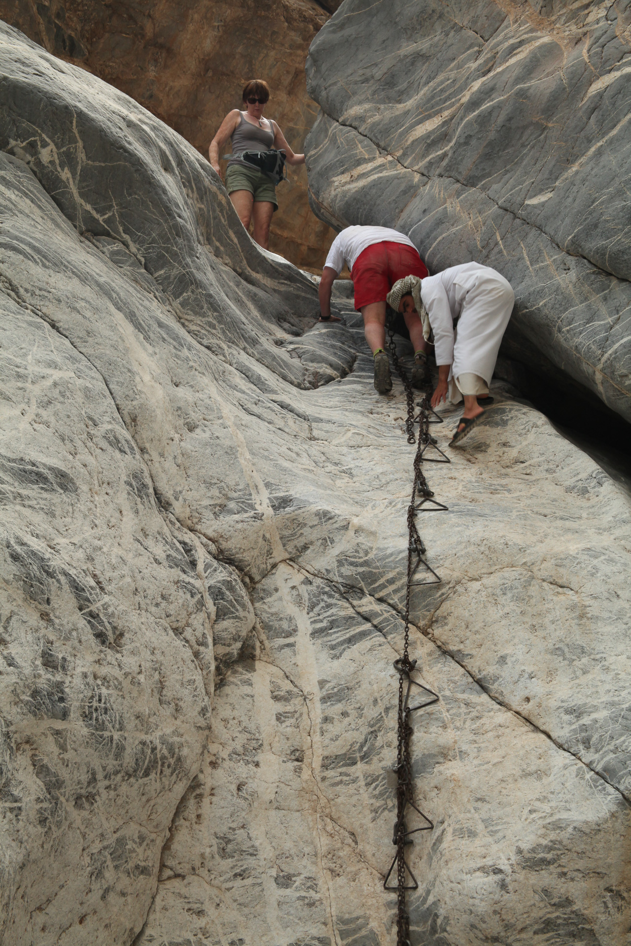 We drove back to the border crossing at Al Ain via the coast road and Sohar but made a major detour inland to do a wadi walk called ‘The Chains’ because of a helpful set of chains and stirrups left by the British army in the 1920 and used to clamber up a particularly steep section of the ‘walk’