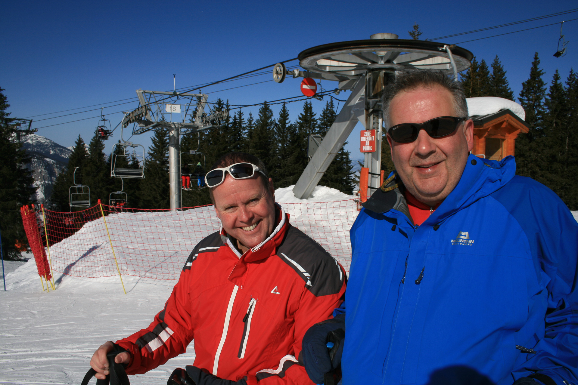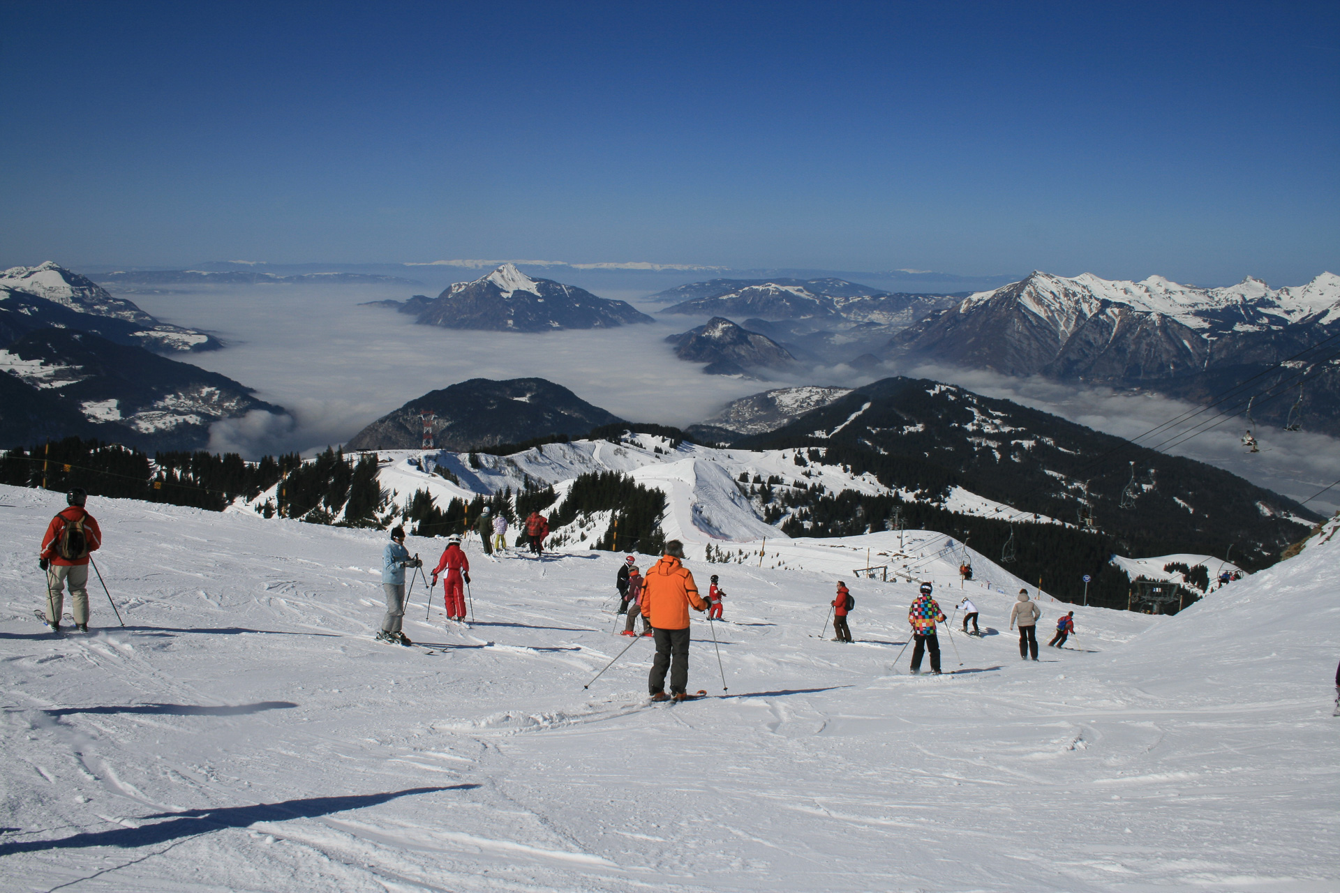 After an hours refresher course on day one, Jonathan, Paul and I headed for chair lifts and started to explore the slopes. Clair, Colin and the girls stayed on the nursery slopes to build a bit more confidence and Sue and Lesley enrolled in the ski school for two hours a day for the rest of the week. Clear skies for us for the next two days but the lower valley was covered by cloud.