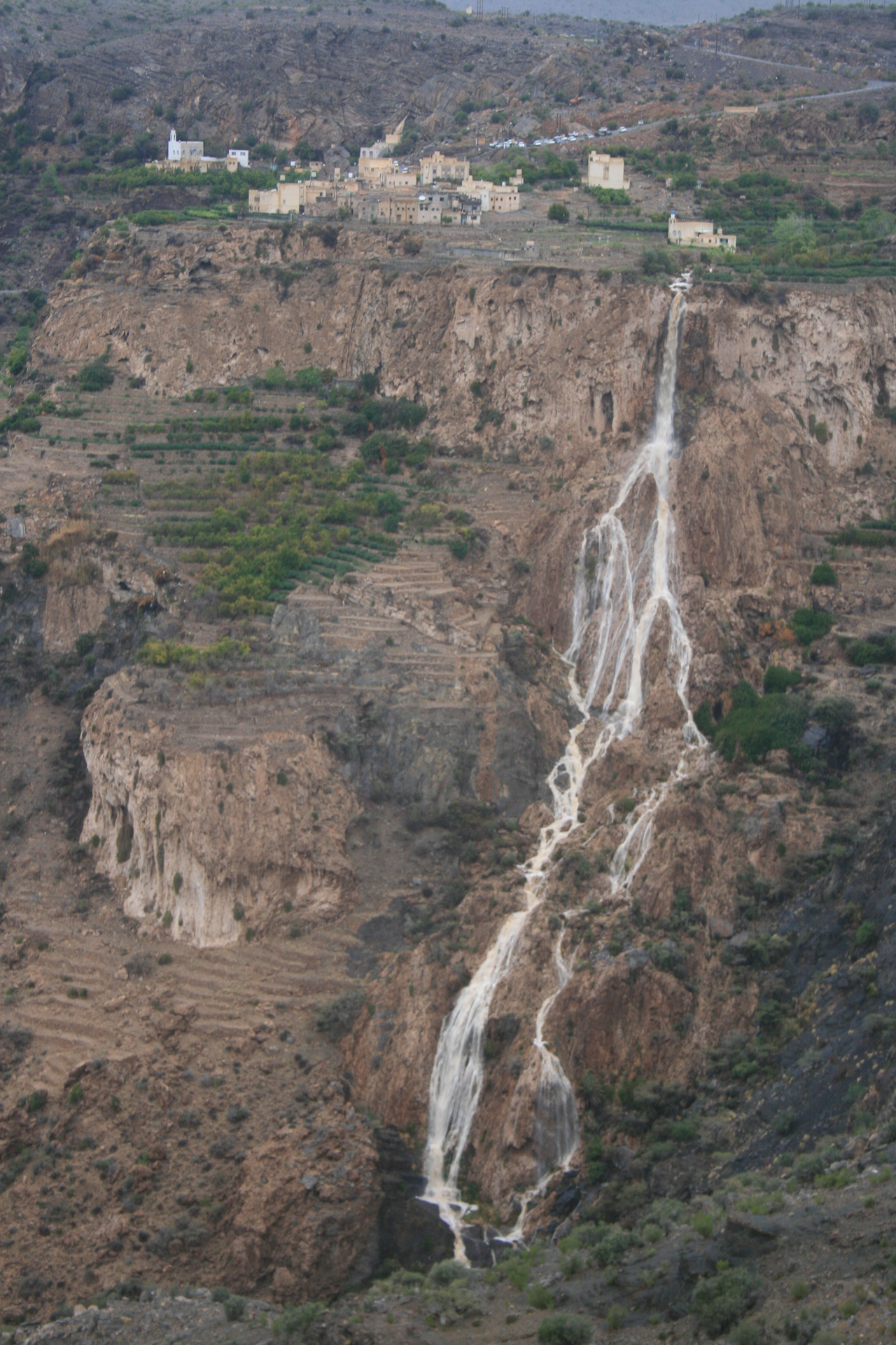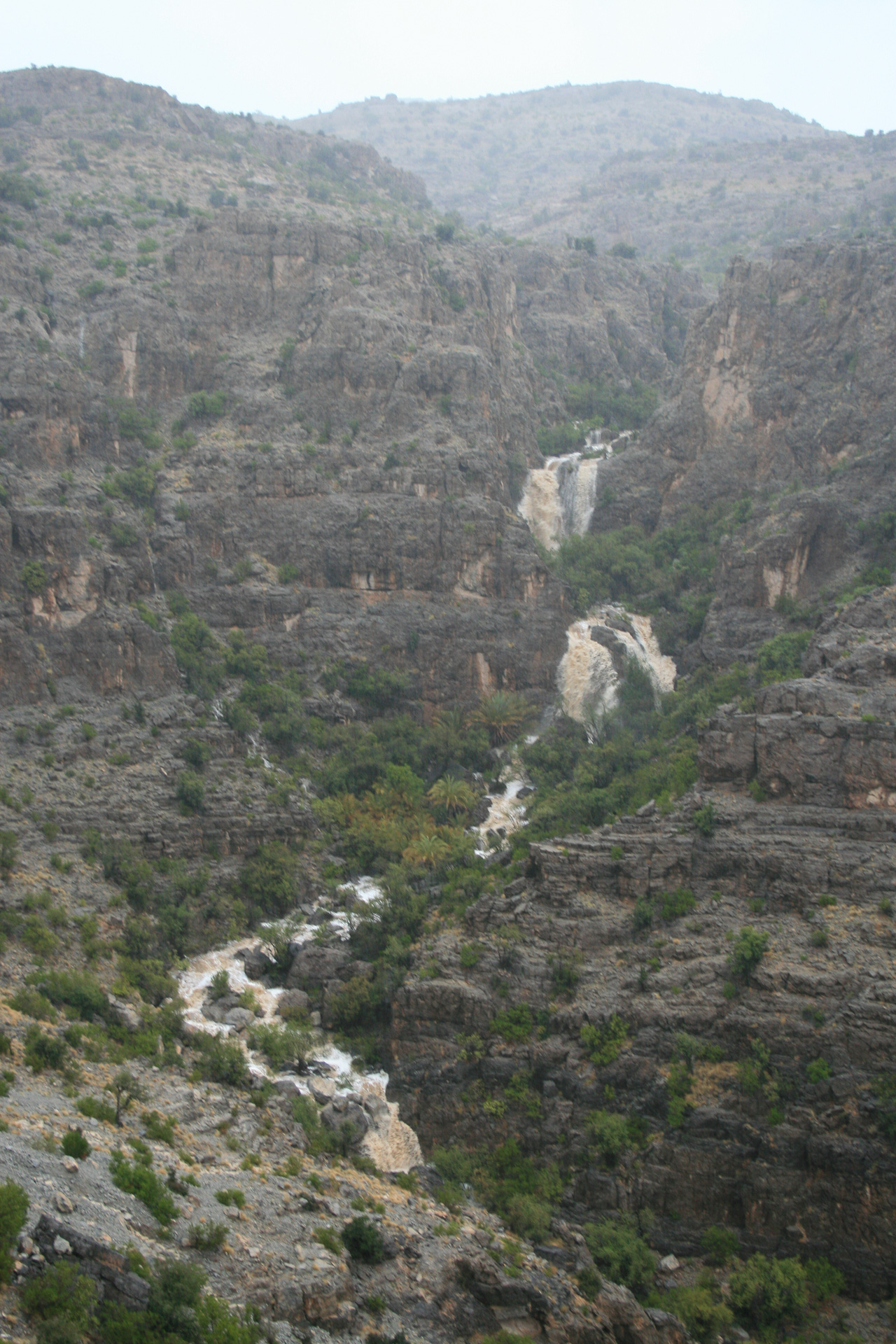 We could hear what they were coming to view before we actually saw it. The dry wadi that we had walked through on the Three Villages Walk in December now held a raging torrent ending in a spectacular waterfall dropping several hundred metres.