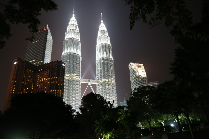 Yesterday we managed to walk to the Petronas Towers. There was an air- conditioned walkway linking several hotels and shopping centres to the KL Convention Centre. The Convention Centre opens onto a park with great views of the towers. So good that I decided to go back to see it at night. Unfortunately the walkway closed at 11pm. By the time I had walked around the park and 20 minutes back across town I was dripping. Well worth it to see the towers lit up.