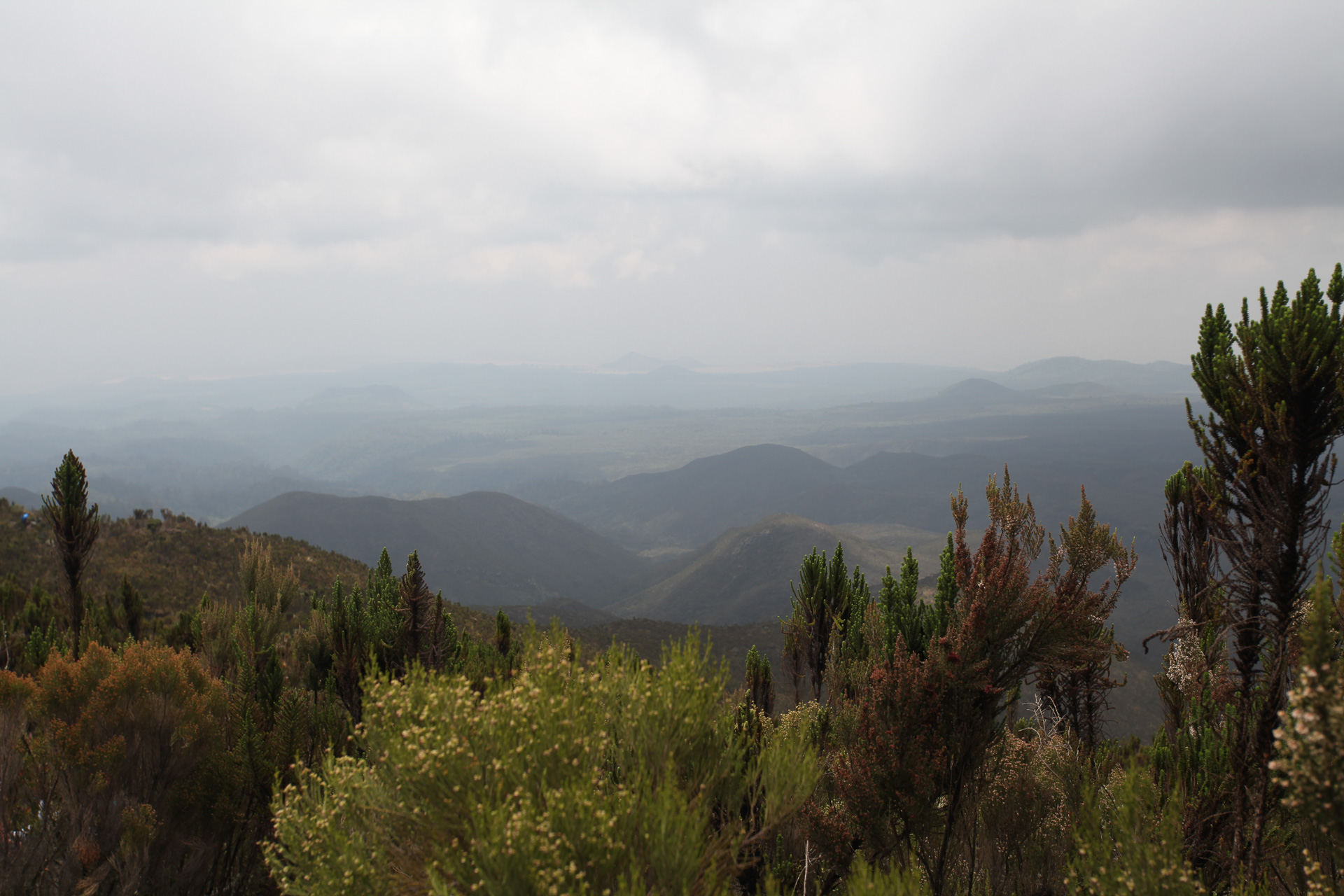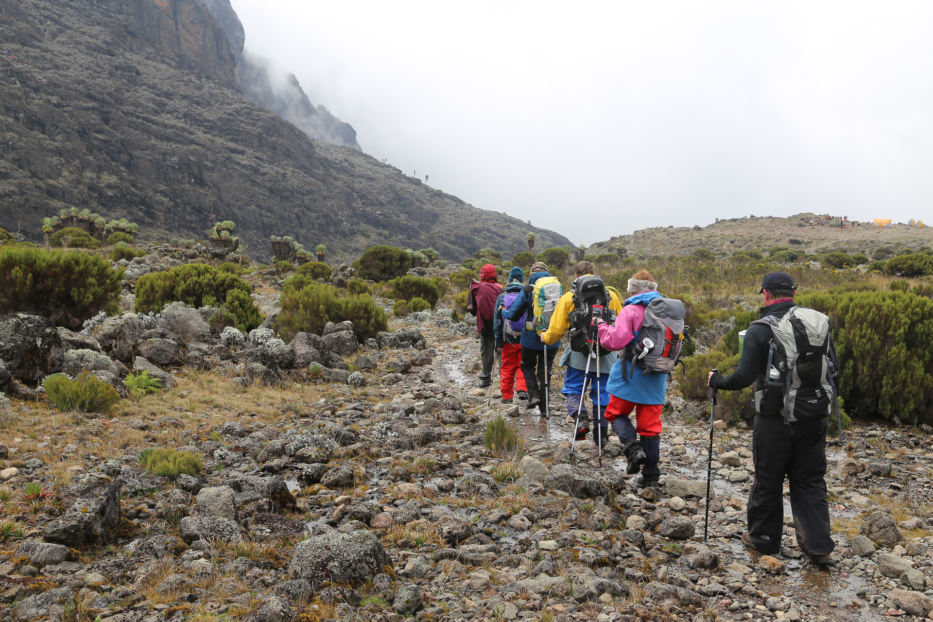 Another wet night was followed by a wet morning’s tramp across the Shira Plateau. A steady climb took us from moorland to the upland desert beneath the Lent Hills. The promised panoramic views were mostly lost in the low cloud.