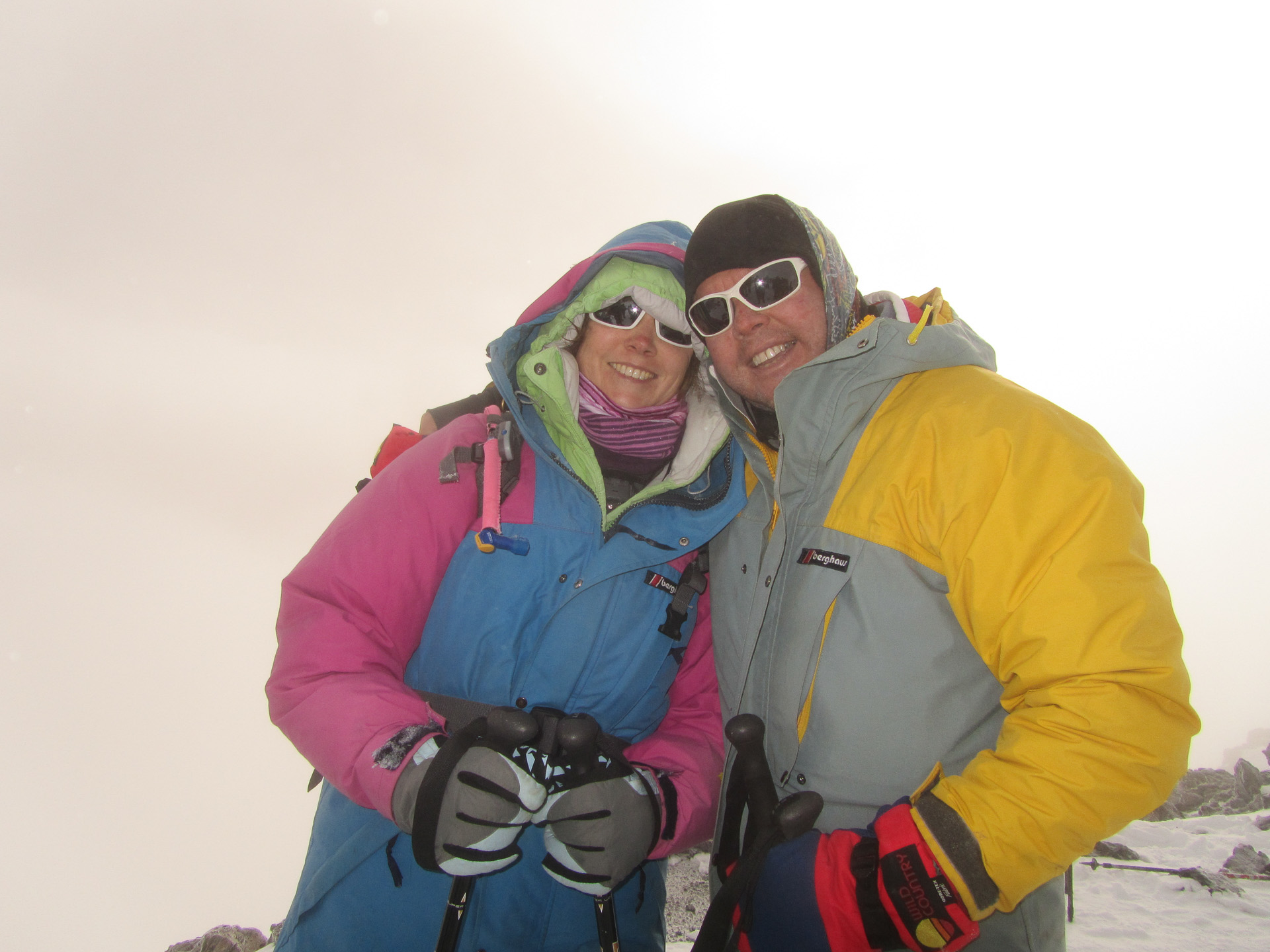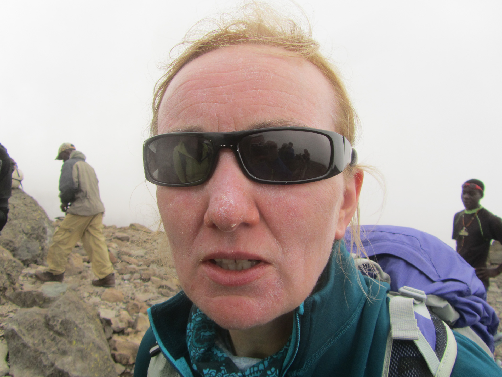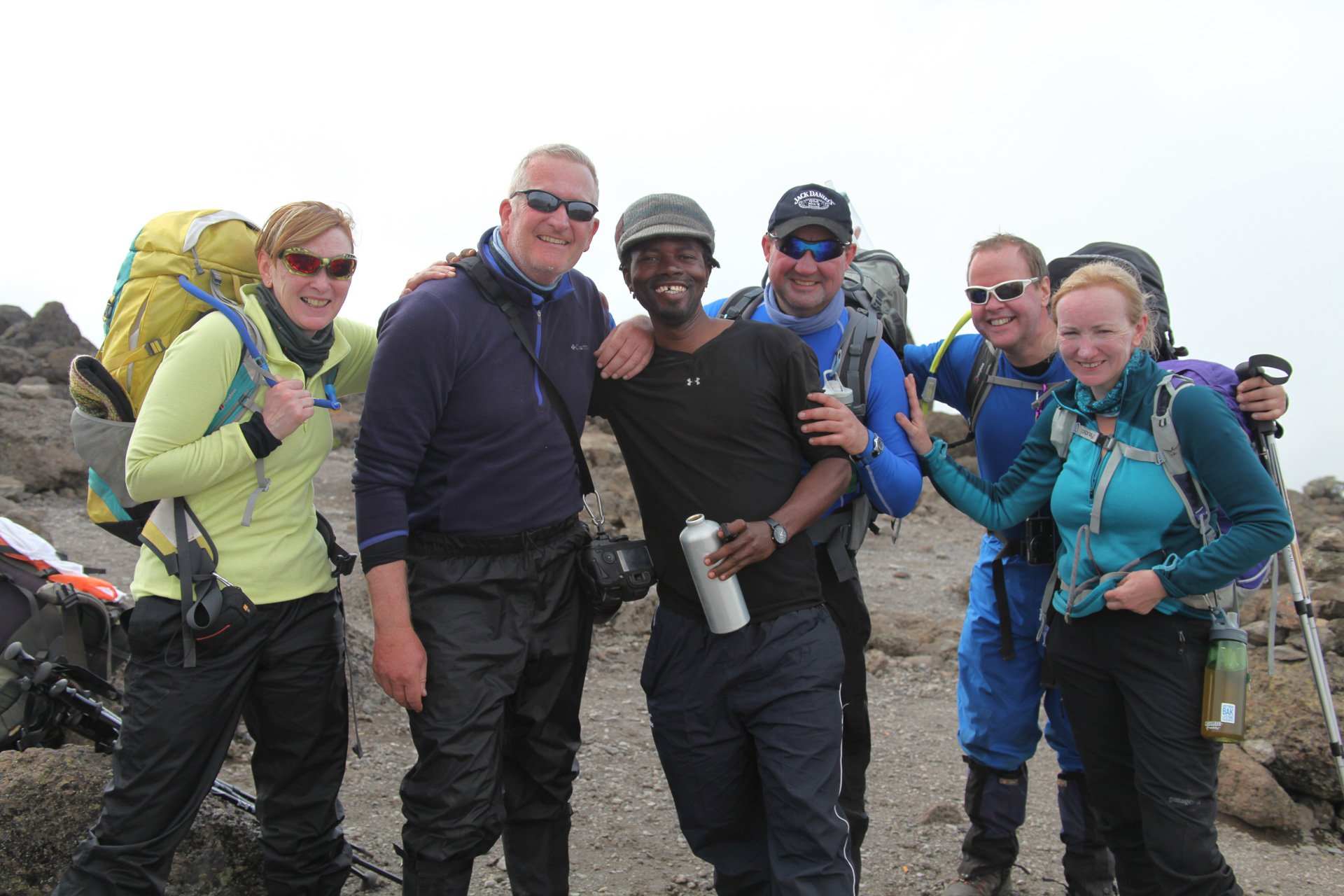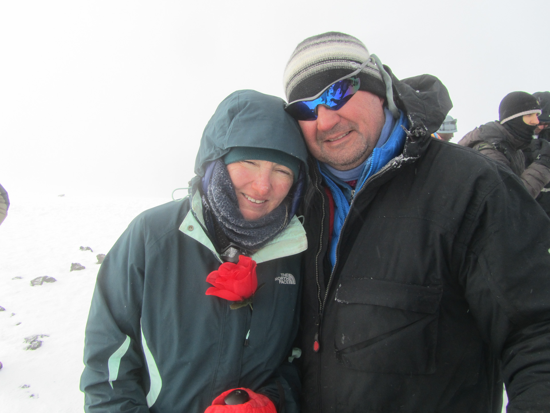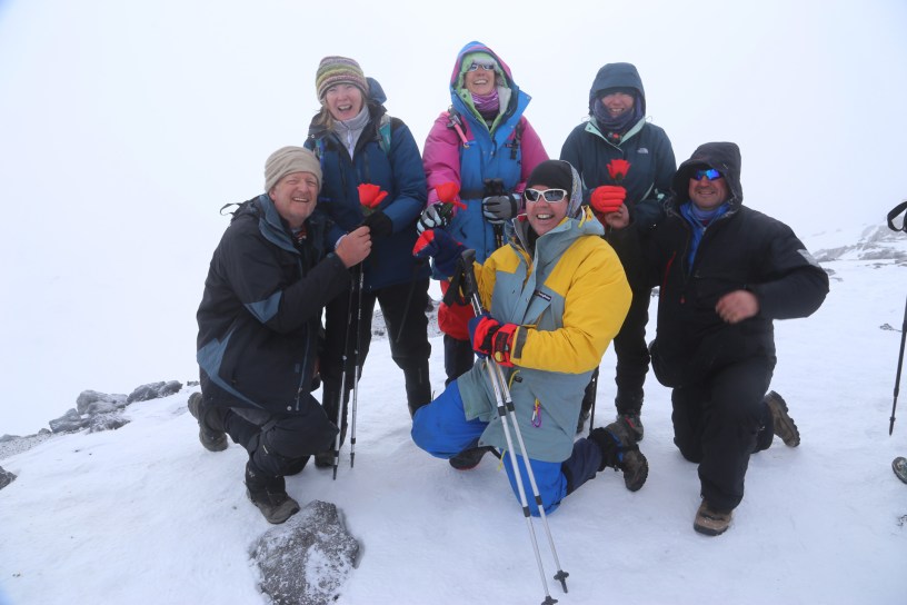 All that was left was an hour long slog along the crater rim to the summit, Uhuru Peak at 5895m. Out of breath most of the time we had glimpses of the summit glaciers but none of the amazing views that we had hoped for. We did manage to get the obligatory group photo in front of the summit sign and the sisters had a Valentines Day that they would never forget.