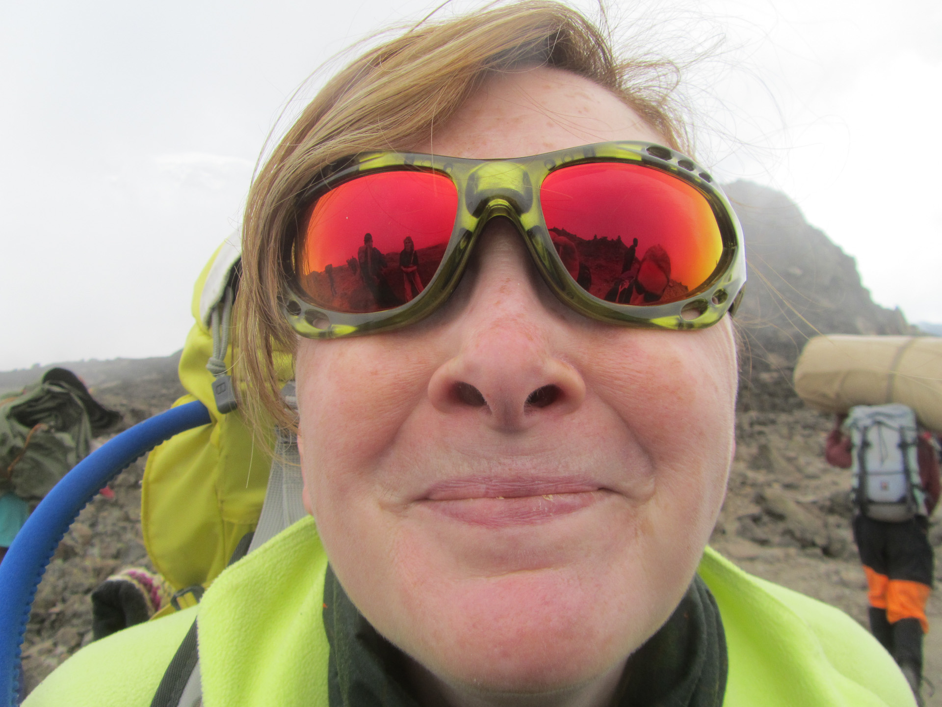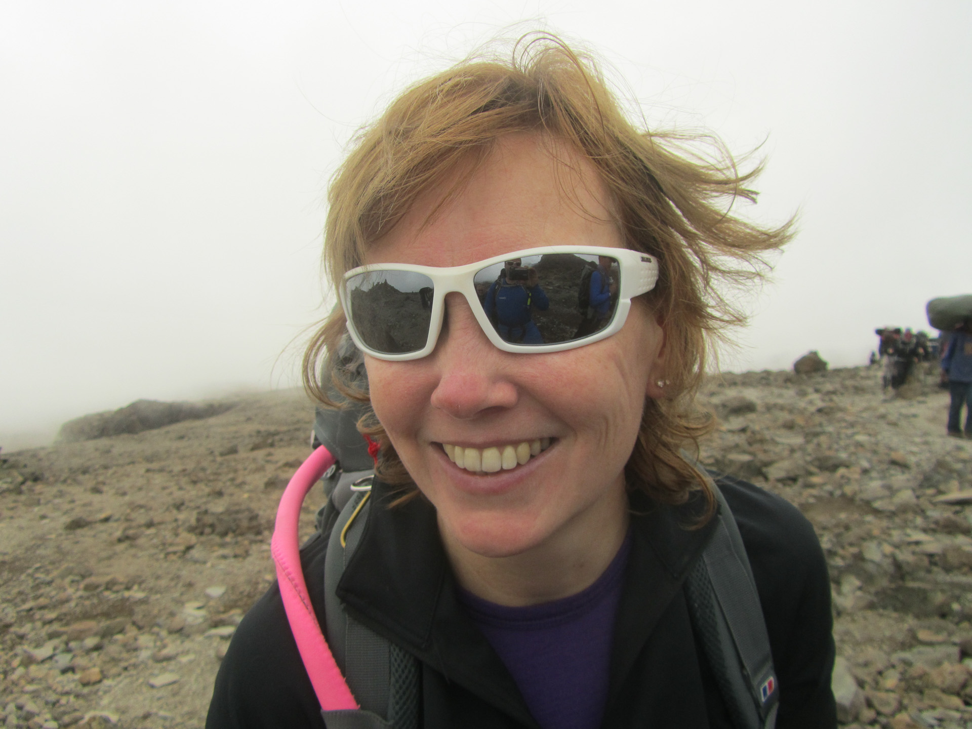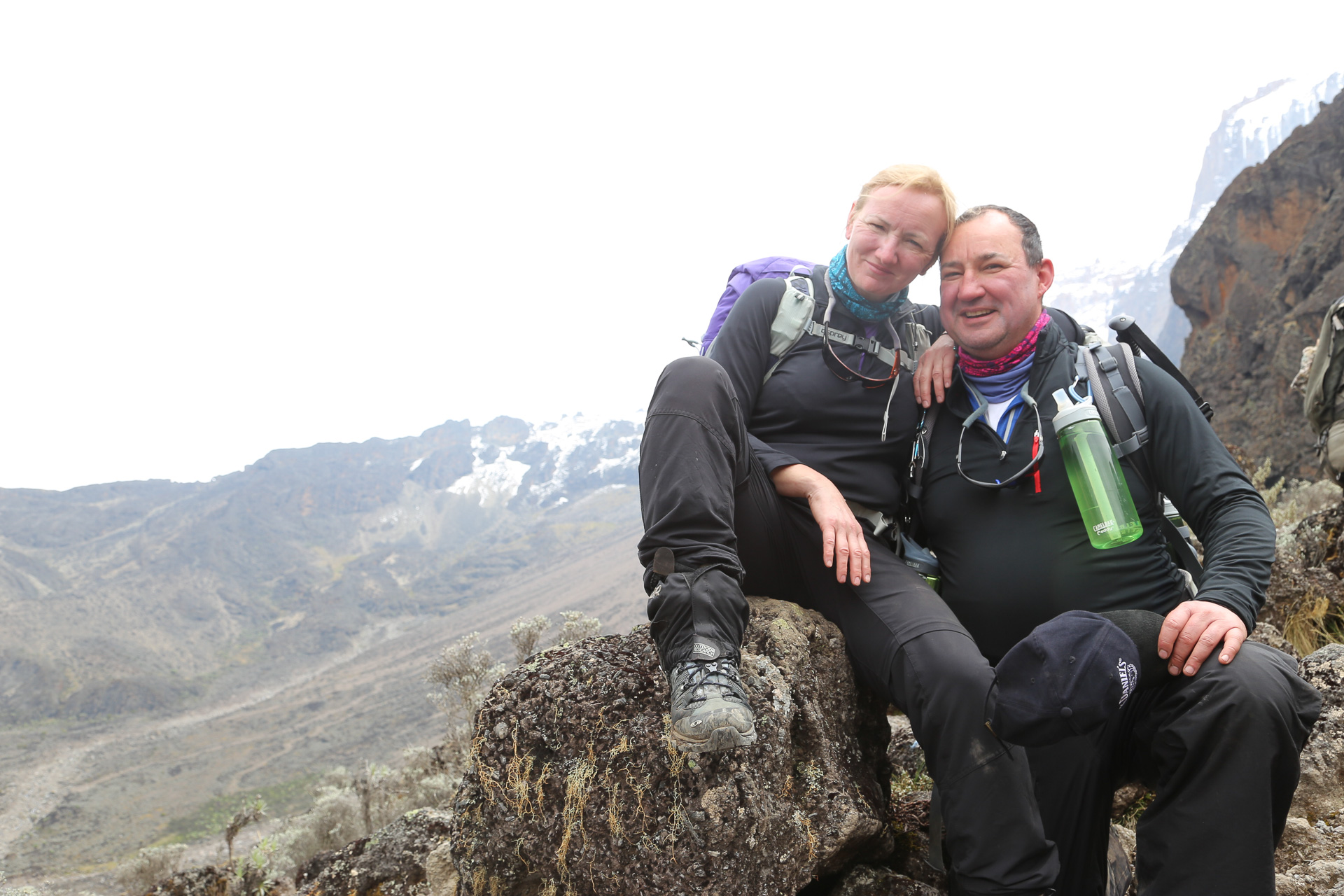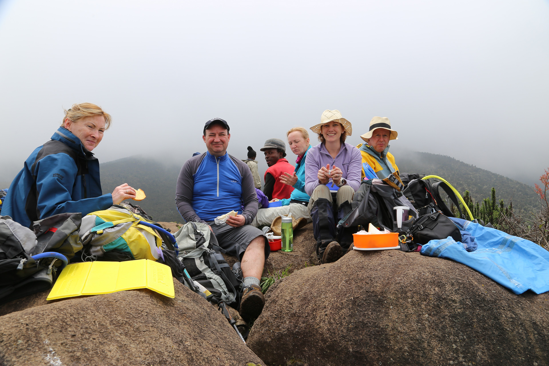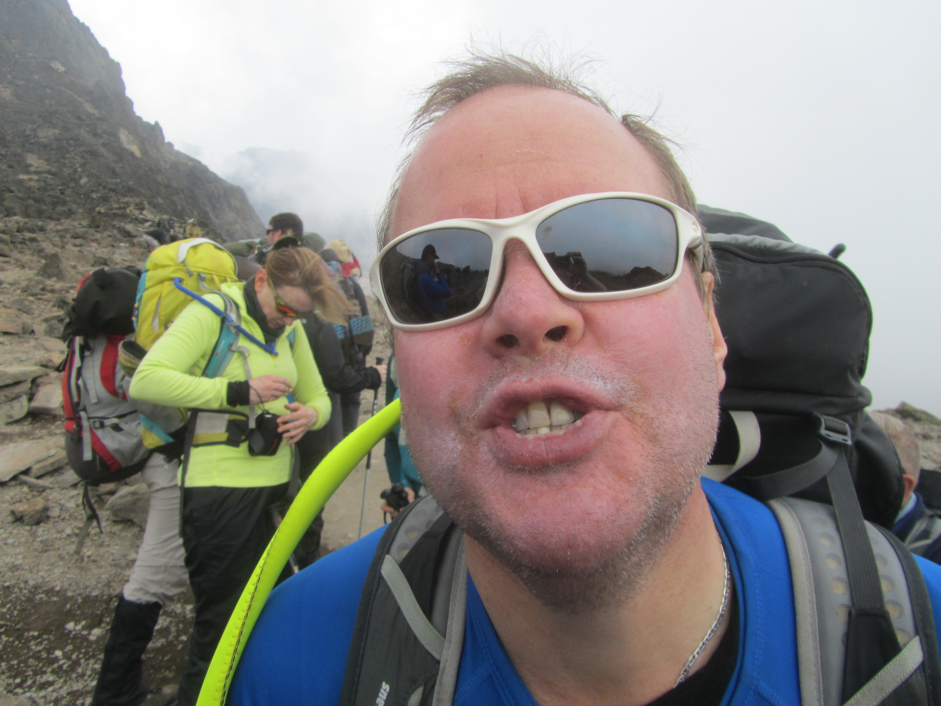 All that was left was an hour long slog along the crater rim to the summit, Uhuru Peak at 5895m. Out of breath most of the time we had glimpses of the summit glaciers but none of the amazing views that we had hoped for. We did manage to get the obligatory group photo in front of the summit sign and the sisters had a Valentines Day that they would never forget.