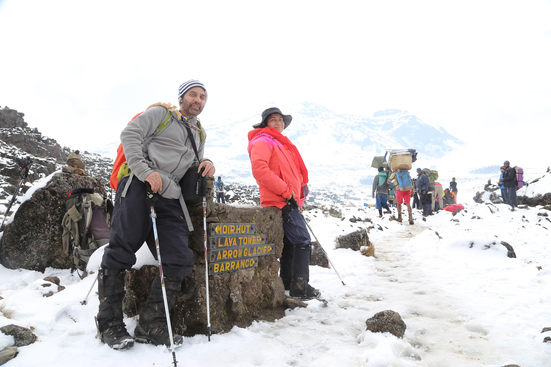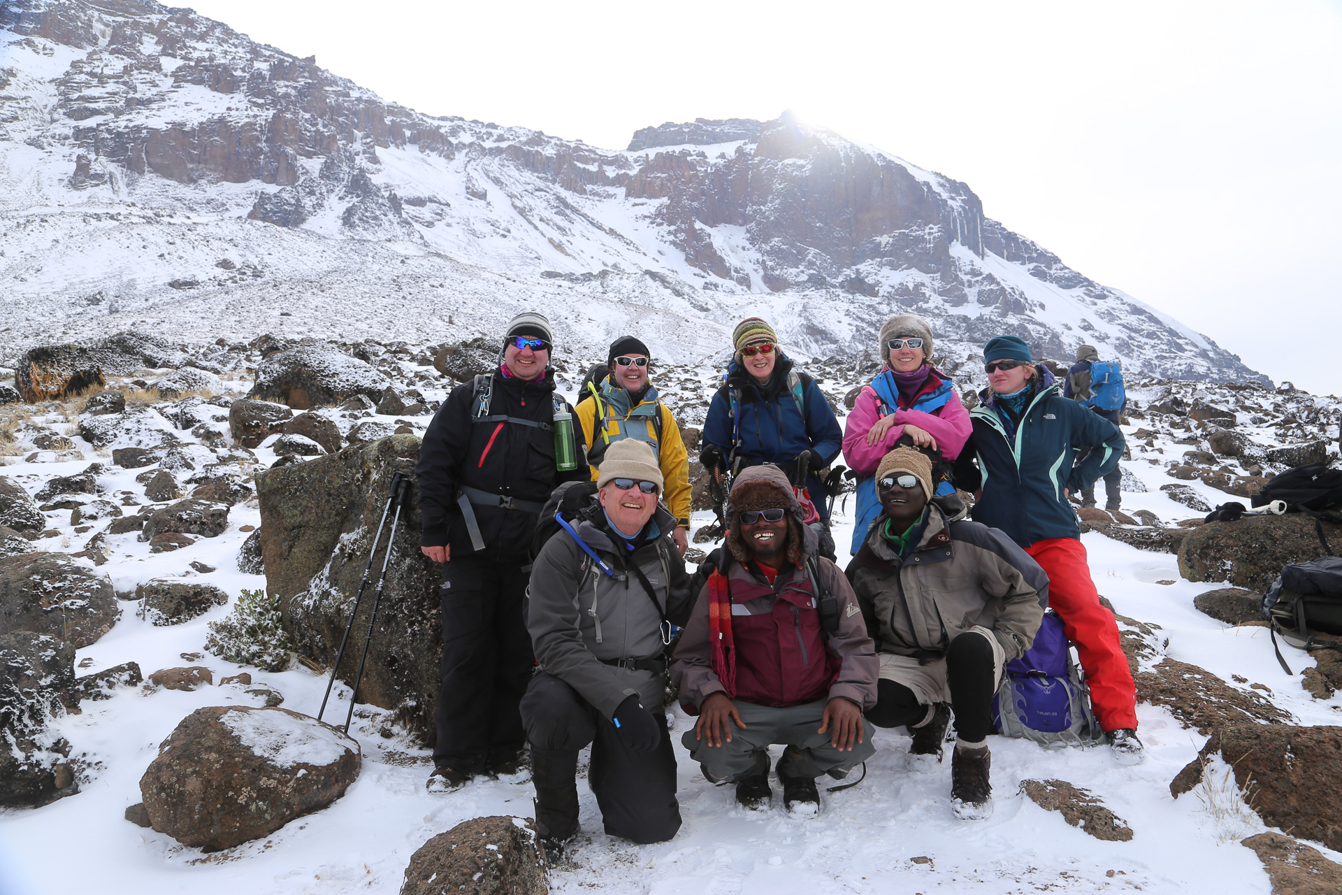 A grey morning soon turned into clear, bright day as we made a gentle ascent (all things are relative) past the glaciers of the Western Breach. We enjoyed beautiful views across a snow-covered landscape as we walked to Lava Tower Camp at 4640 m. Another acclimatisation walk took us up a further 200m to the foot of the Arrow Glacier. We were rewarded with stunning views of the hanging glaciers and back towards Lava Tower and our camp.