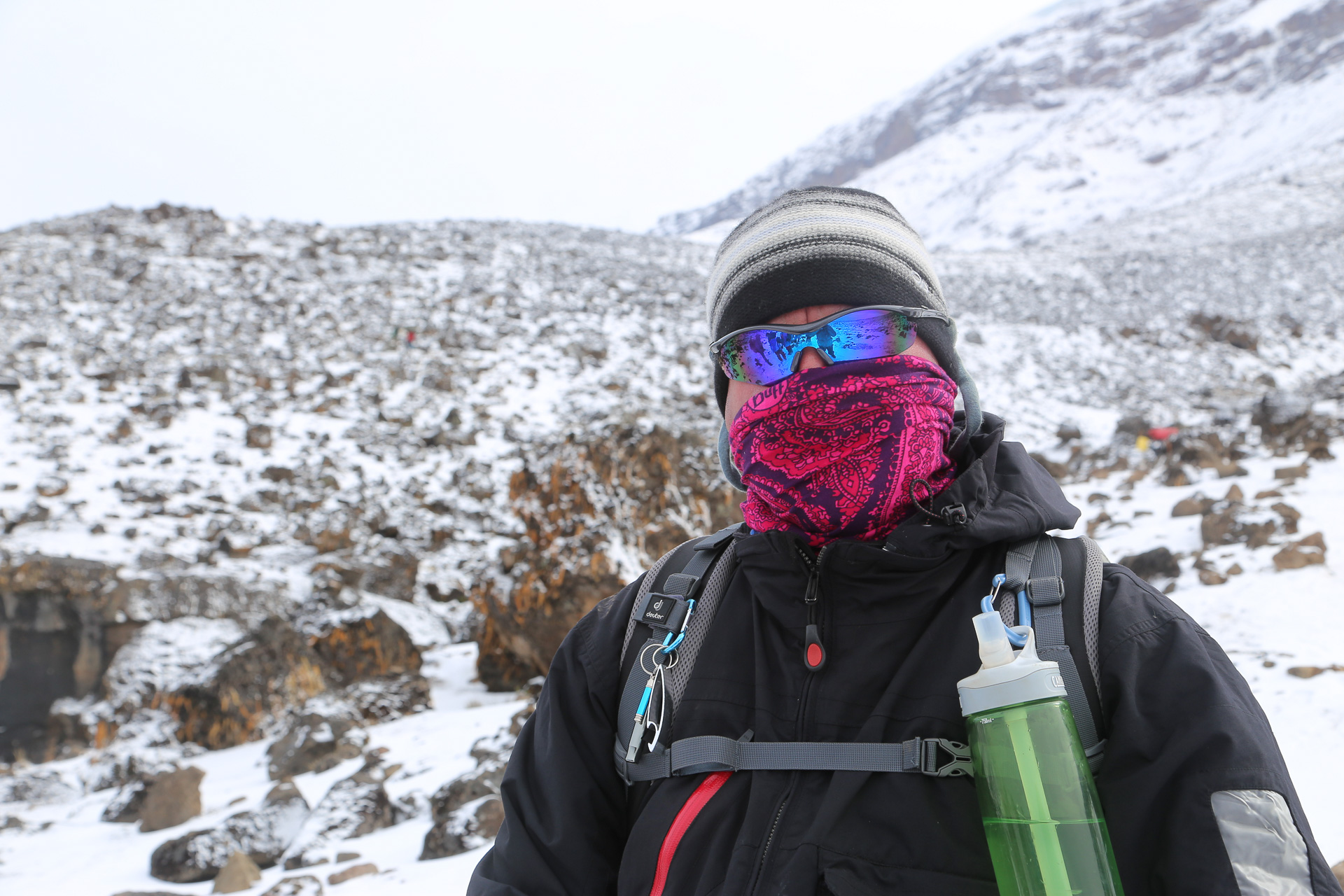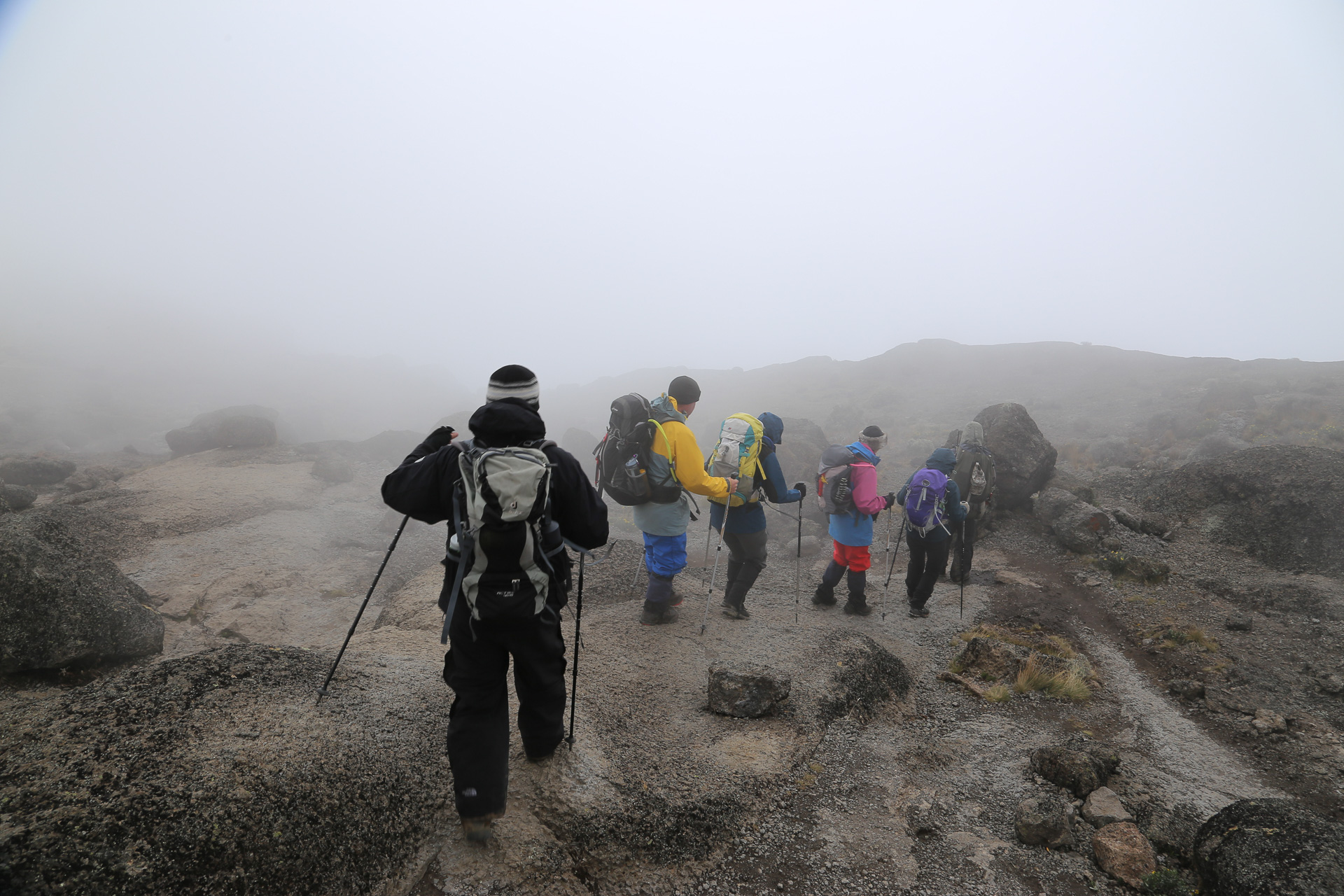 The beautiful moonlit night had been largely unappreciated as each of us focused on the boots of the person in front. Sadly, the much-anticipated sunrise over Mount Mawenzi disappeared as the wind picked up, clouds closed in and snow drove into our already freezing bodies. The white-out conditions meant that we did not even stop for photos at Stella Point.