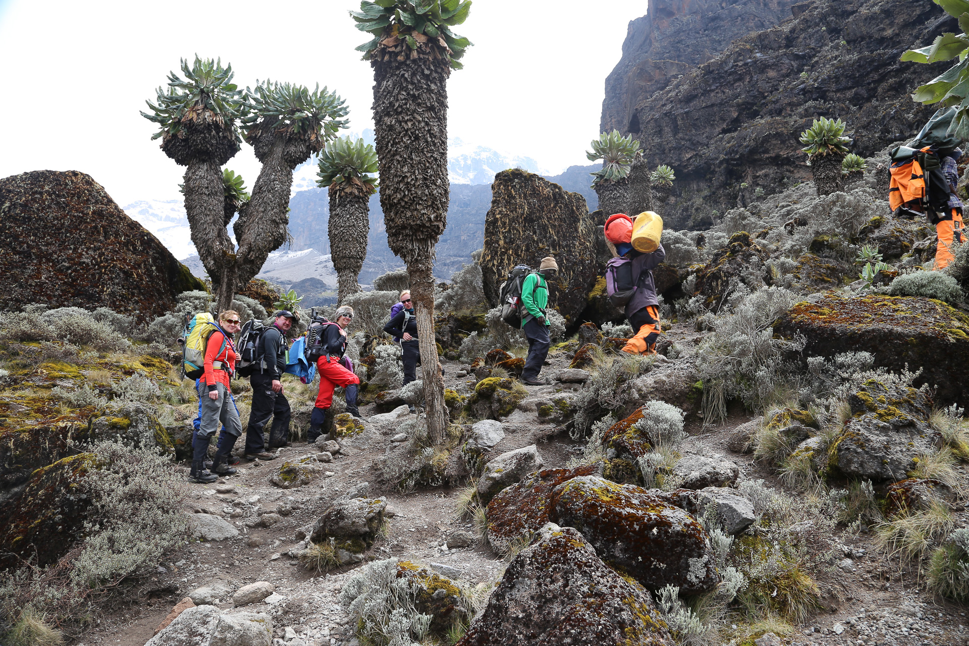 The Barranco Wall includes the famous ‘Kissing Rock’ where the ledge is so narrow climbers are forced to hug the rock as they inch past. It seemed to pose little challenge for the porters though.