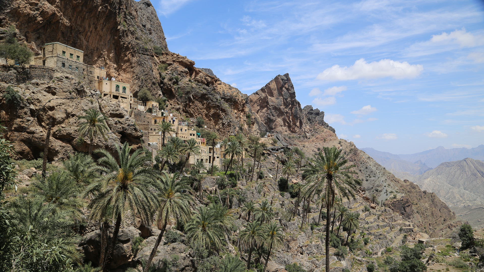 All the directions in our guide book were completely hopeless as a new road is being built and all the road signs have disappeared. Eventually we found the road to the mountain village of Wijmah. Sue thought it was more of a goat track and had the most terrifying drive of her life, steadfastly refusing to let me drive. I thought it was stunning. The road either clung to the cliff face or straddled a ridge. In places it was too steep to see the road over the front of the car. A low ratio crawl for half an hour to reach “the splendid cliffhanger village of Wijmah”.