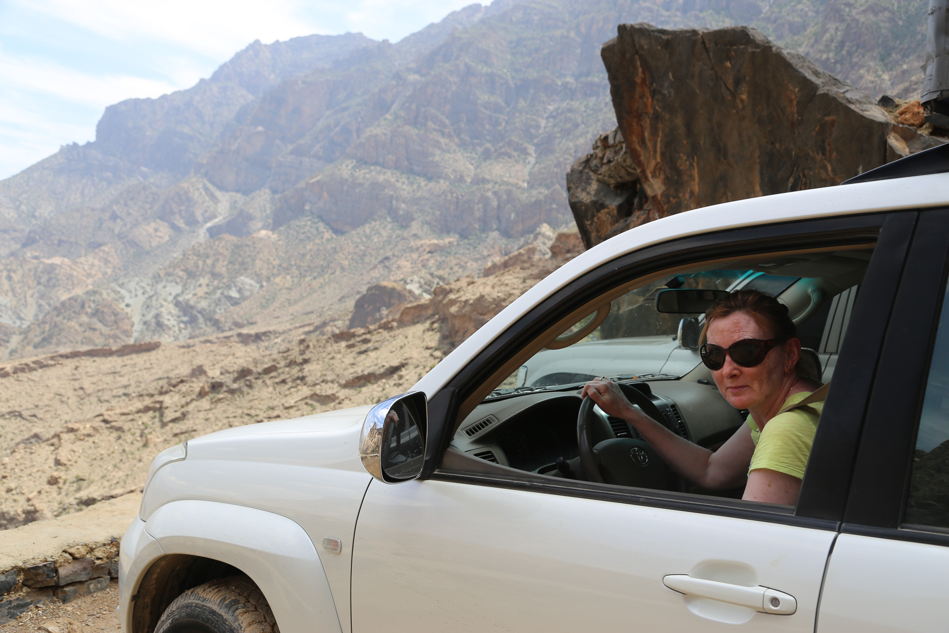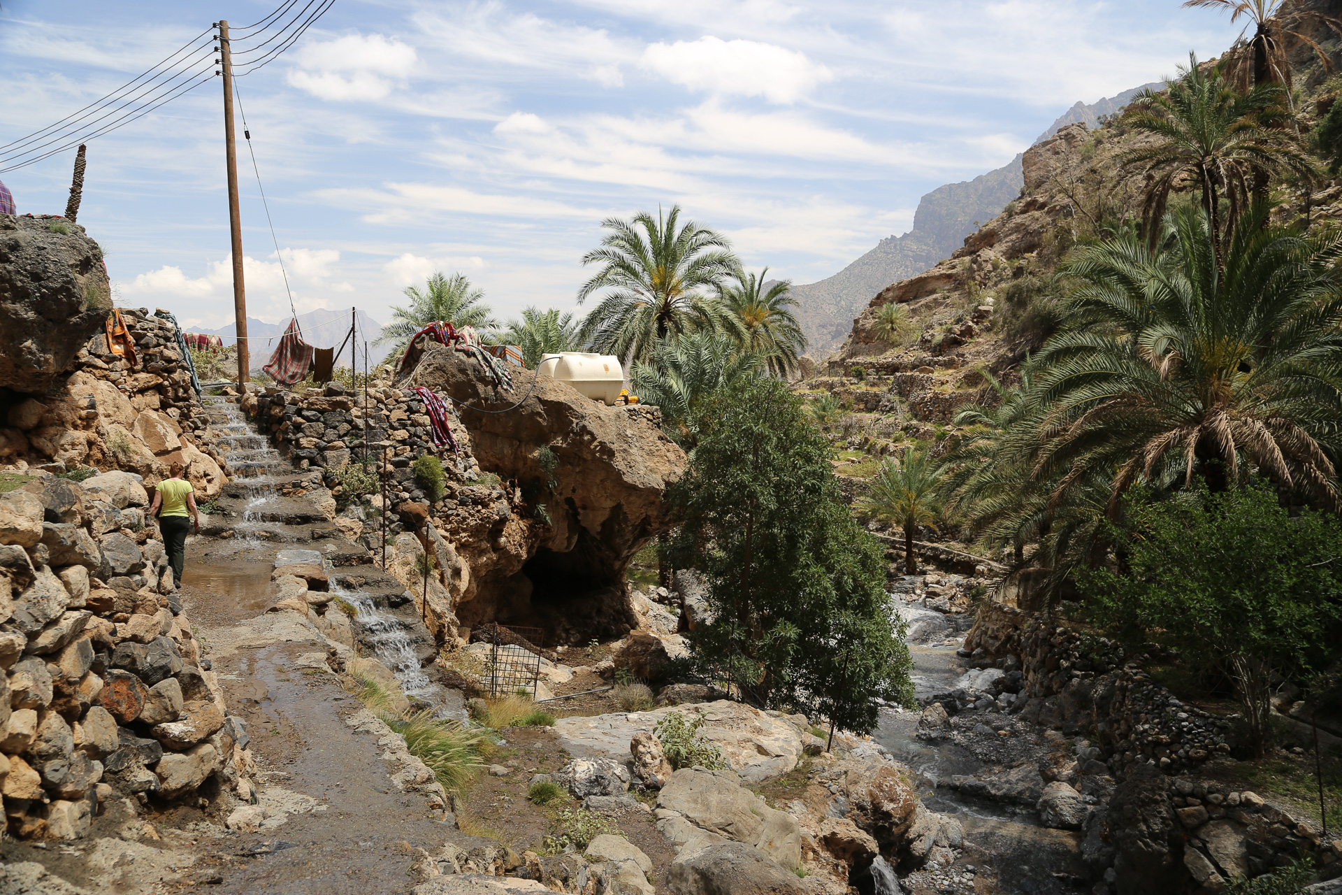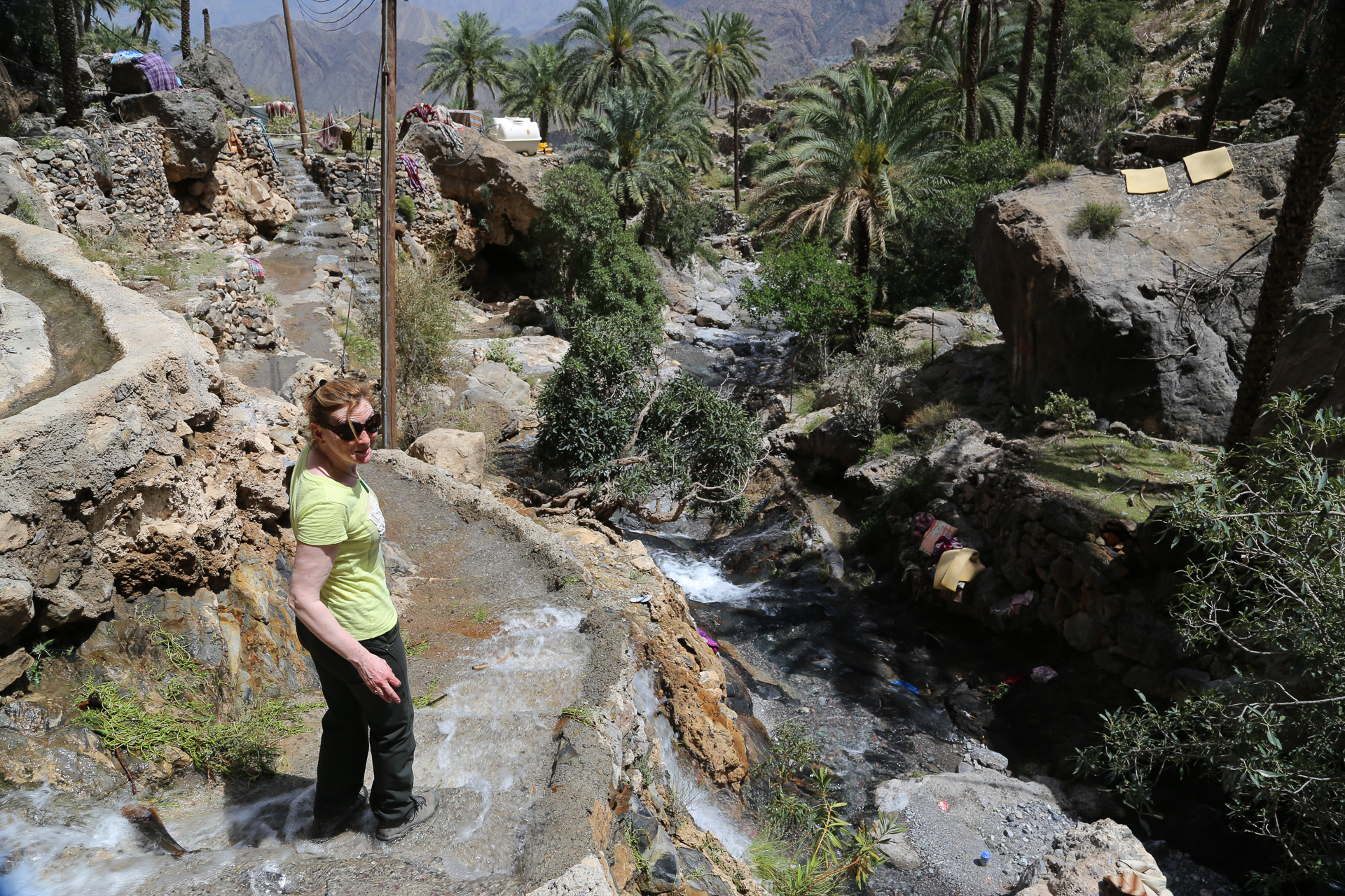 Rain during the week had brought a great deal of water to the mountains – and a fair bit of damage. The road into this area is actually the bed of the wadi so our route in meant driving up the river. All good fun. Sue’s strategy for river driving is to accelerate whenever the water gets deeper. This seems to work well for us but not so well for oncoming traffic. I can still see the look of horror on the face of the kind Omani gentleman in the oncoming vehicle who had stopped to allow us to pass and foolishly wound down his window to wave us through. The bow wave that Sue created as she powered through would have rivalled all but the largest tsunami and the guy in the pure white kandura never stood a chance.