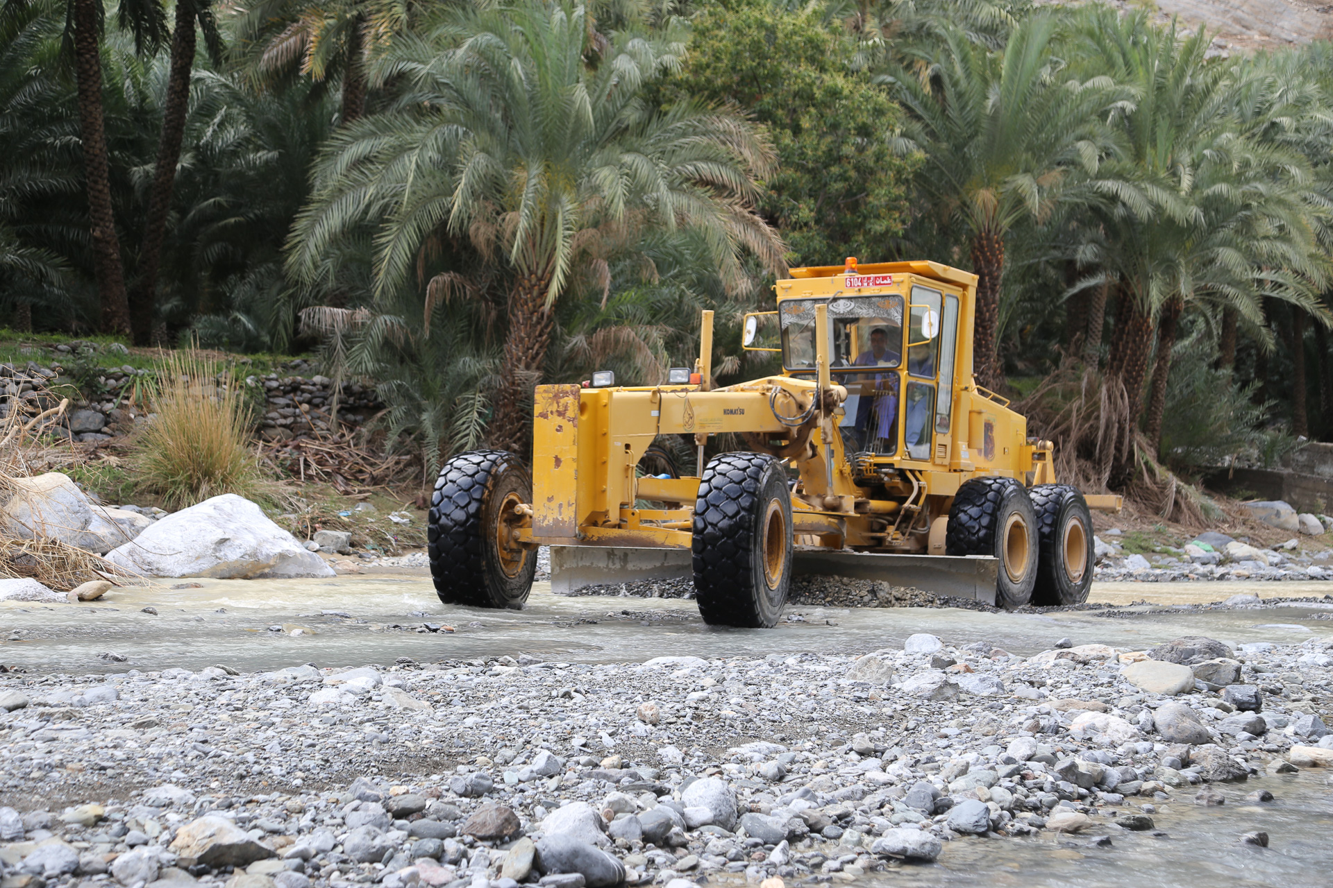 The water had dropped as we left through the wadi later in the day. We stopped for a peaceful lunch under the date palm but were soon joined by the grader obviously making a new road even though it was still submerged.