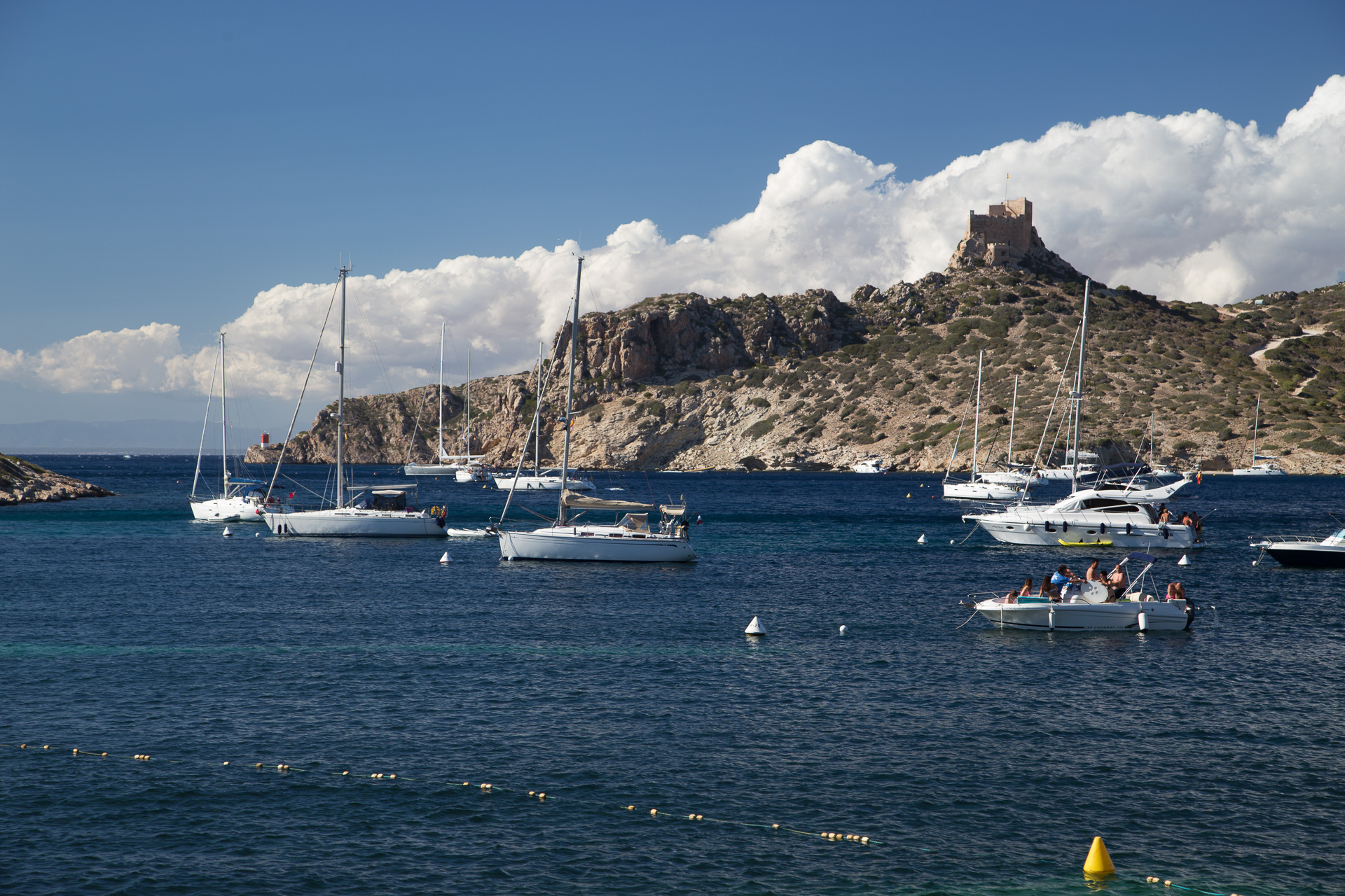 Our destination this evening is a mooring booked at Puerto de Cabrera on the Isla de Cabrera, a marine national park and former Napoleonic prison island, south west of Cabo de Salinas. This is the only mooring we have booked, aiming to anchor in sheltered bays for all other nights.