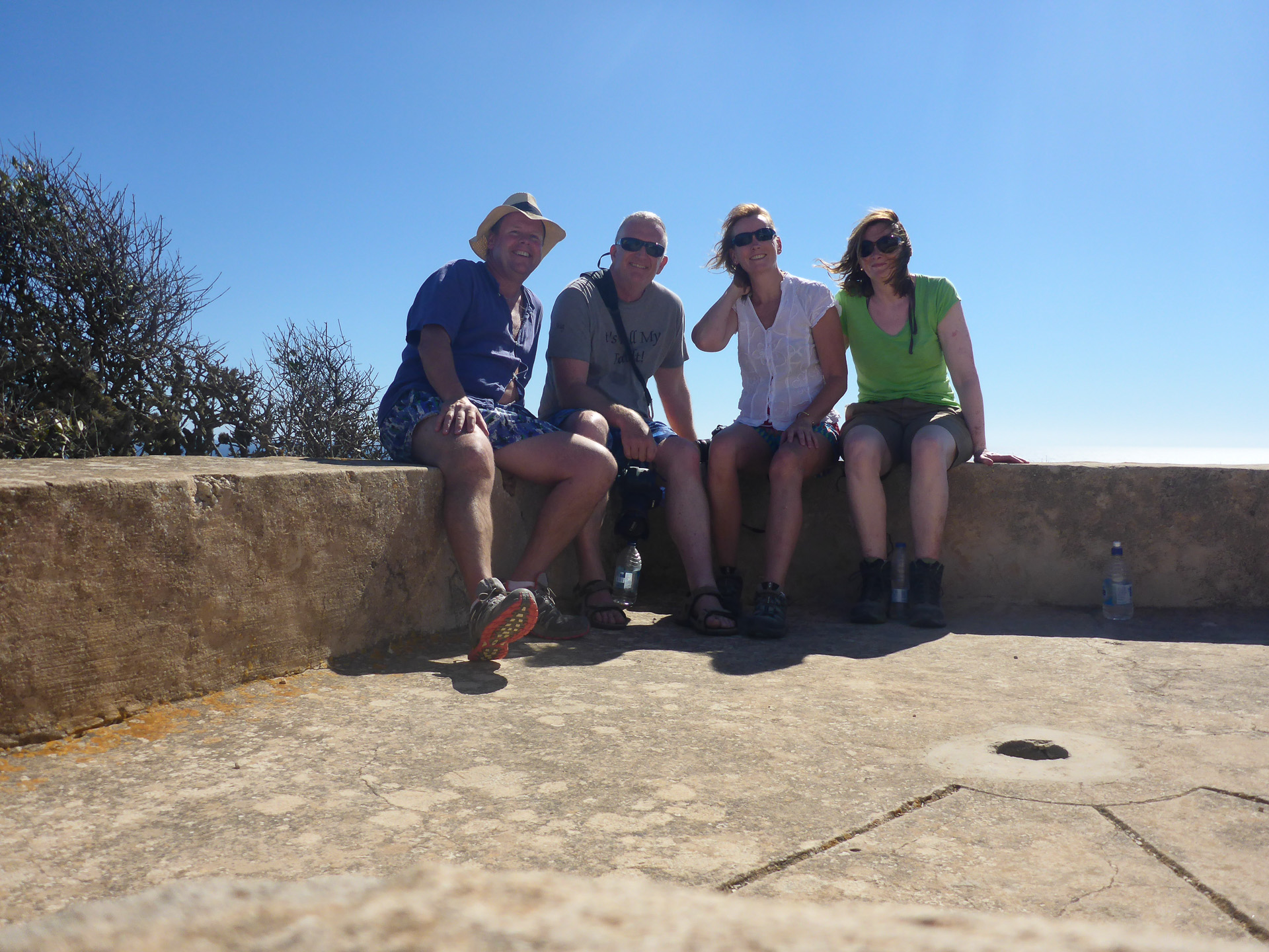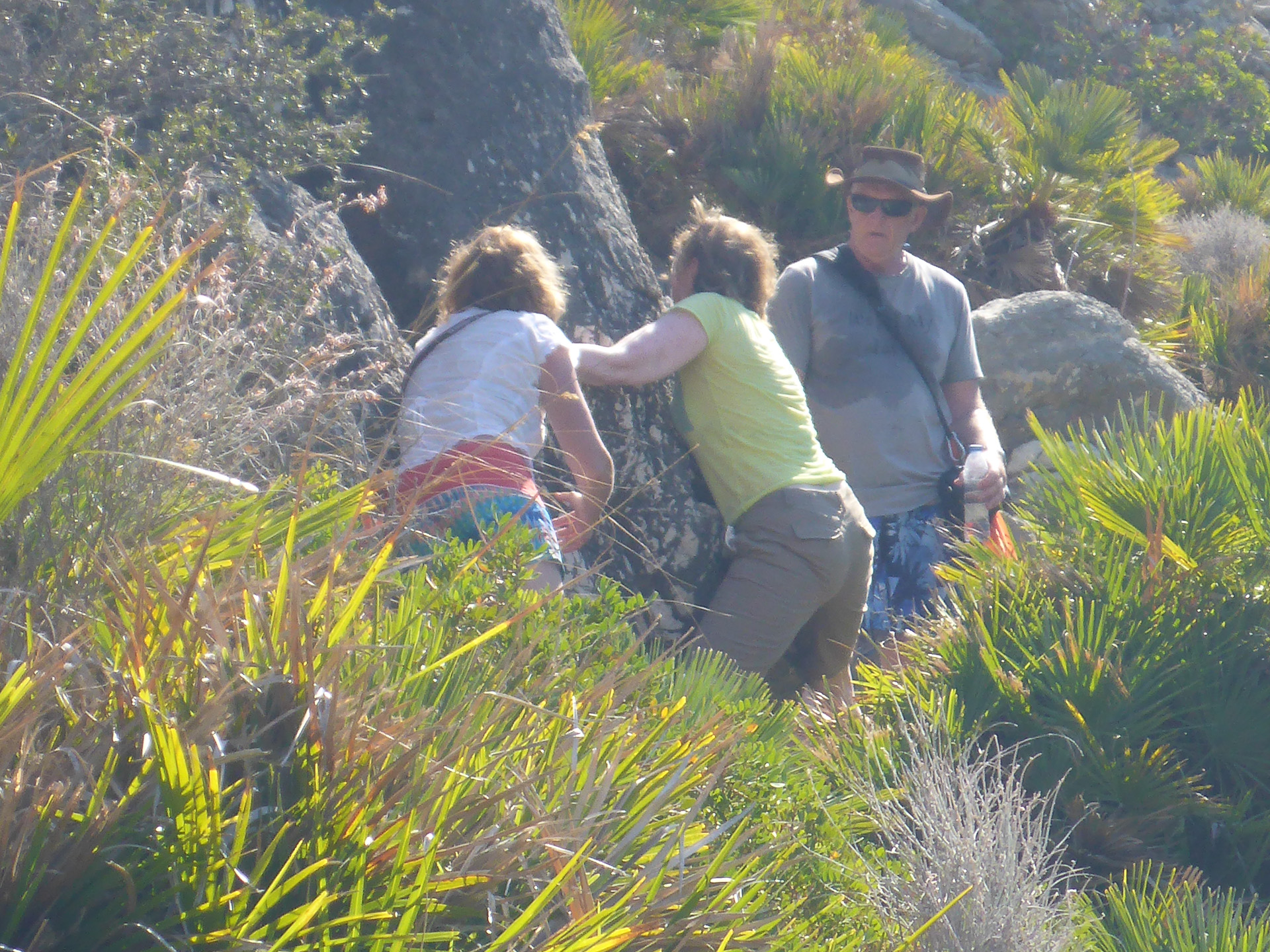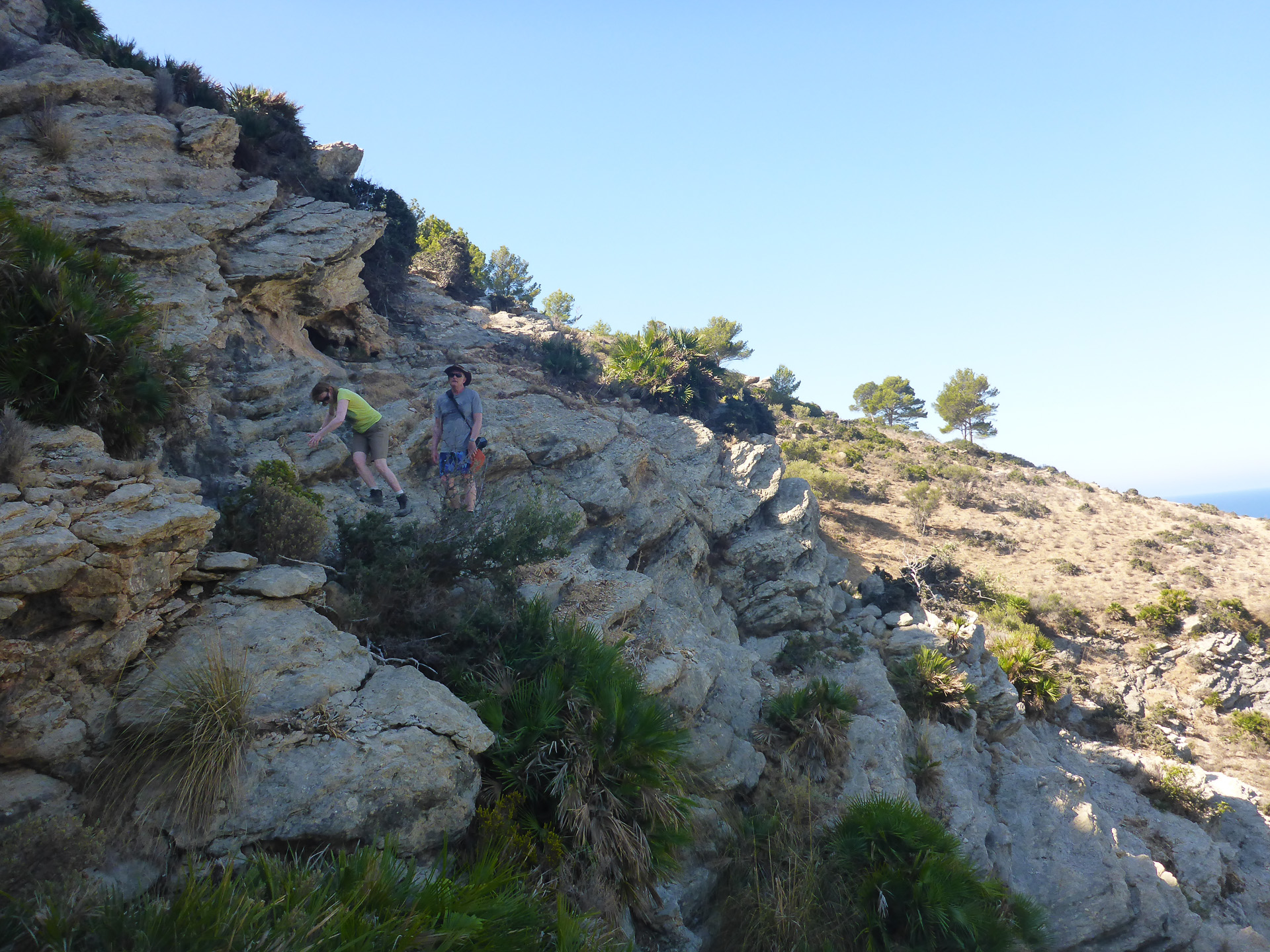 With no map we simply followed a path that ran alongside a dry creek. It took us up a valley and wound its way up the cliff to a good vantage point. On the way back someone thought it would be a good idea to follow a small goat track rather than the easy route we had taken up.