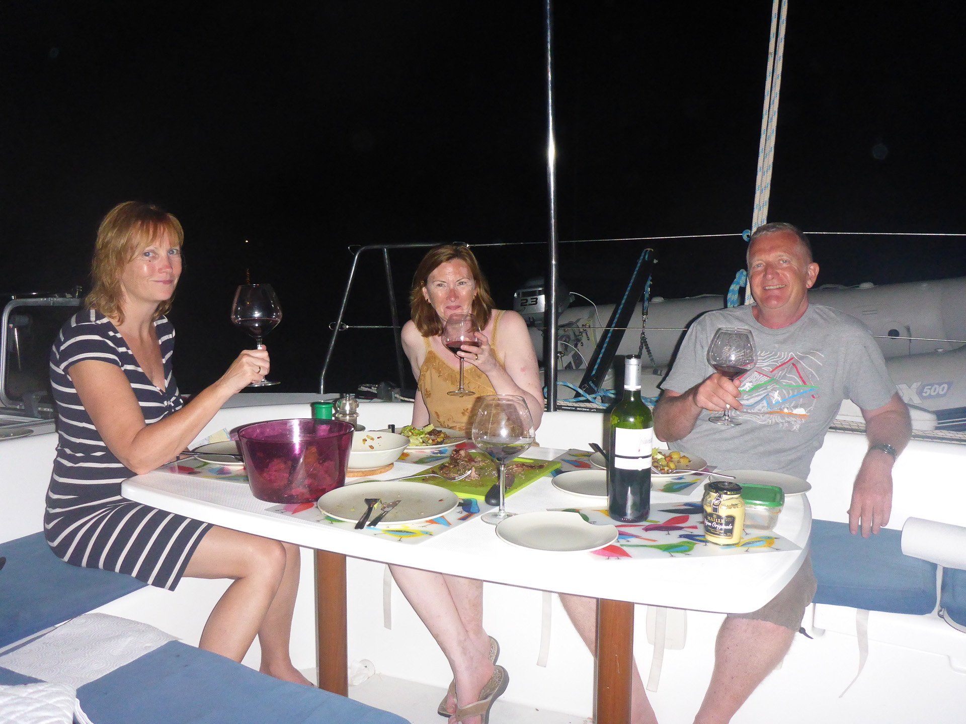 At this stage we realised that this was going to be a competitive week as we vied for the honour of being the helmsman with the top speed. Today it was Sue with 5.1 knots in 12 knots of wind. A few tacks and several man over board practises and we were ready to head back for a champagne celebration and our first dinner on board the boat.