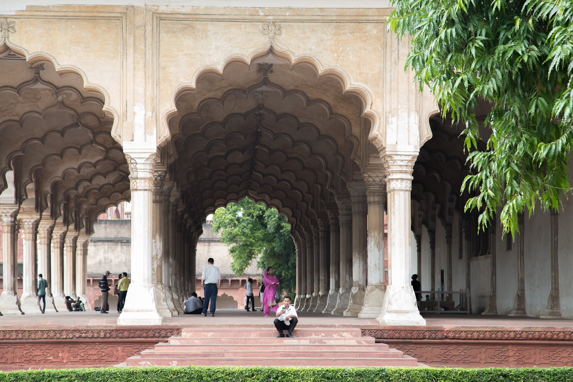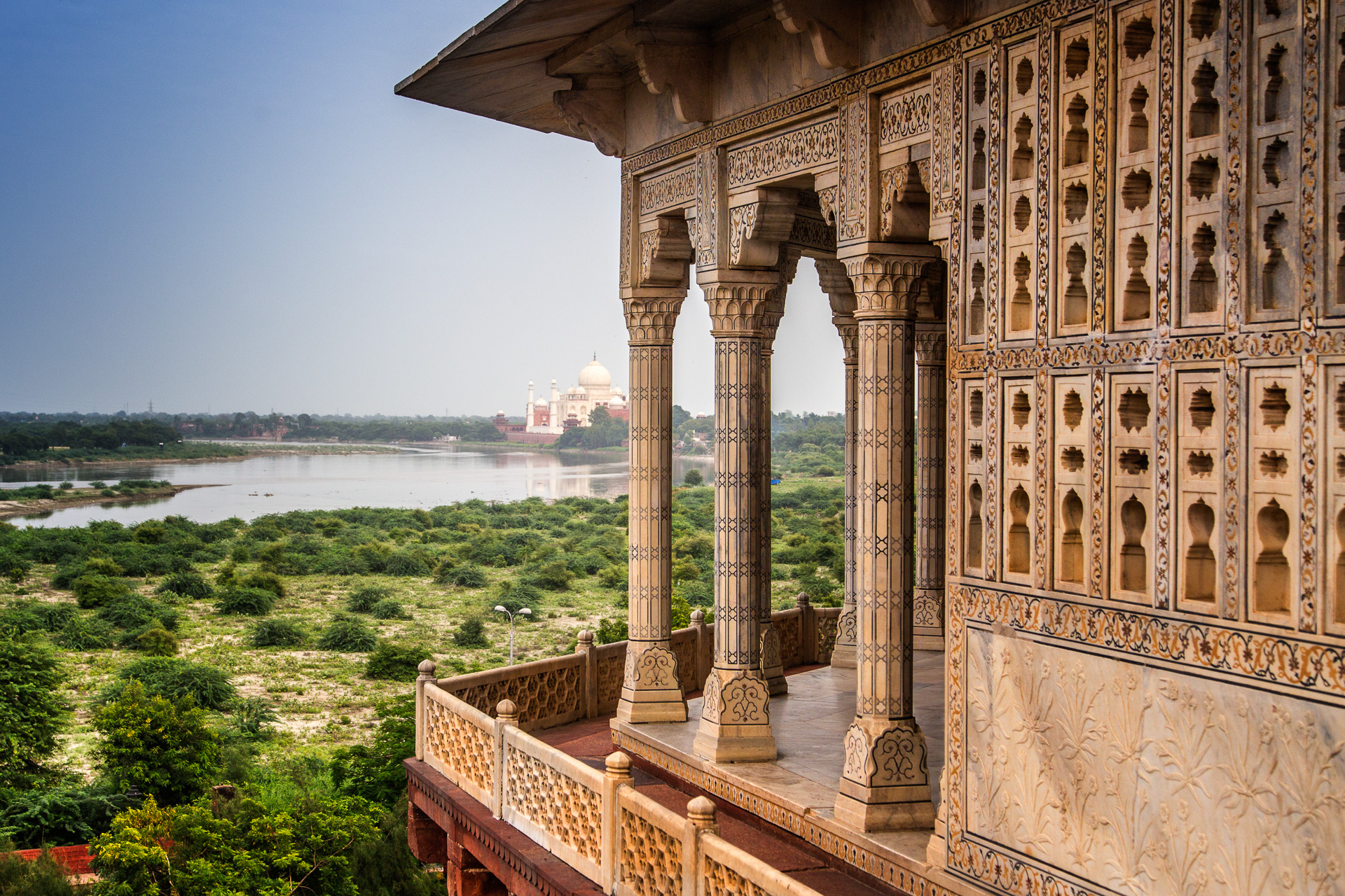 The white marble structure is part of a complex built by Shah Jahan. He ended his days in 1631 in the tower to the left where he was kept under house arrest by his son. At least the balcony gave him a good view of the famous monument that he had built for his wife.