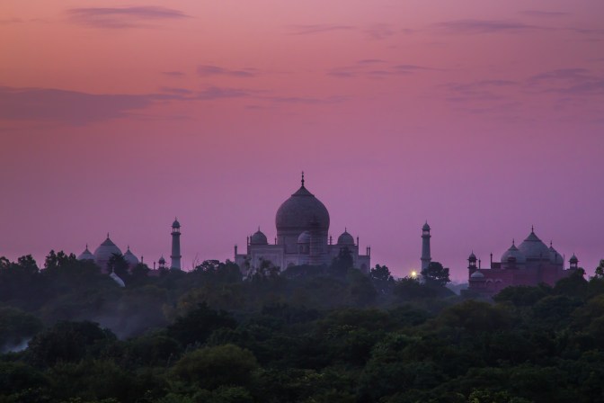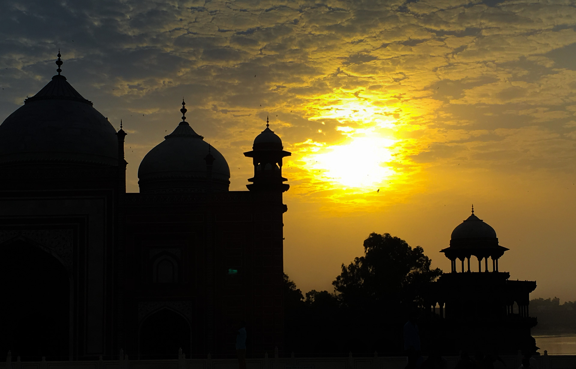 The sunset over the mosque and the Yamuna River bathed the Taj Mahal in a golden light