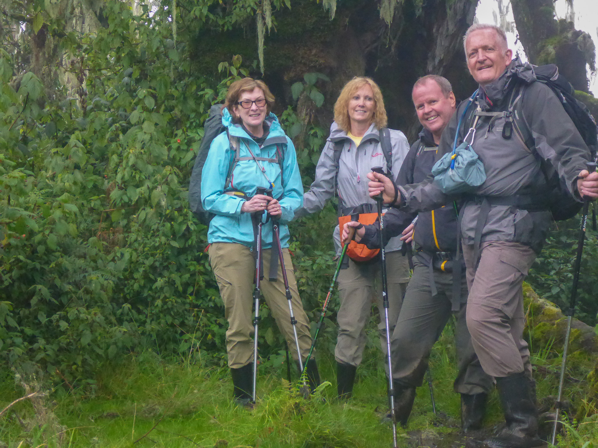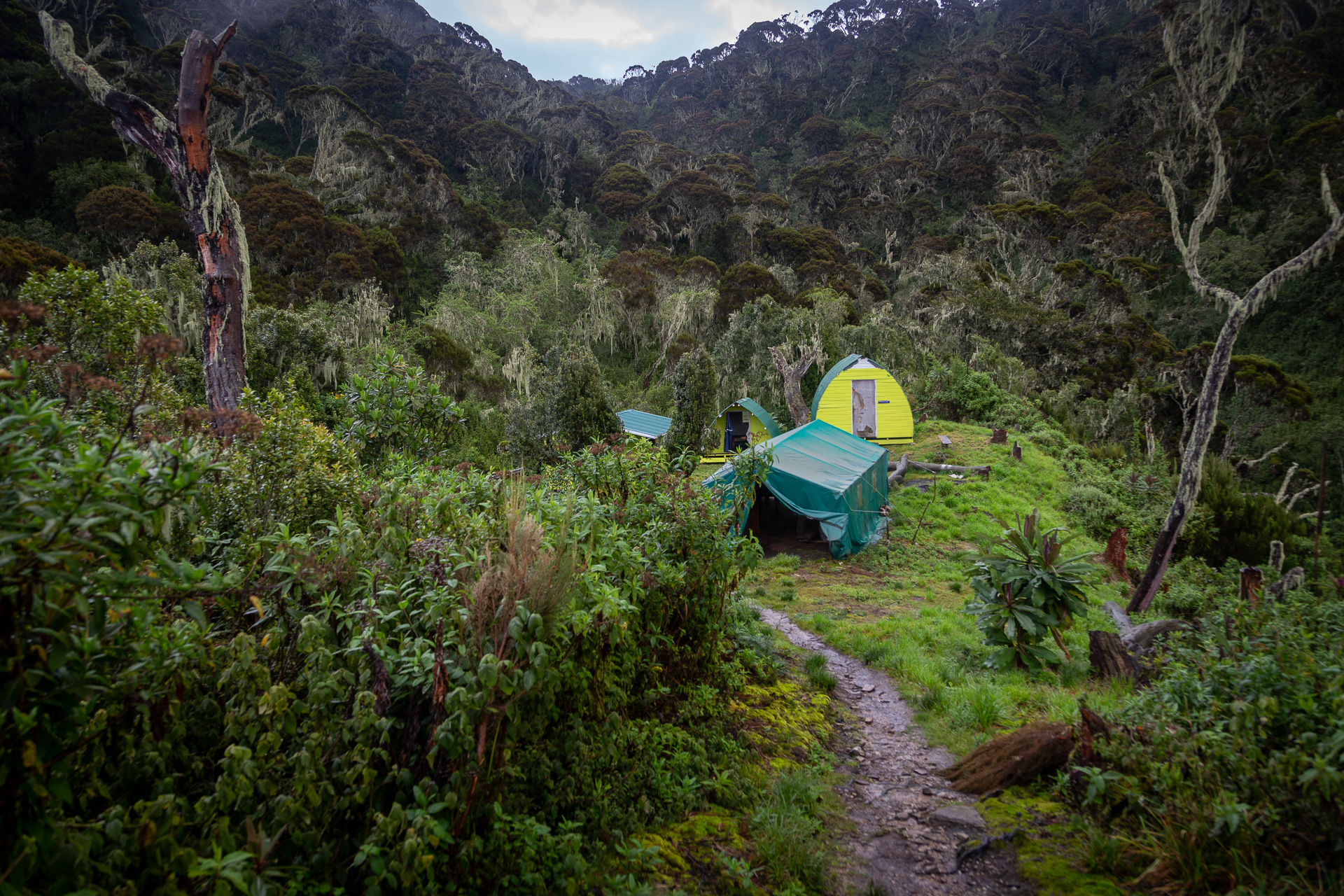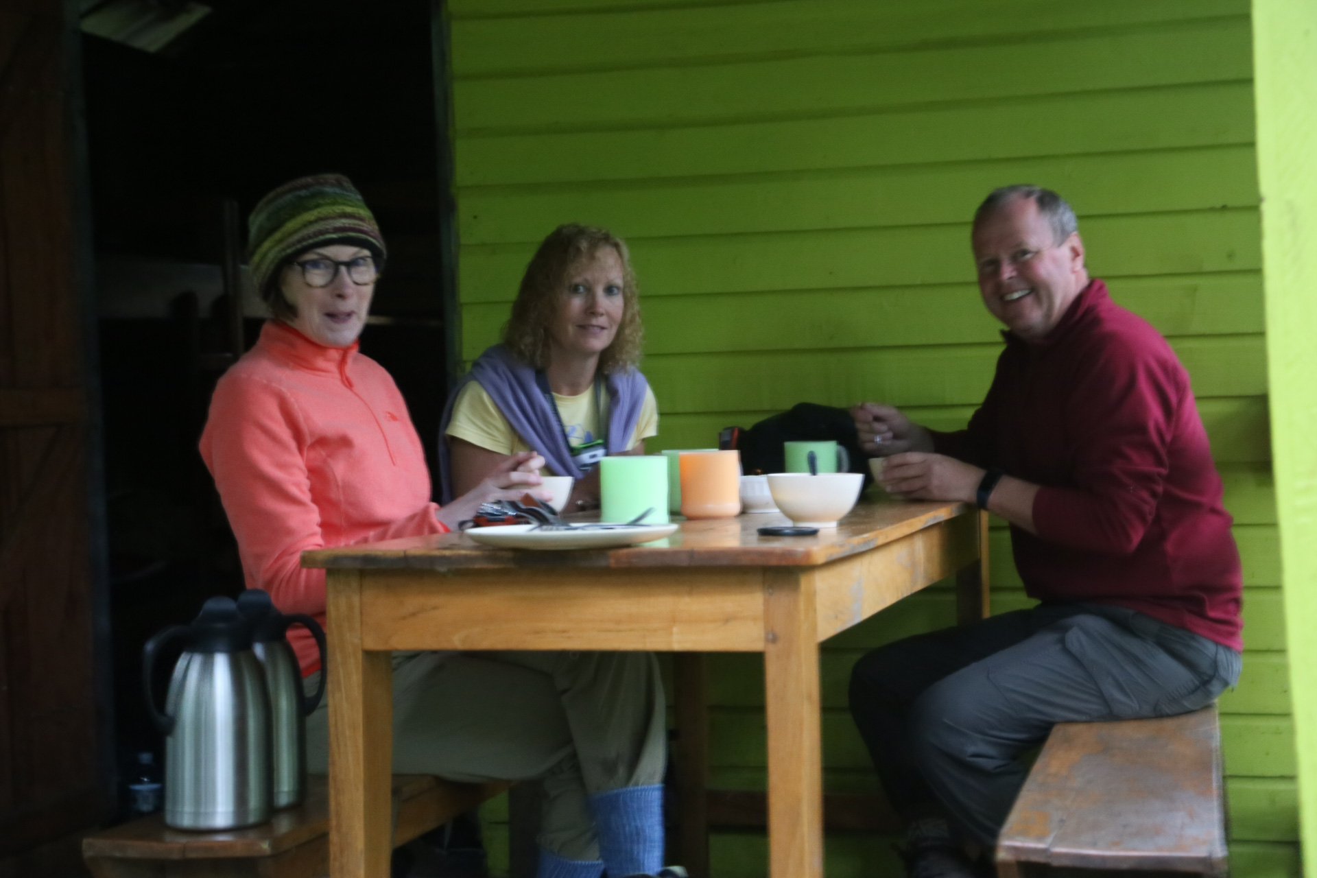 The sun came out briefly just to lure us into removing waterproofs and then the rain returned in the form of a torrential downpour that left our walking pants soaked and our wellies (provided by the trekking company) full of water. So four cold, wet campers spent the evening huddled around a charcoal burner drying socks on walking poles.