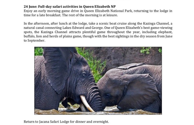 Our itinerary was completely false. Jacana Lodge was so remote that there was never any chance of an early morning game drive unless we left at about 5 a.m. There was certainly no chance of returning for breakfast, having a leisurely morning and then heading off to the Kazinga Channel. So we were out all day and ended up wishing that we had simply stayed at the lodge and enjoyed its surroundings.