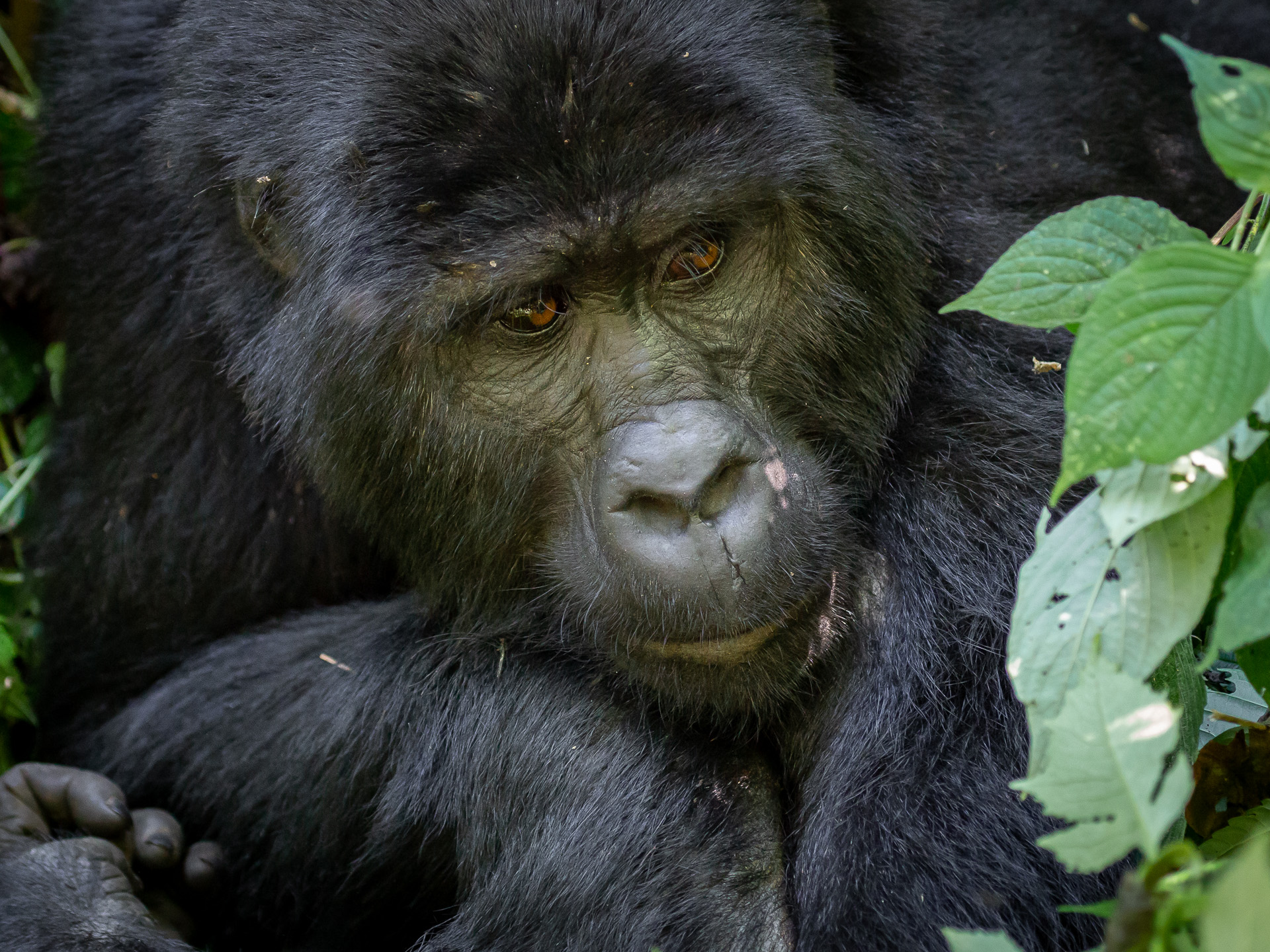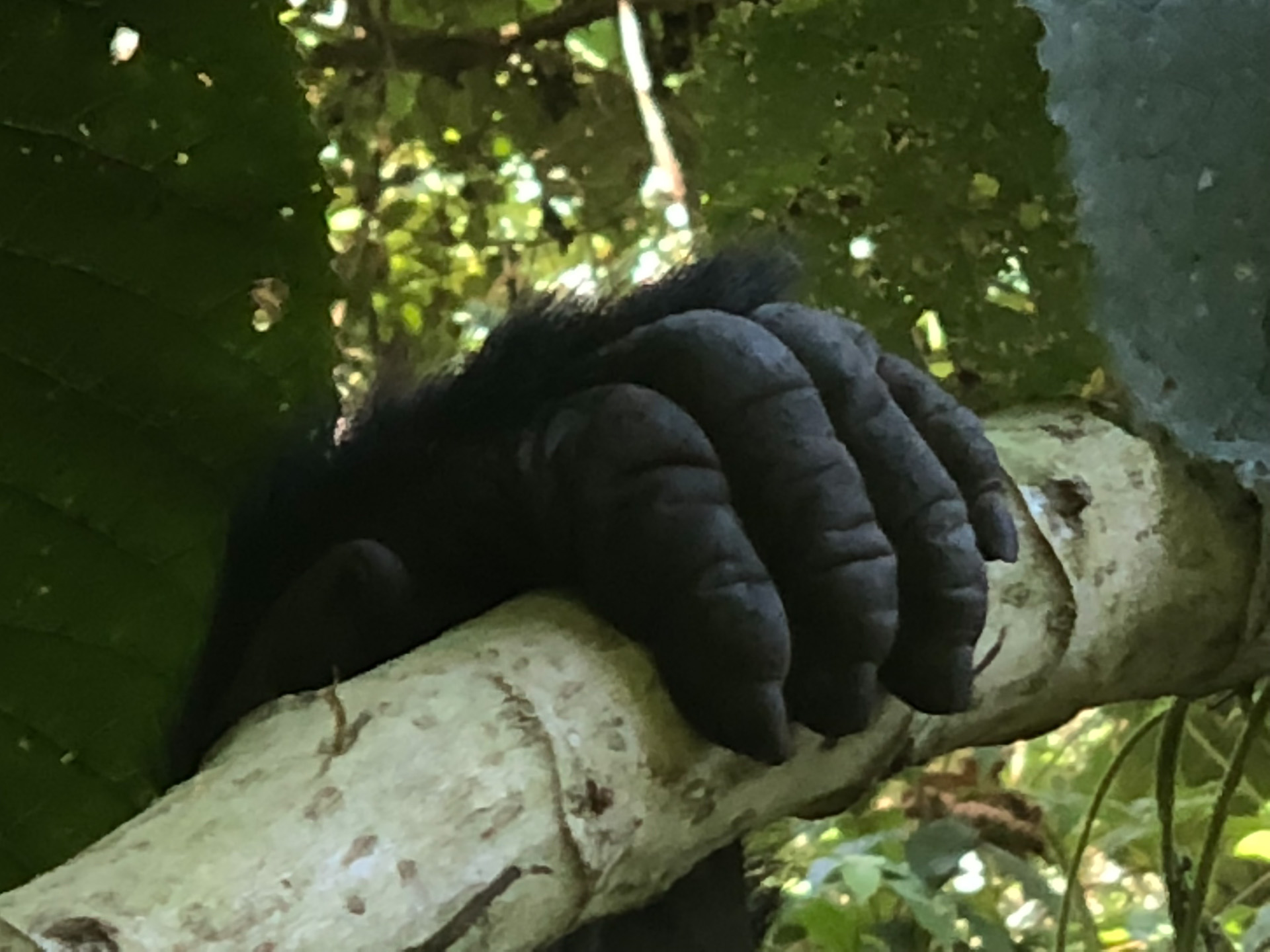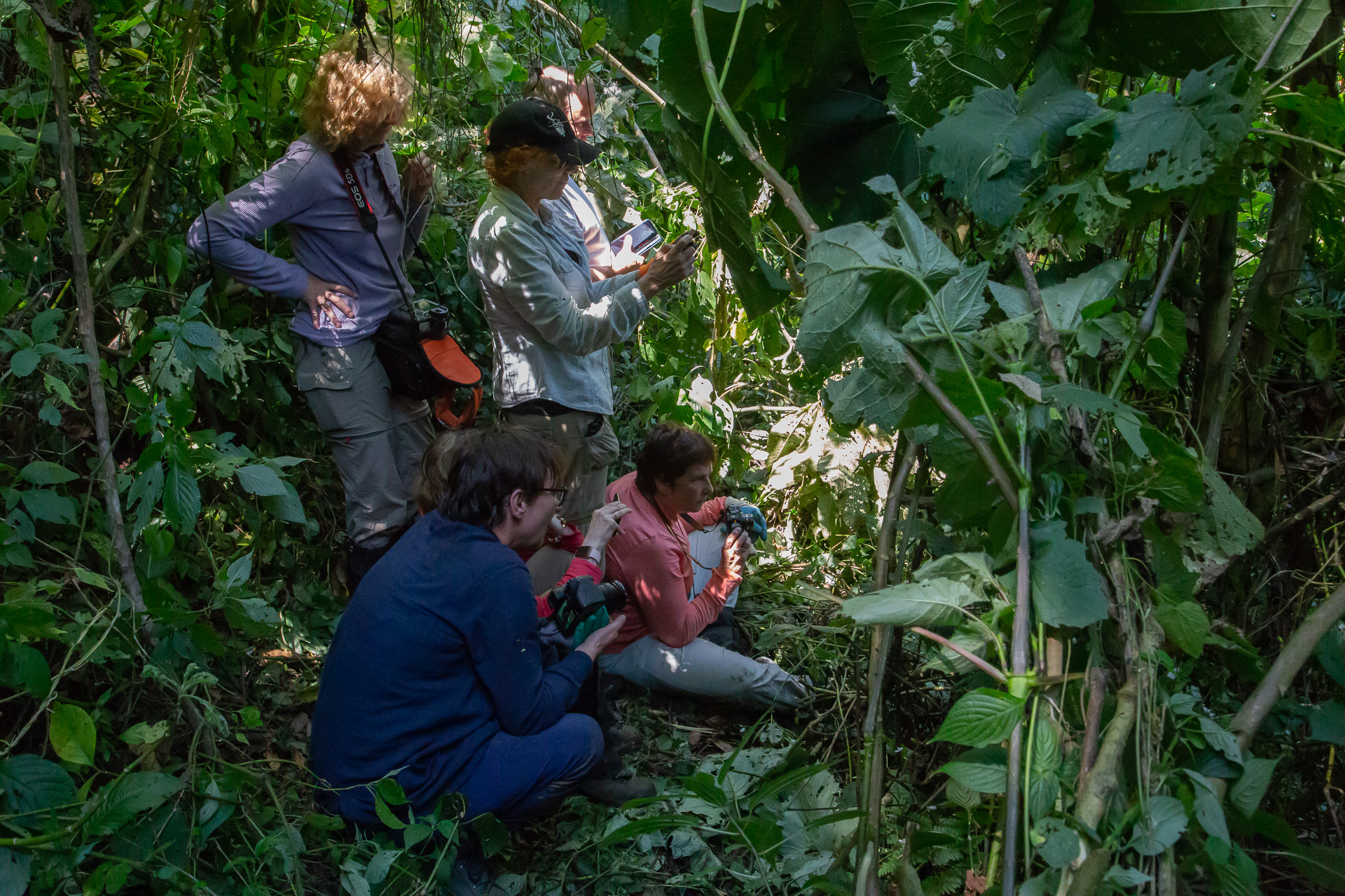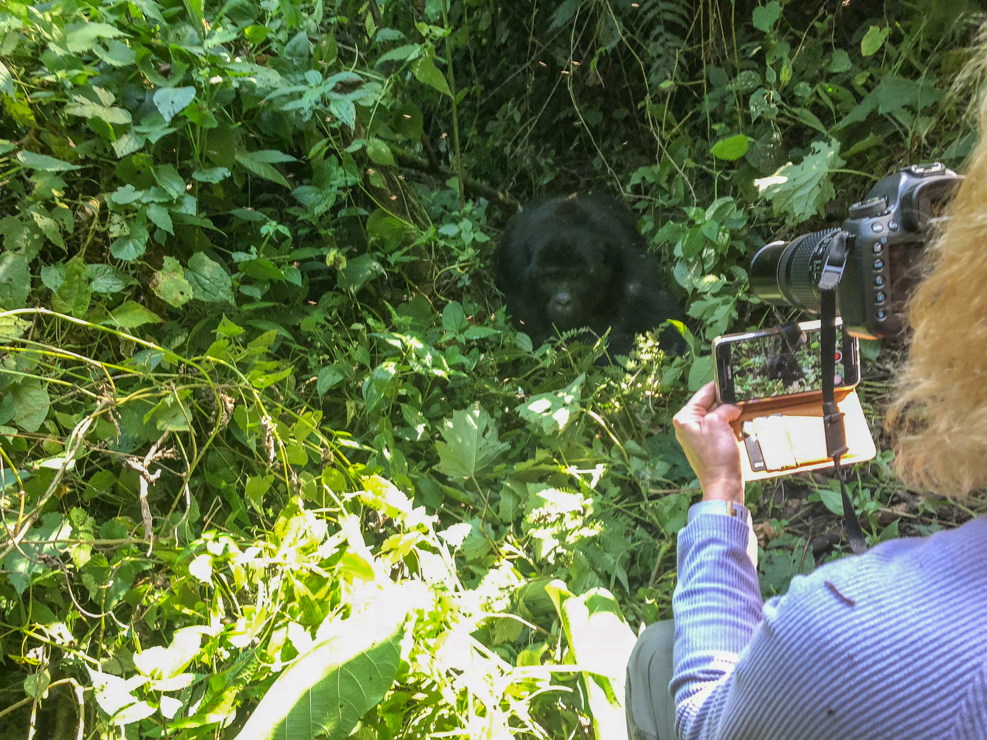 We were so close that one curious female gorilla reached out and touched the shoe of one of our group. Moments later Claire had to pull her camera out of the way as the same female hurried past to join the silverback. All guaranteed to raise our heart rates.