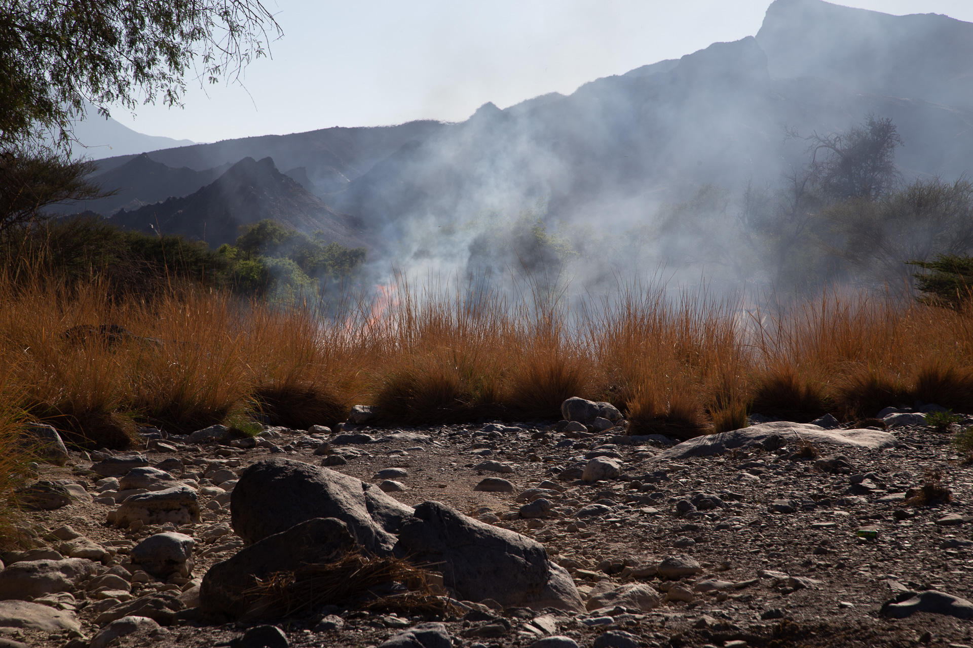 Finally, as we were leaving the wadi we were blocked by burning grass. We were able to climb out of the wadi and pass by easily enough but it was throwing out an impressive amount of heat. We think that they were burning of dead grass so that there would be new growth for the goats to eat. But that is pure speculation.
