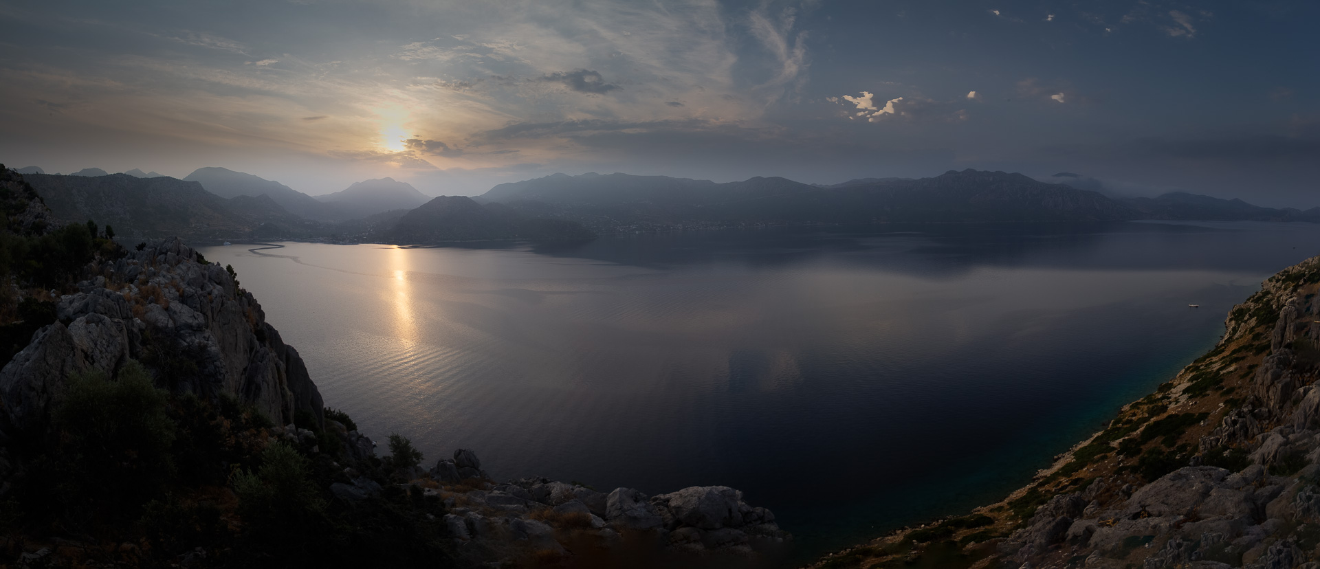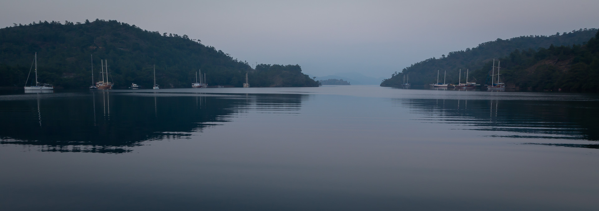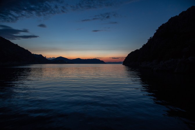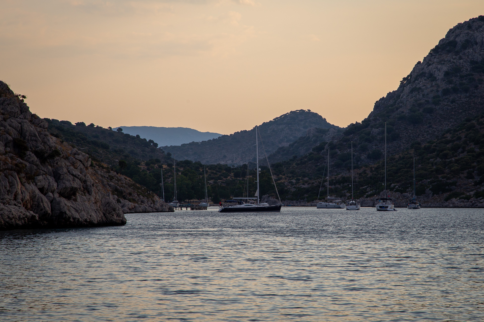 After a magical day’s sailing we anchored in Serçe Limanı. All of the guidebooks urged yachts to tie up at the wharf by Captain Nemo’s restaurant. This was free of charge if you eat at Captain Nemo’s. With fresh fish on board and any number of very capable chefs (that’s everyone except Nigel), we opted to anchor in the southern end of the bay and copy and paste from yesterday “beautiful sunsets and fabulous meal”.