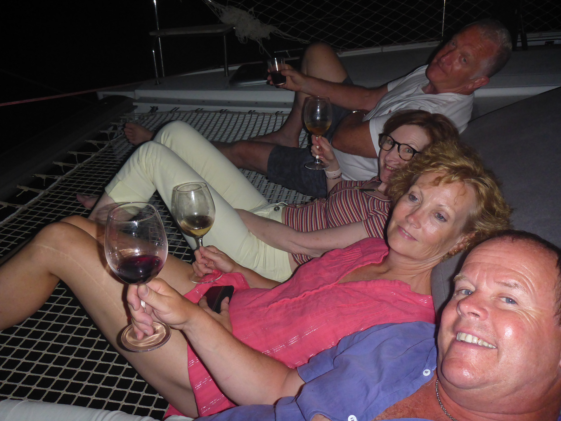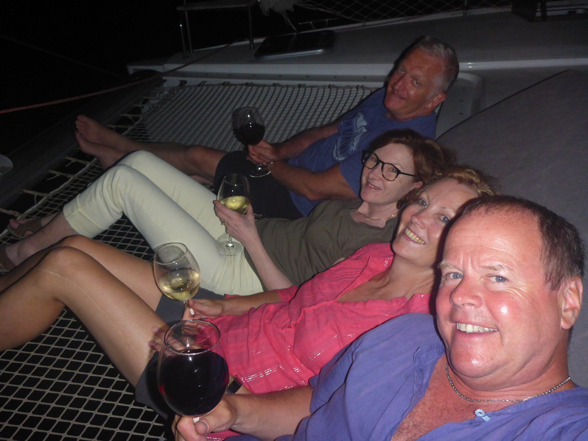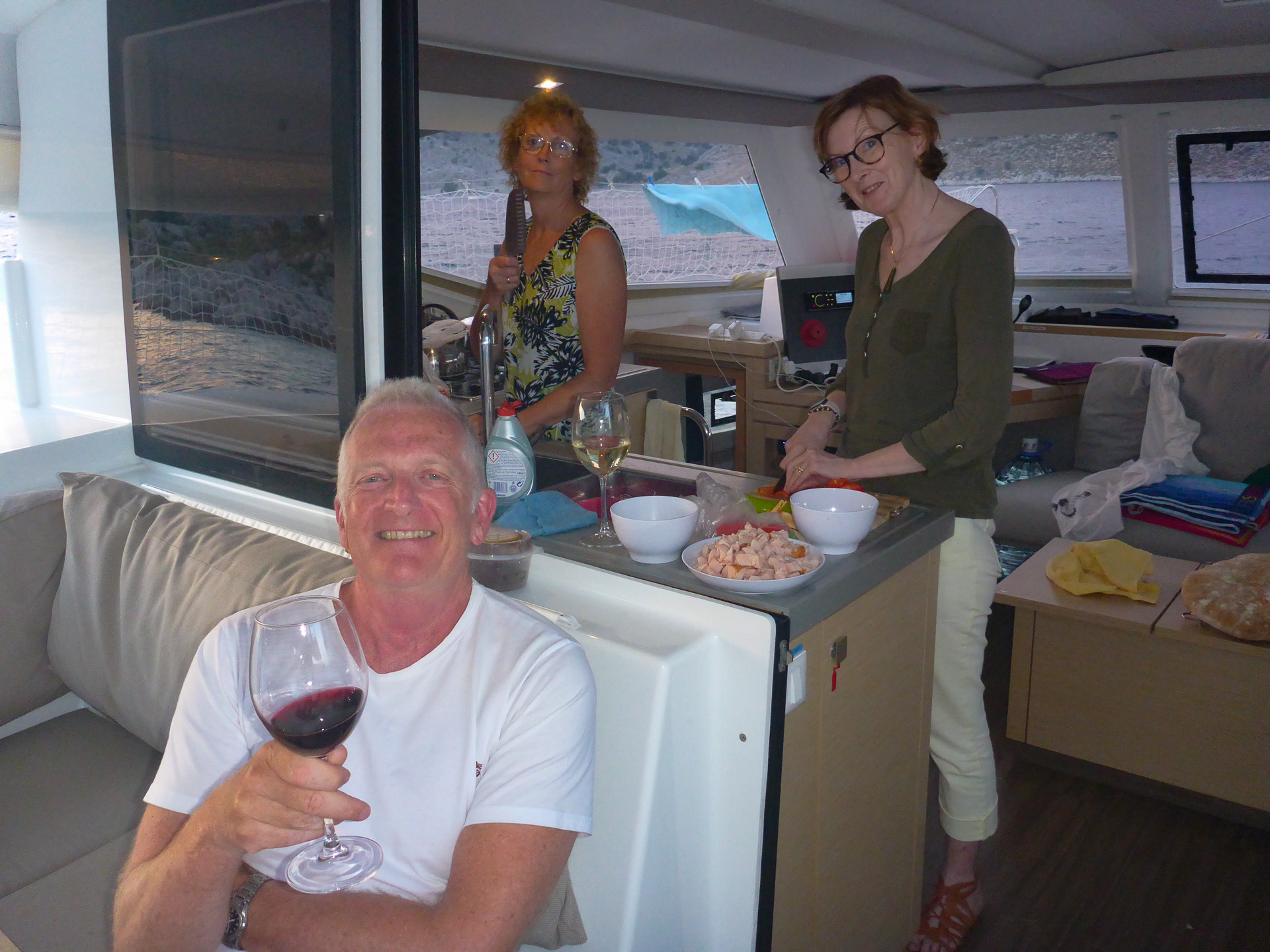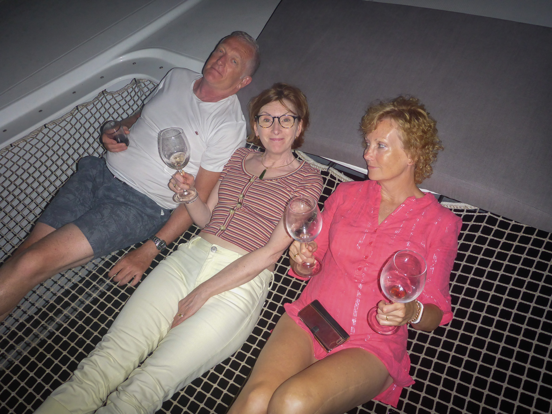 We found a perfect spot. We were totally sheltered from the north-westerly and as long as the wind did not back to the south we would be fine. Just to be sure we put out a stern line from each hull to keep the boat centred in our tiny cove. The forecast was for the wind to veer more northerly so we knew we would have a fabulous last night. Cue the sunset, delicious meal and late night drinks on the trampoline to enjoy the breeze. And so to bed…