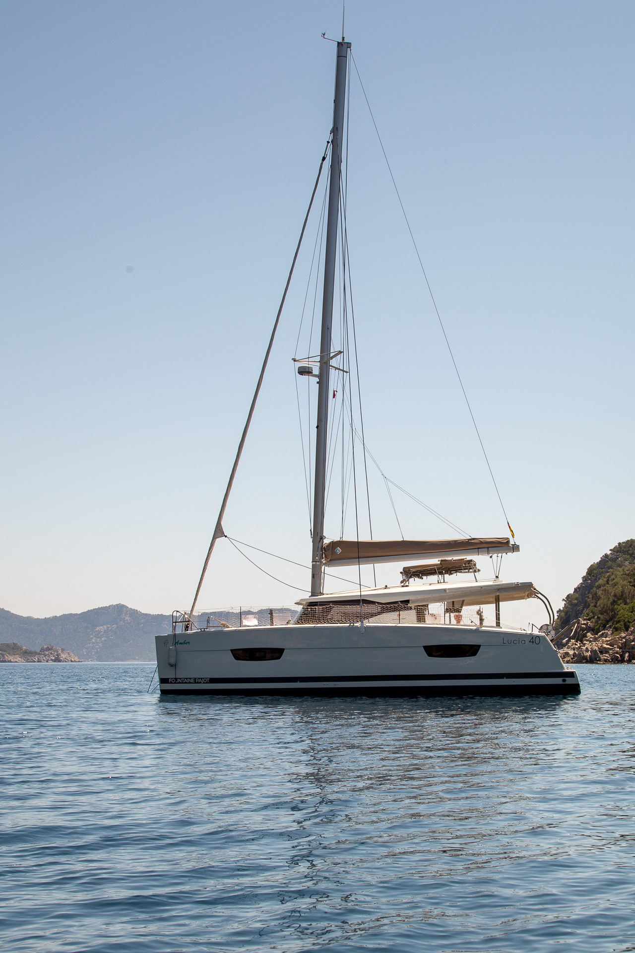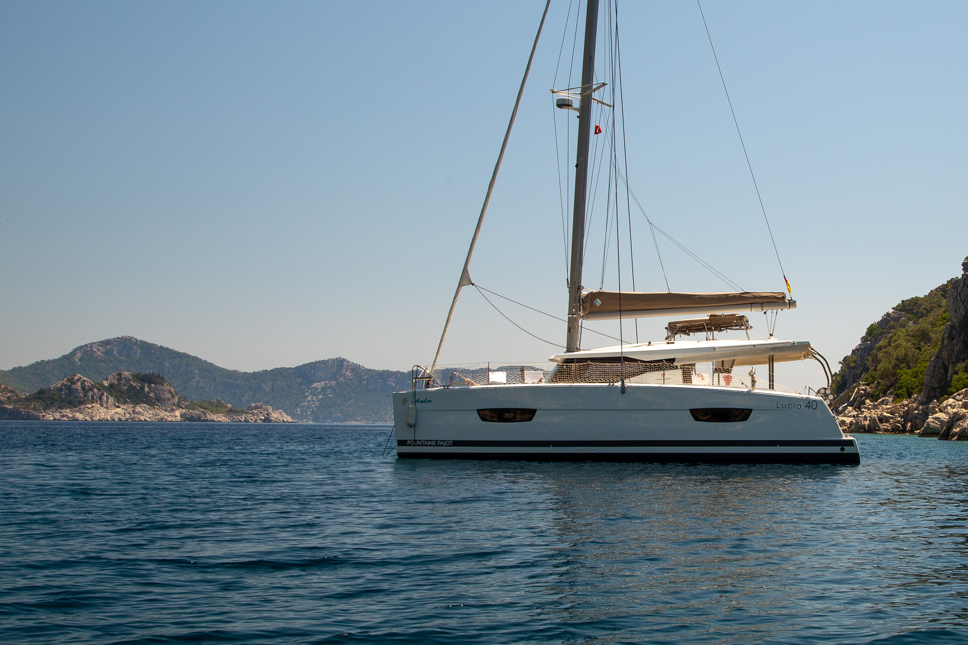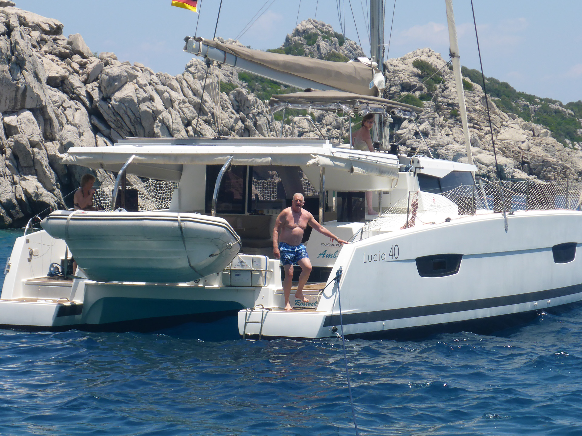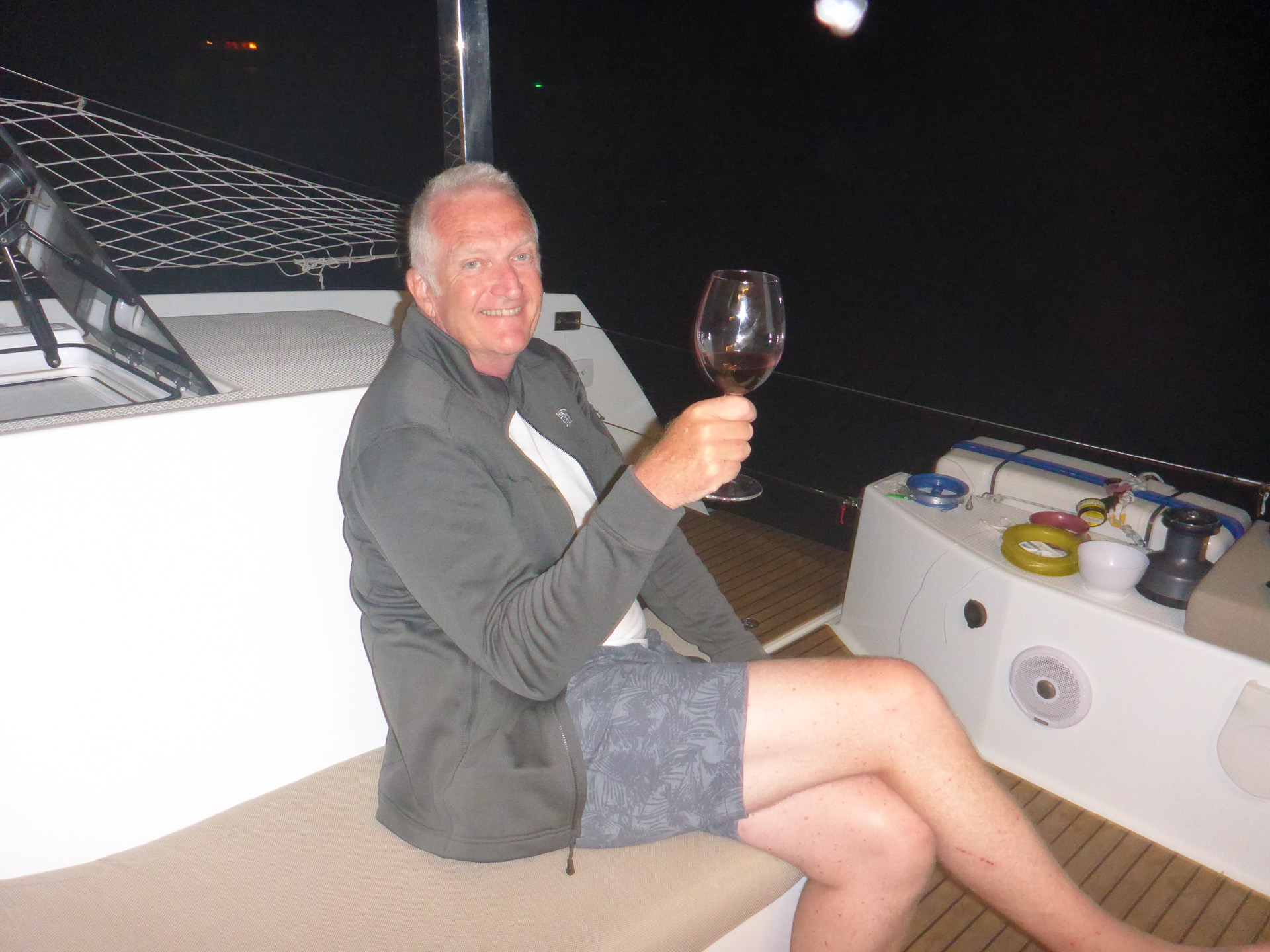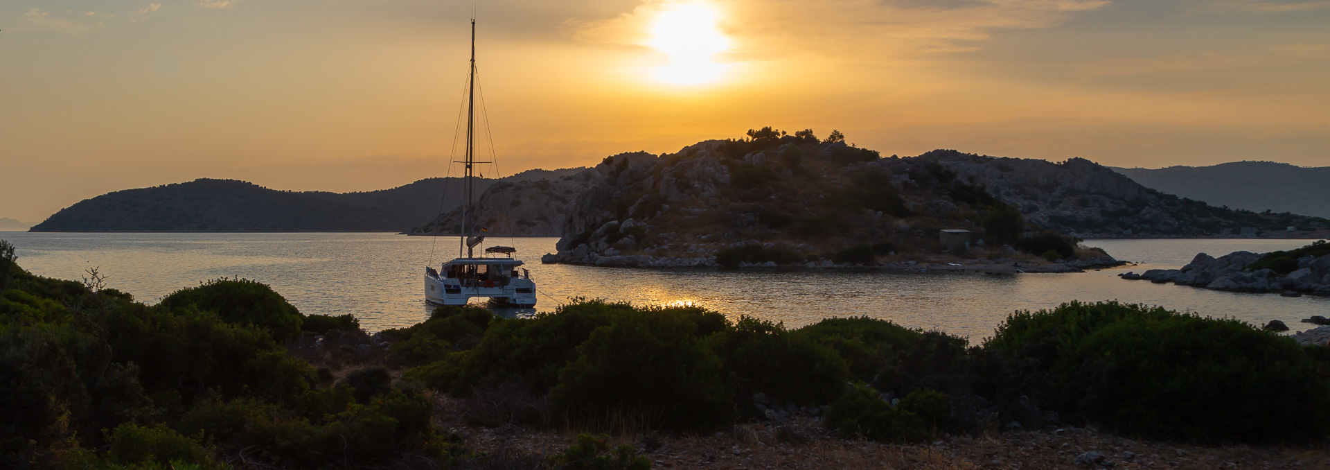 We found a perfect spot. We were totally sheltered from the north-westerly and as long as the wind did not back to the south we would be fine. Just to be sure we put out a stern line from each hull to keep the boat centred in our tiny cove. The forecast was for the wind to veer more northerly so we knew we would have a fabulous last night. Cue the sunset, delicious meal and late night drinks on the trampoline to enjoy the breeze. And so to bed…