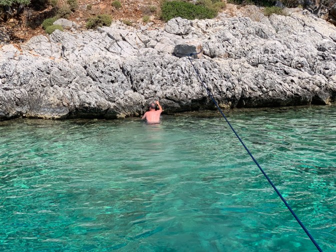 Our plan for today was to find tiny anchorage behind a large rock called Arap Adasi. We knew that we could only stay overnight if the sea was calm. We couldn’t spot the islet and were not convinced that it would be a safe place to stay so headed back Gebekse Bay where we had spent the first night.