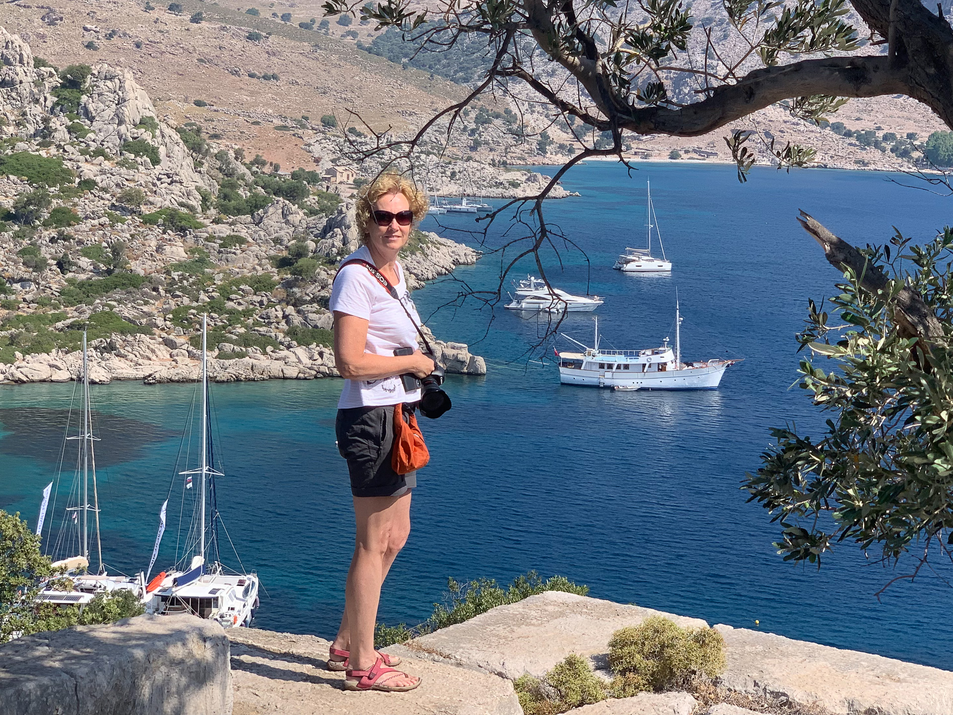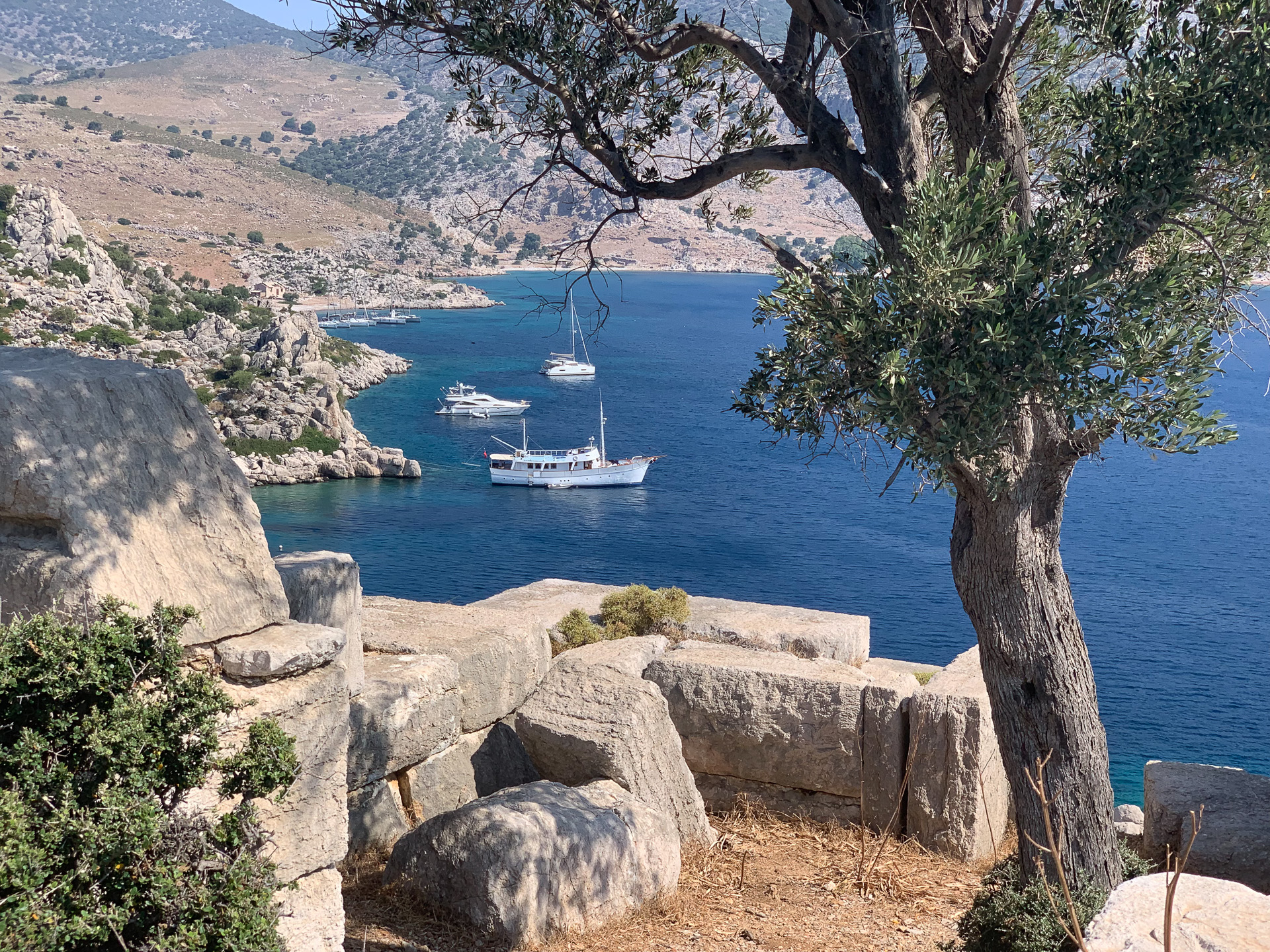 From now on we are retracing our steps back to Marmaris but we had no intention of staying in the same anchorages. Today we spent the morning tacking our way upwind in anticipation of a fast-downwind sail through the channel separating the Marmaris Peninsular from the Greek island of Simi. We had no sooner made our turn downwind when the wind dropped to zero and we ended up starting engines.