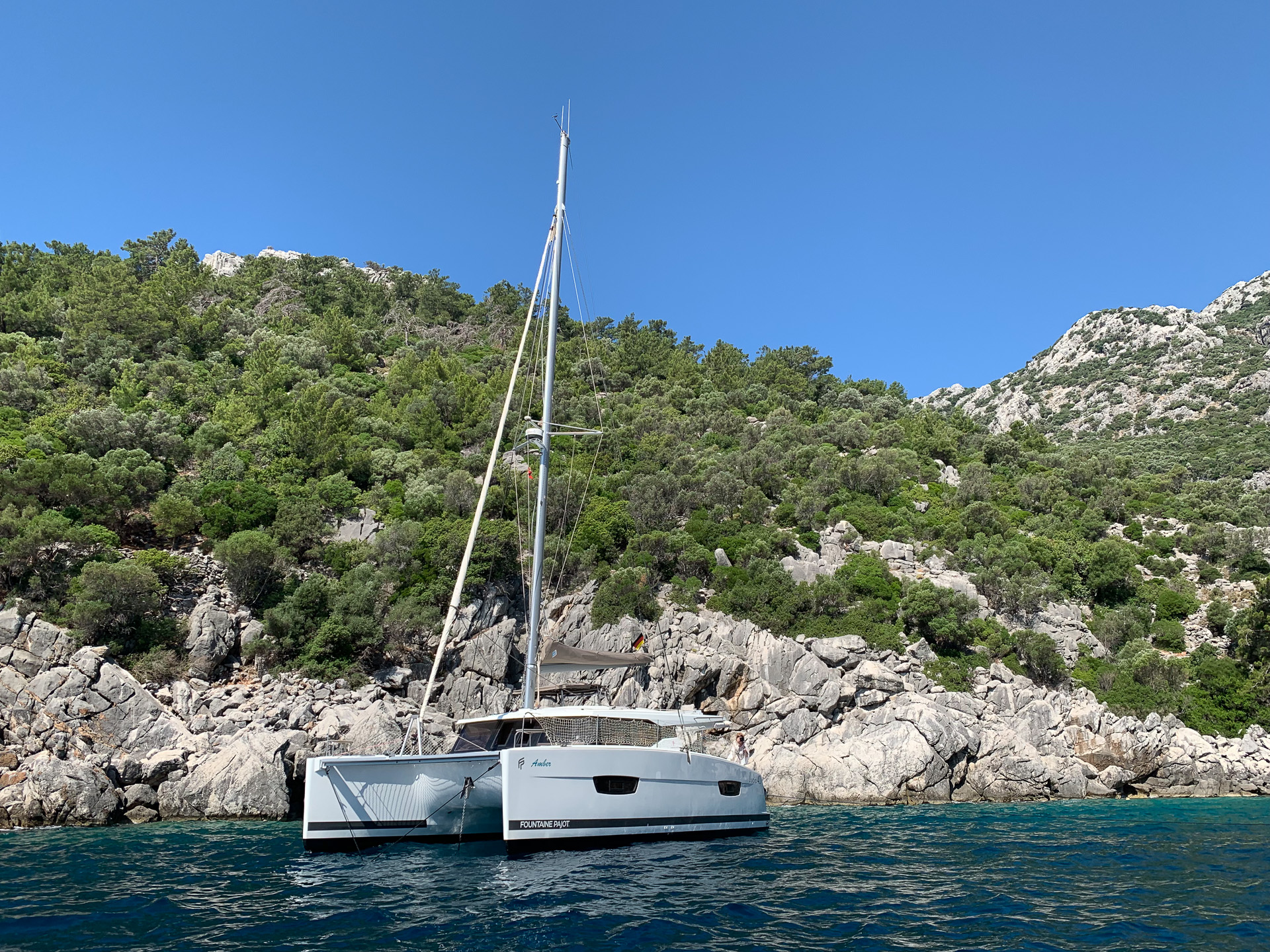 Catamarans have a very shallow draught, which meant that we were able to secure ourselves in a very secluded spot well away from the ‘big boys’. Hills surrounded us on three sides and we were protected from westerlies by the island of Kizil Ada and from south-westerlies by the smaller island of Zetin Adasi. Google translate confirmed that Ada means island but it gave up on ‘adasi’. We assume that it means small island or islet.