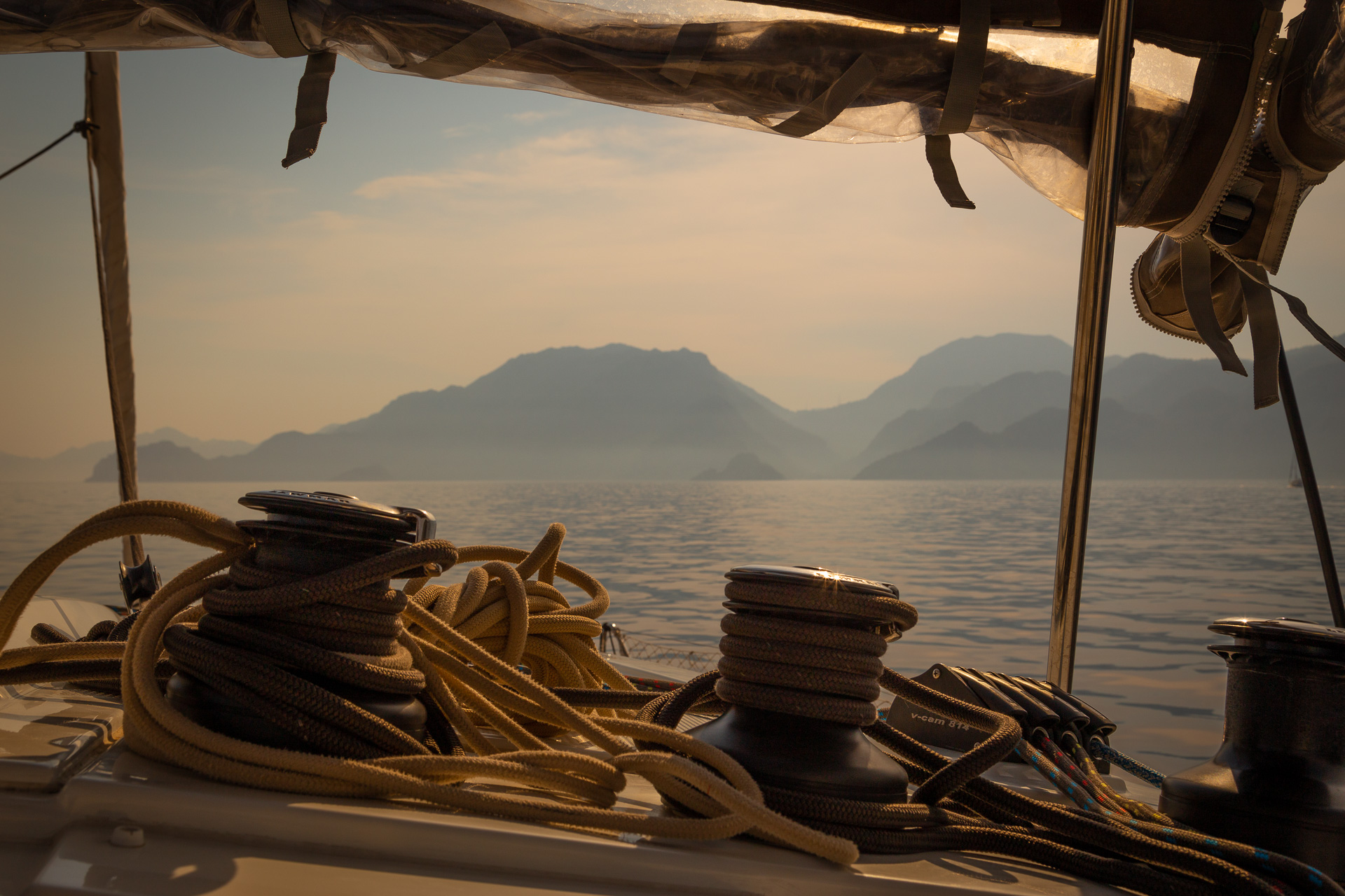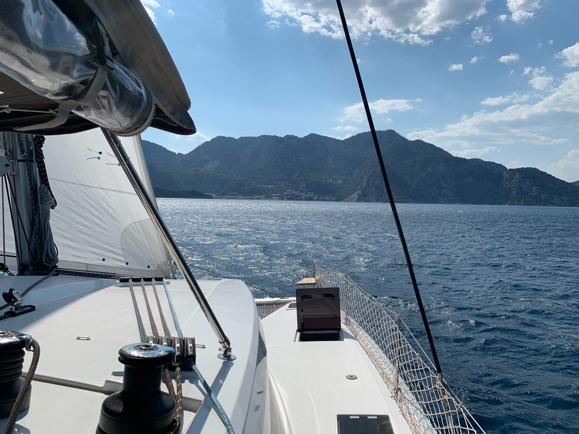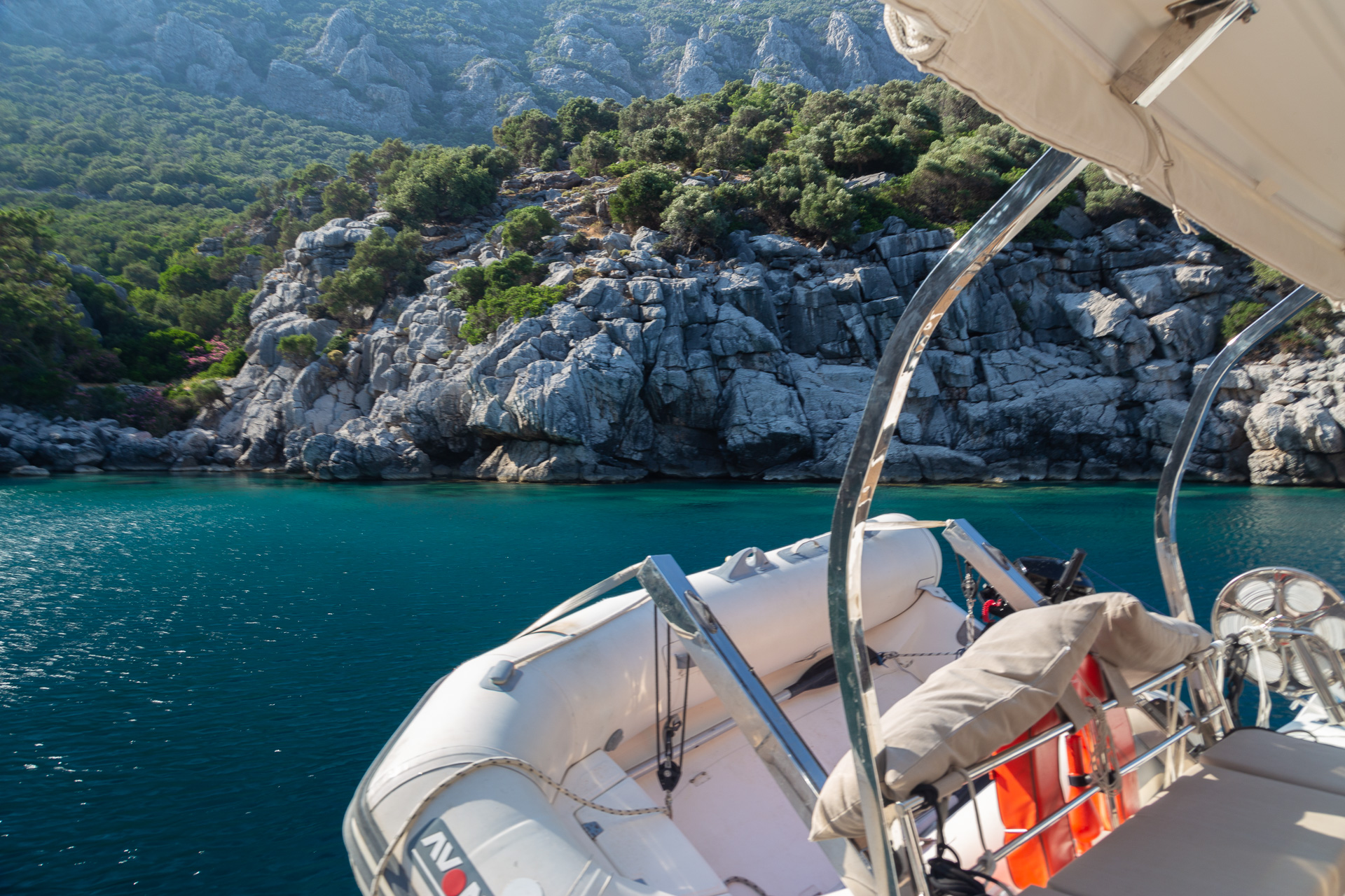 Sunrise seemed to flatten the sea so we managed a few boat pictures from the dinghy before recovering the stern lines and anchor one last time and enjoying our fastest sail yet as we headed back to Marmaris.