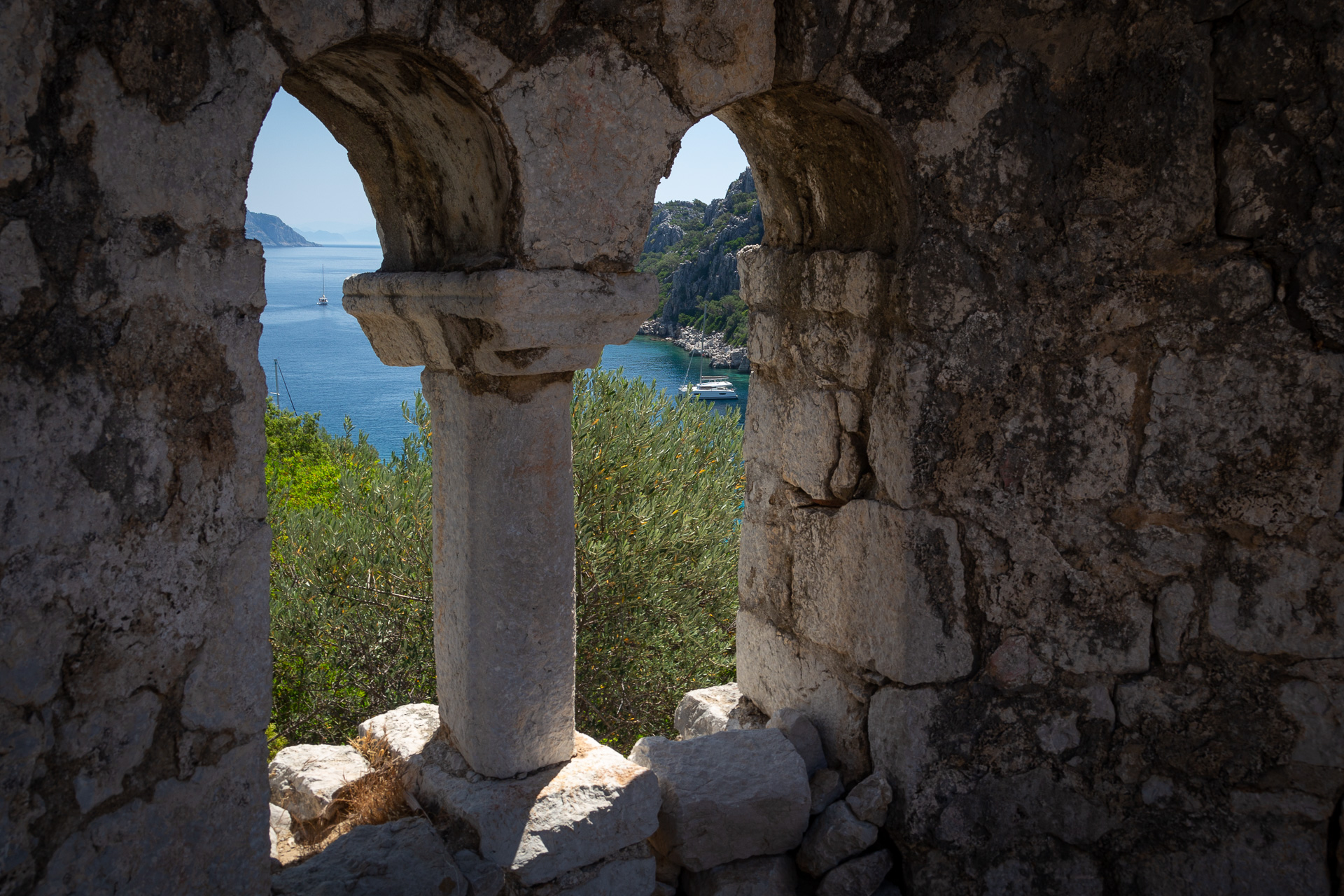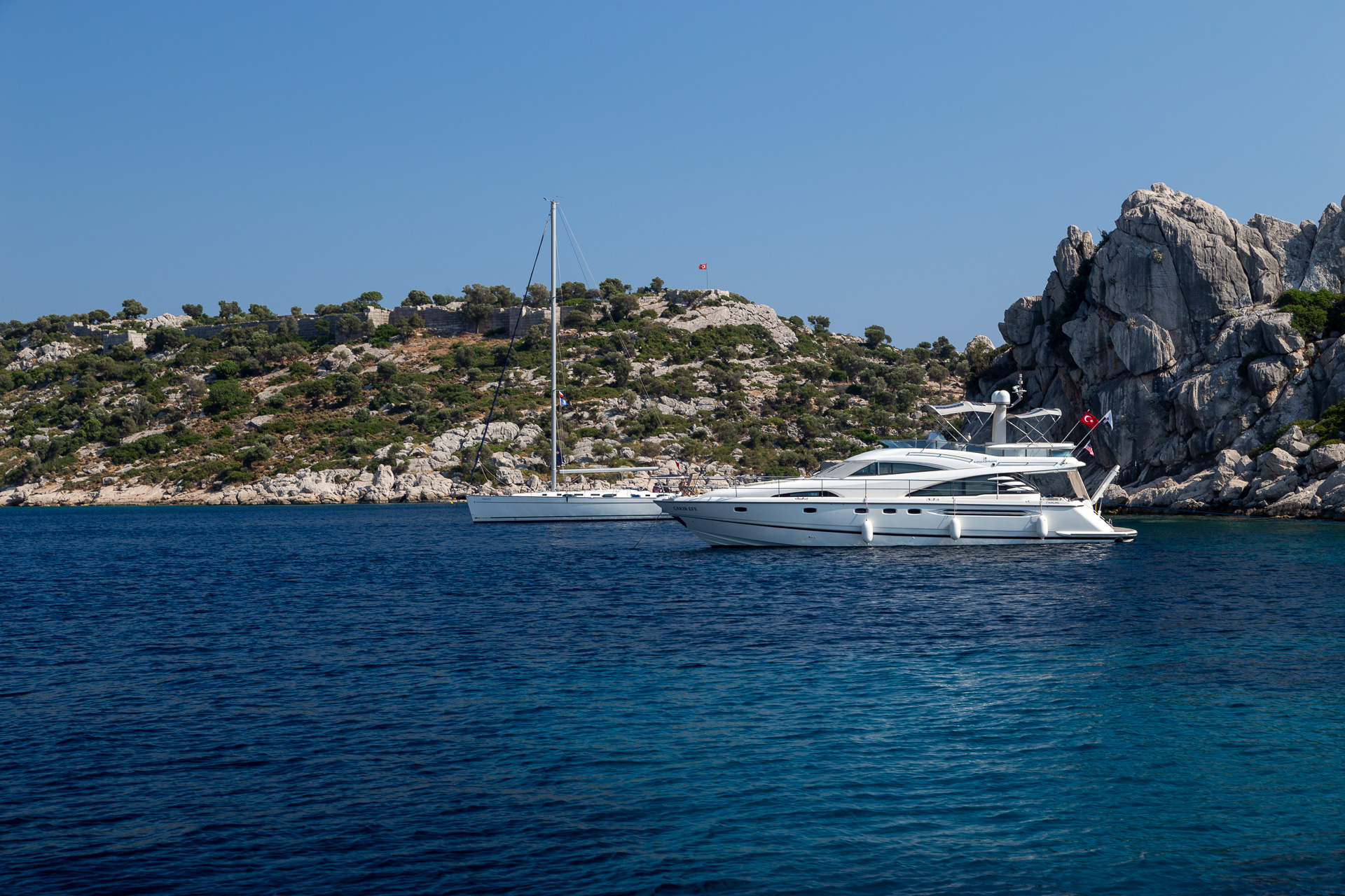 Bozukkale is inaccessible by road but still houses three restaurants to serve the boating community and tour boats. A boat came out from Sailor’s House, the central restaurant, to offer us a place on the jetty. As usual, we declined, and secured ourselves next to several million dollars’ worth of gin palace.