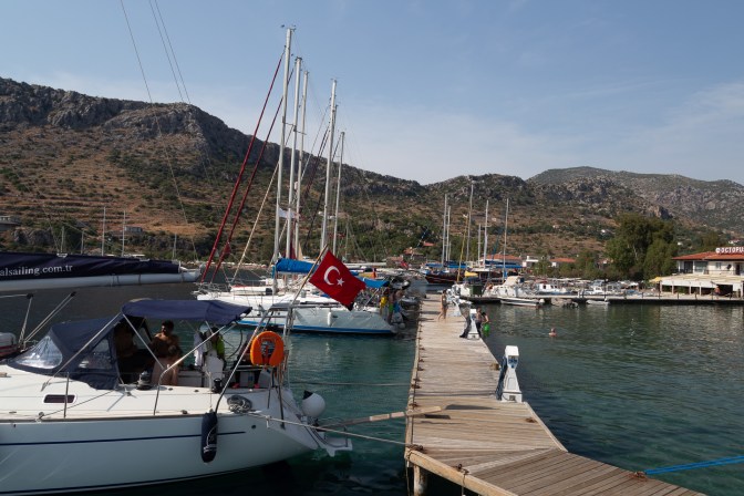 Yesterday we had been unable to start the outboard motor on the dinghy so today we had arranged a rendezvous at Söğüt for repairs or replacement. We had hoped to get more water and a few supplies but the water hose was out of action and the shopping was very limited. We did at least get to practice docking manoeuvres – no scratches.