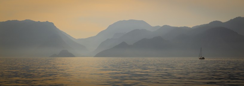 Sunrise seemed to flatten the sea so we managed a few boat pictures from the dinghy before recovering the stern lines and anchor one last time and enjoying our fastest sail yet as we headed back to Marmaris.