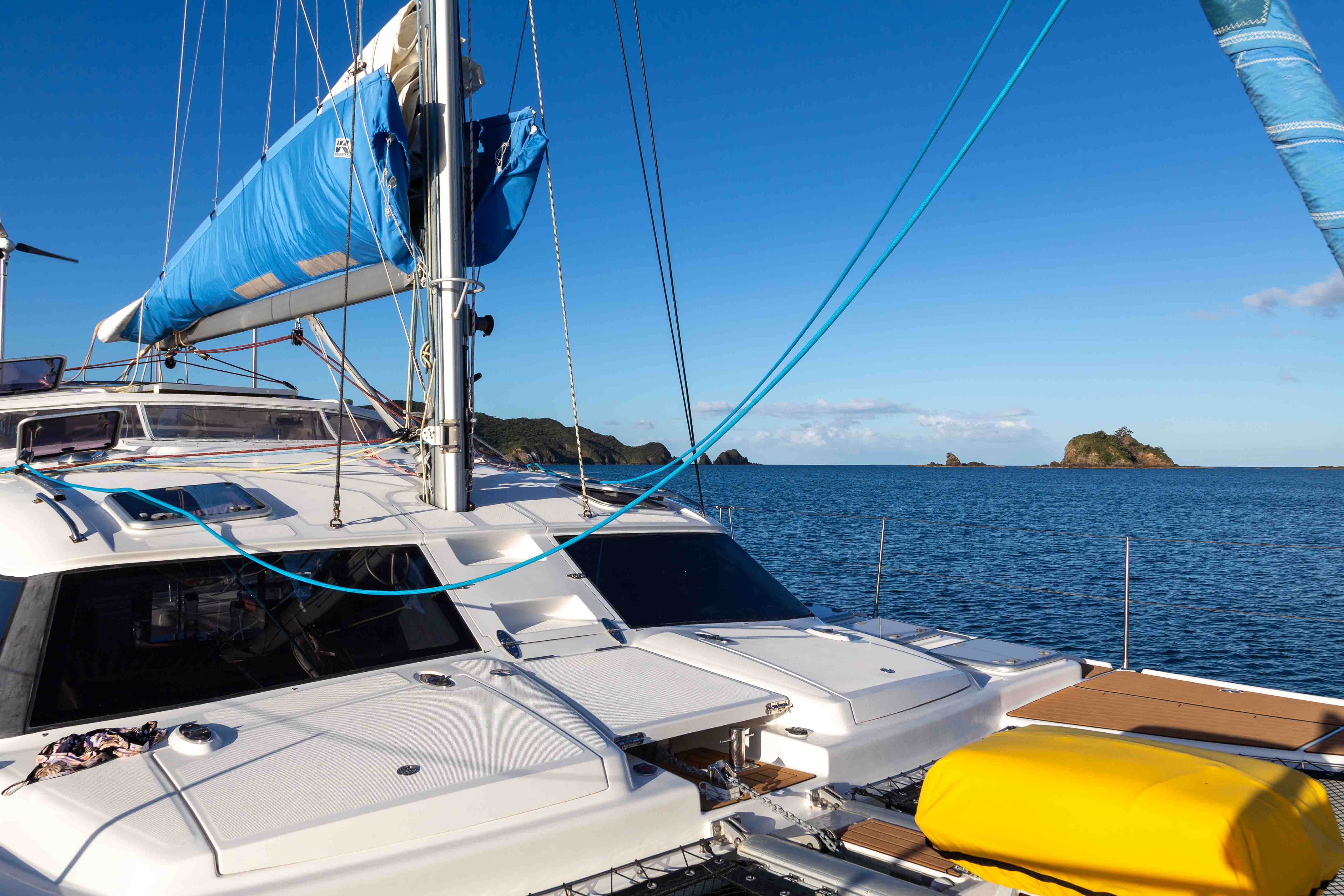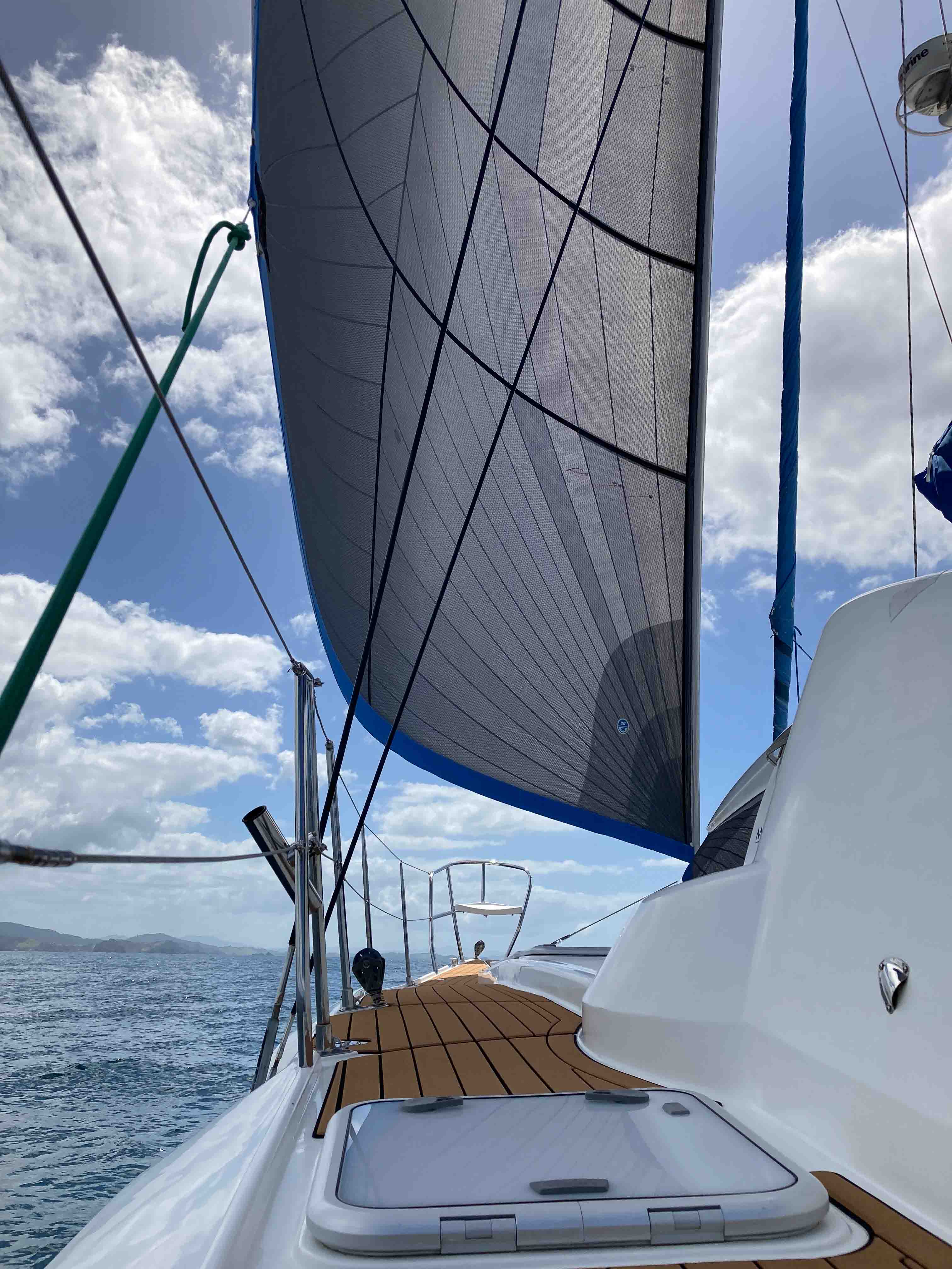 Next stop Whangamumu and we were determined to fly our Code 0 once again. Sue noticed that some of the ropes on it were decidedly worn but Nigel assured her that they were made from dynema which is stronger that steel and so would be fine. 20 minutes later a loud bang indicated that Sue was right to be concerned. The stronger than steel, dynema line holding the tack of the sail had given up and the sail was now making its way higher and higher up the torque rope and beginning to flap alarmingly. We had only just learned how to make our auto pilot follow a wind angle rather than a course so that new skill was put to good use as the boat was able to stay head into the wind while we quickly dropped the sail and bundled it on deck to deal with later. Back to the trusty genoa.