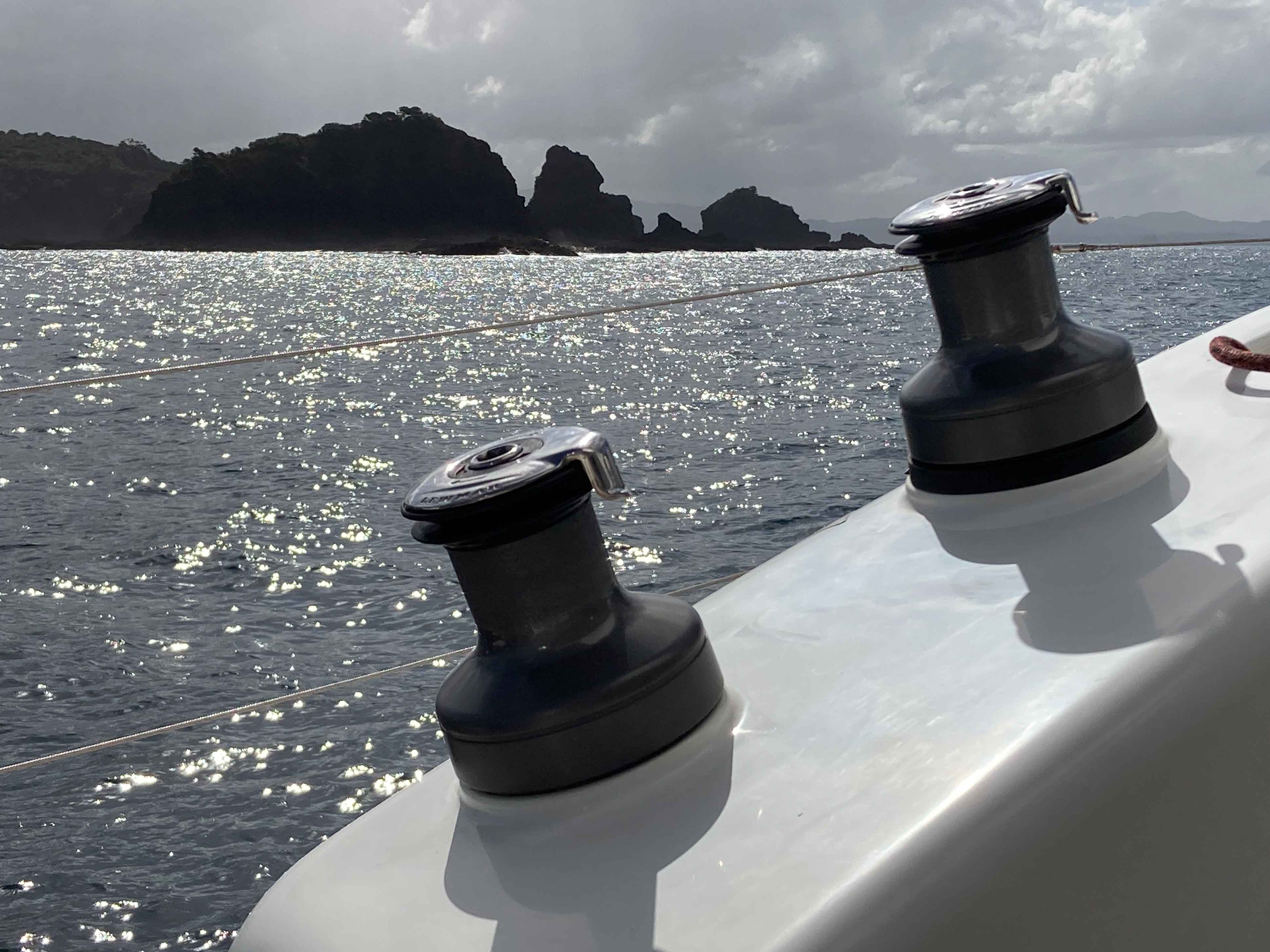 Eventually the wind deserted us completely and we were forced to motor into the beautiful Whangamumu Harbour where we used the rest of the daylight to make emergency repairs to the dynema fixings and get the Code 0 back onto its furling line ready to be packed away tomorrow. We will sort out some new dynema another day.