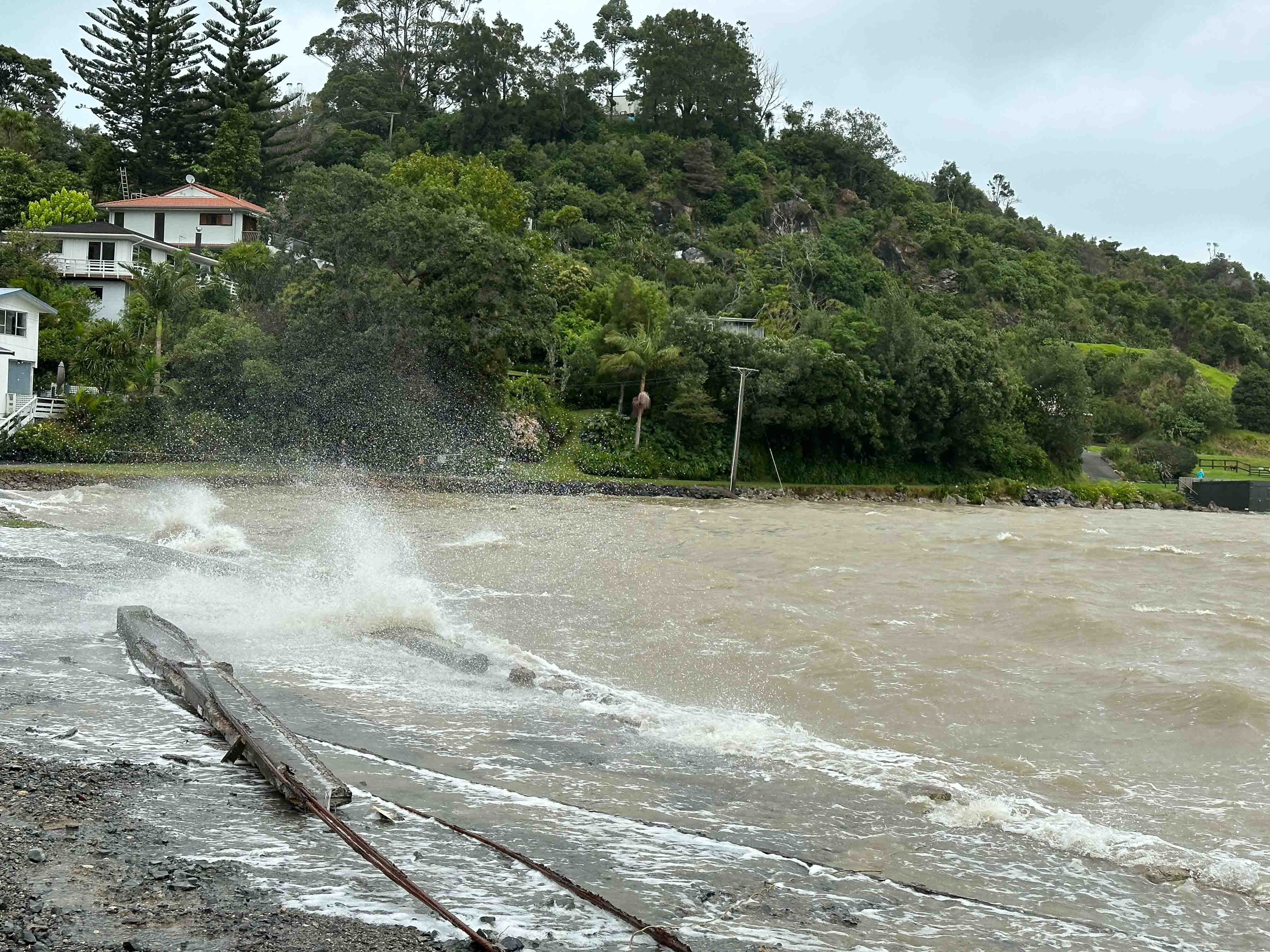 The tar seal was ripped off the beach front road below us by the storm waves and the concrete power poles, which had been left lying down many years ago to form part of the sea wall, were tossed across the road. Just below us the beach road was completely washed away preventing one couple from driving to their house. The boat sheds on the opposite side of the bay had the bottom half of their doors ripped away.