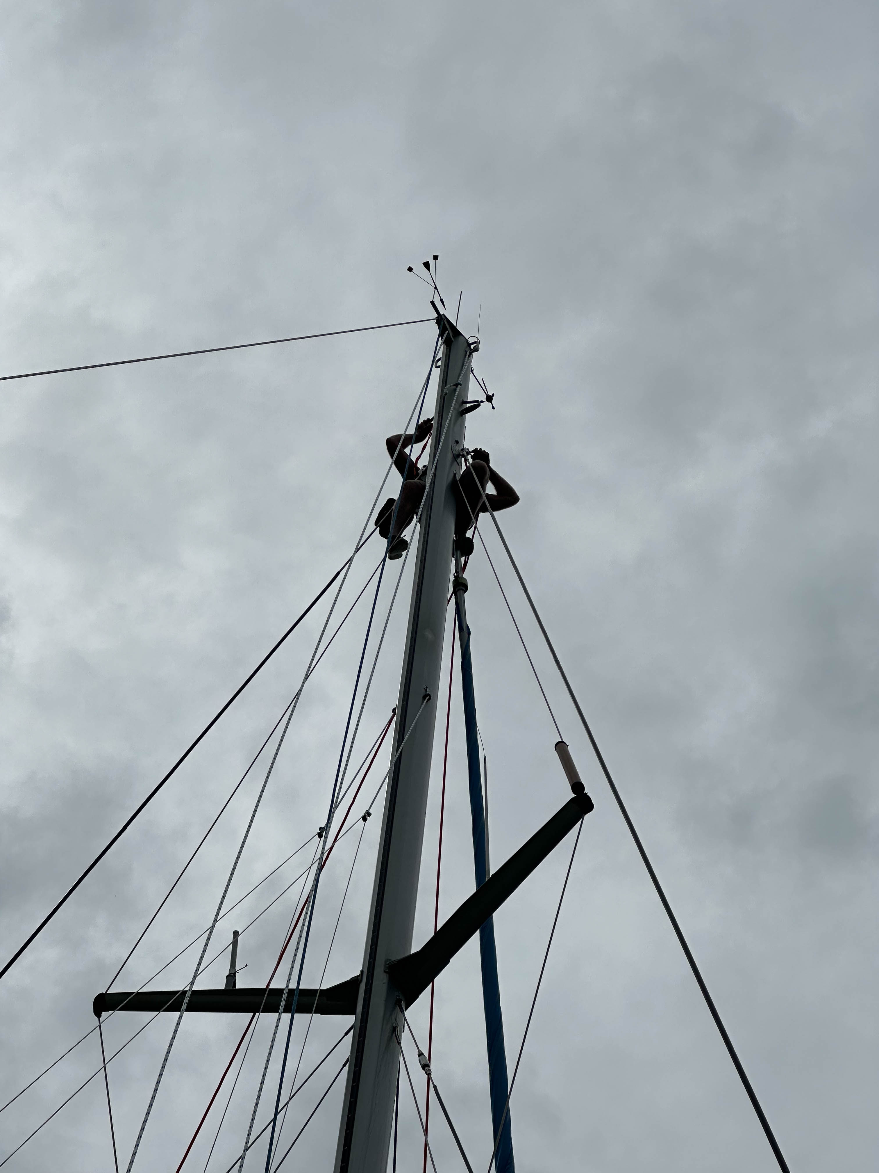 Our boat survived unscathed. We had lashed the mainsail firmly in place and added additional ties to the genoa. The heavy steel mooring block, incredibly thick chain and stout rope all held up to the pounding that she took as the cyclone passed over us and the wind swung through 180º.
