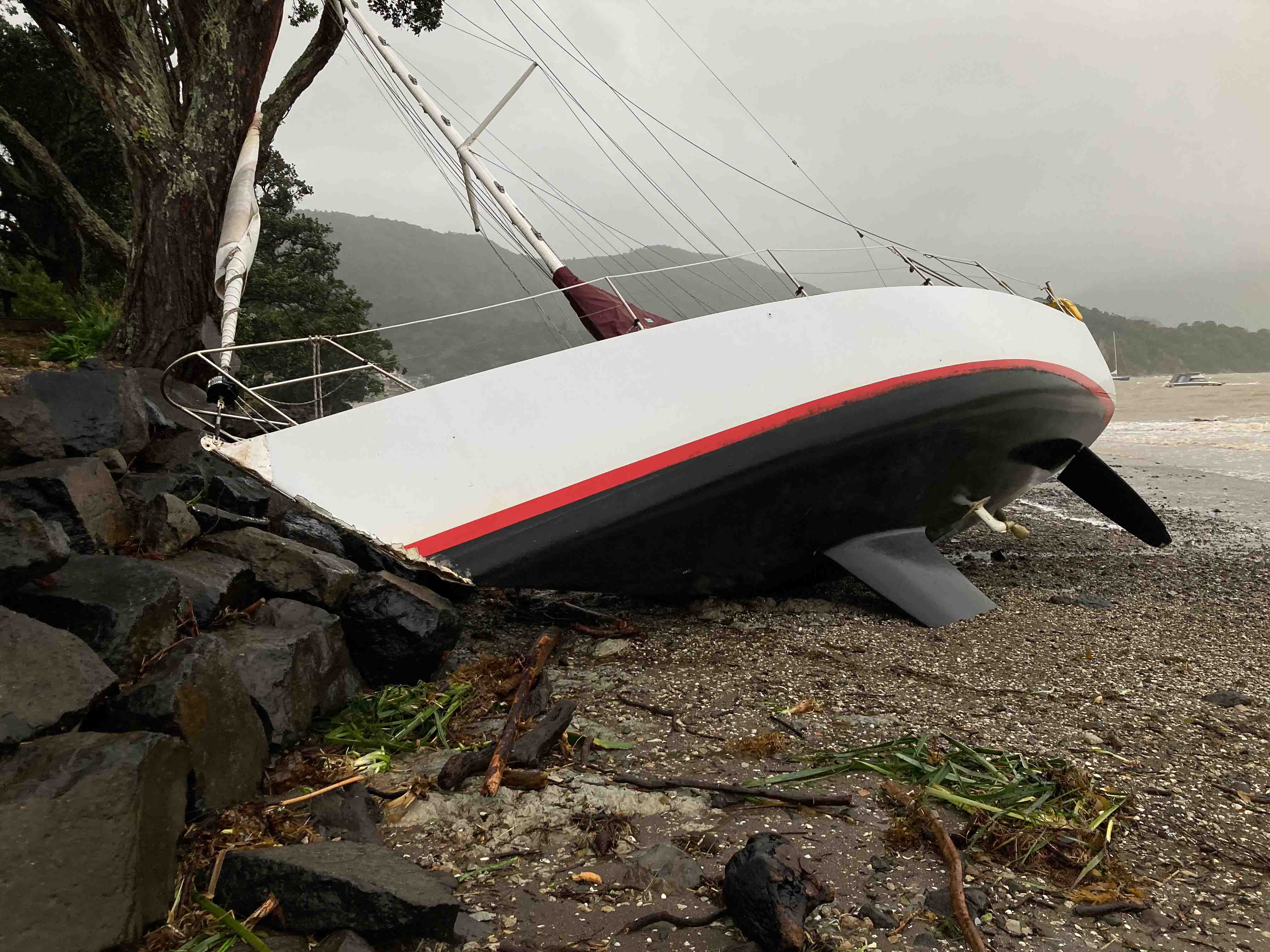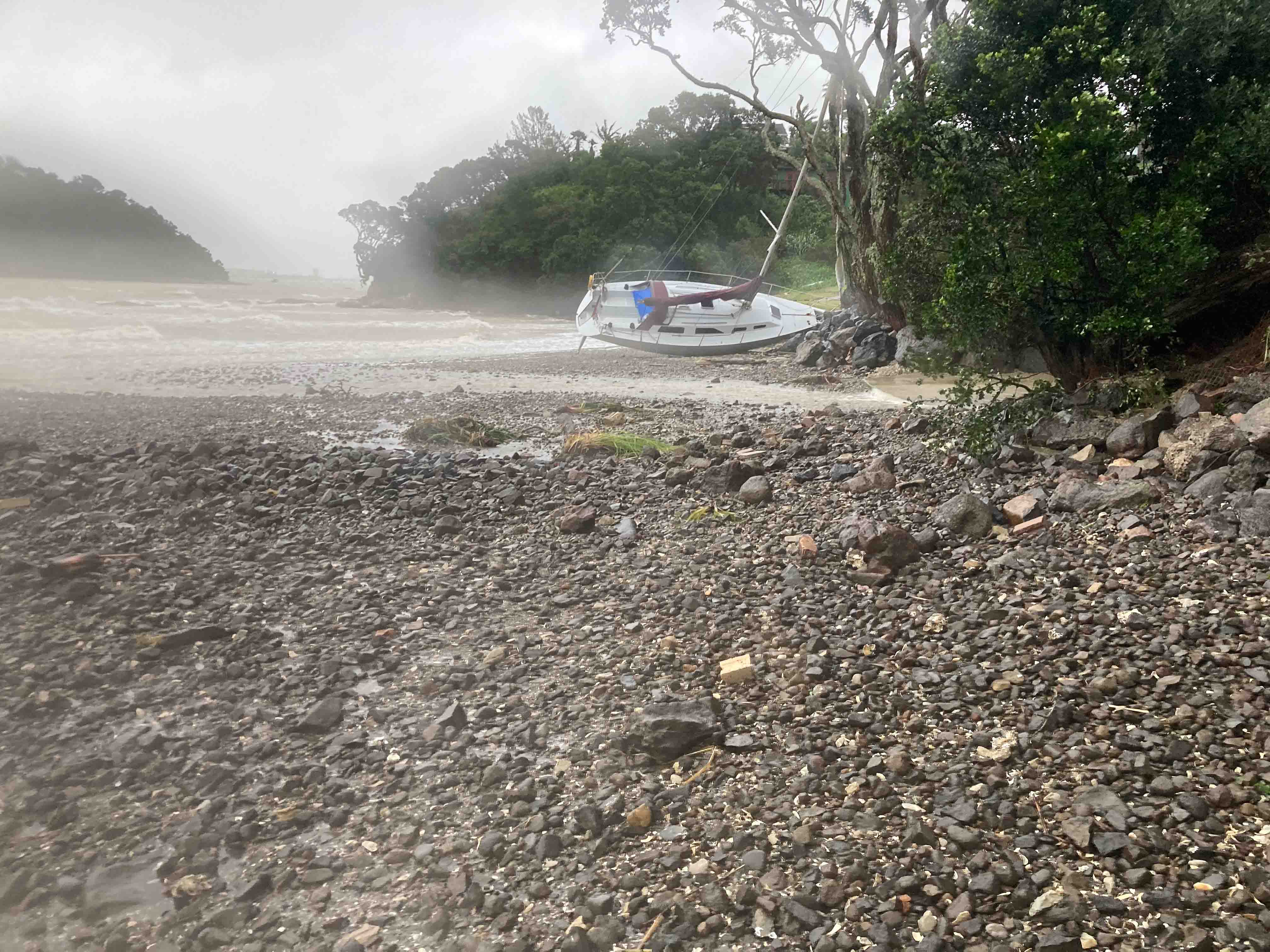 Three boats in the bay broke their moorings and ended up on the beach or on the rocks. Two were salvaged but one had to be cut up and taken away in pieces. A number of the dinghies that people keep under the pohutakawa trees, well above the high tide mark, were completely trashed. We found one, several kilometres away, in Urquhart Bay where it had managed to find its way relatively unscathed.