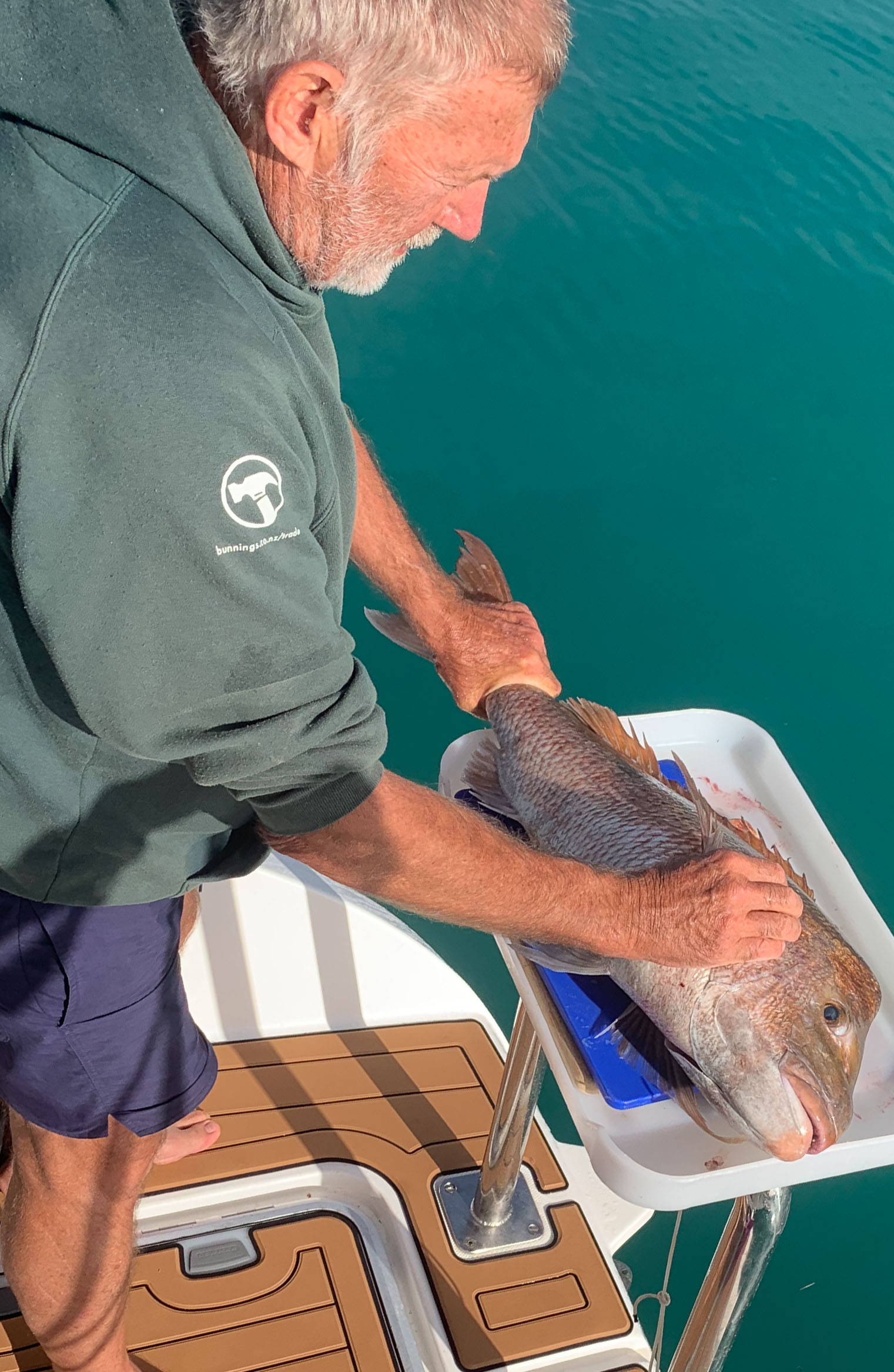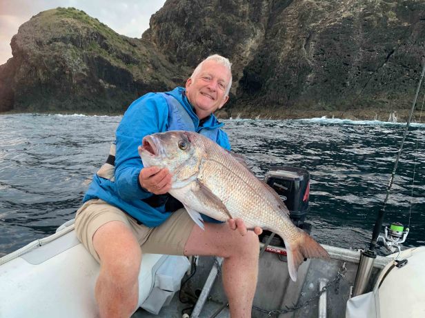 With fish stocks running low, Nigel and Barry were out again the next morning. At last Barry managed to catch some fish. One snapper and one kahawai looked like it would have to do for the evening meal until they decided to try just one more location. As soon as they arrived, Barry spotted a ‘work-up’ (an active fish feeding frenzy) and within seconds, Nigel had expertly cast his lure perfectly into the turmoil and was rewarded with an instant strike. The ensuing battle made it obvious that this was no ordinary fish but with great skilful skill (and great speedy speed?) and more than a bit of determination, Nigel was able to bring the beast to the side of the boat where Barry was waiting with the net. Any guesses as to who is writing this?