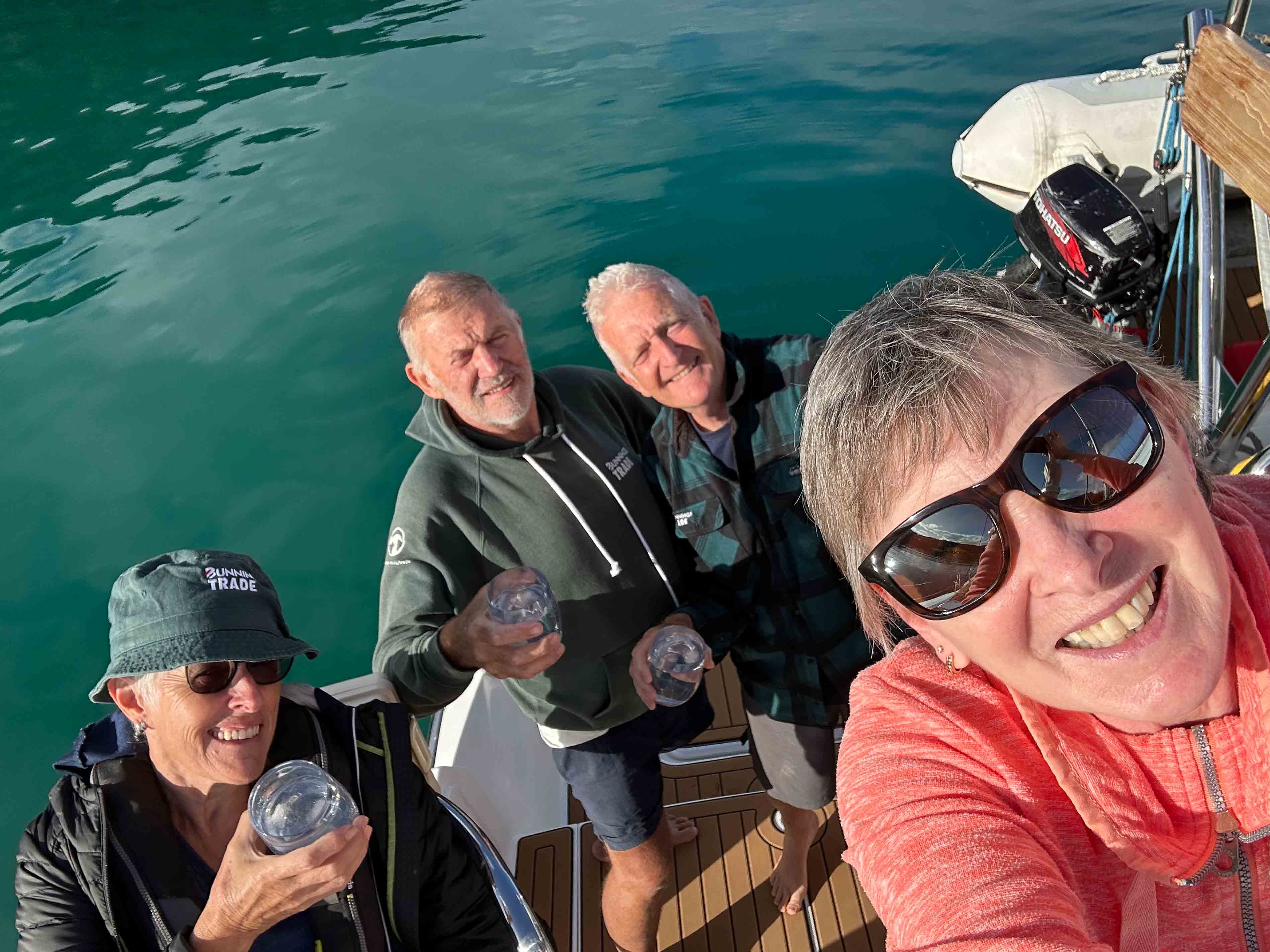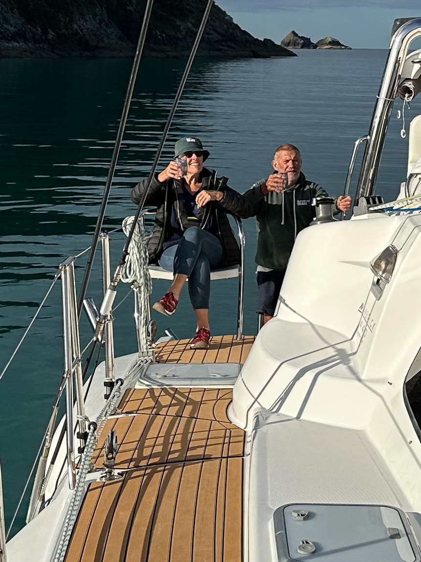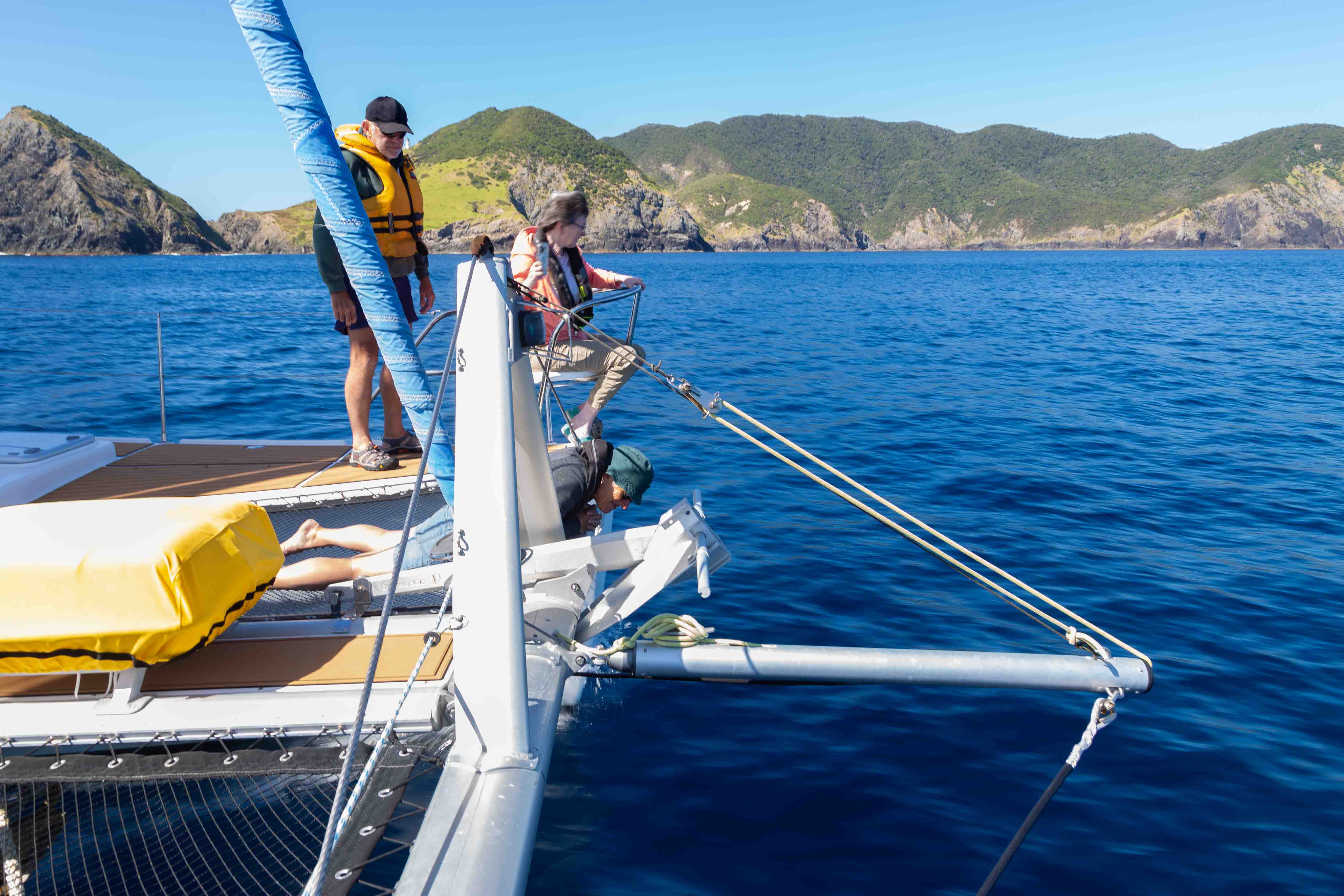 An early morning start by Barry and Nigel meant that we had plenty of time for a gentle spinnaker run all the way to the old whaling station at Whangamumu, briefly accompanied by a pod of dolphins. Plenty of time for sundowners on arrival and a demonstration by Ngaire of the latest in luxury fishing attire – apparently all the best luxury game charter trips offer the option of fishing in your slippers.