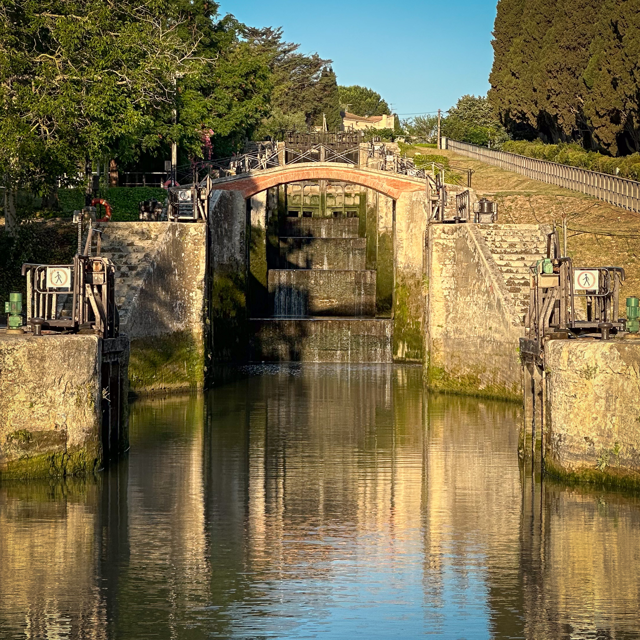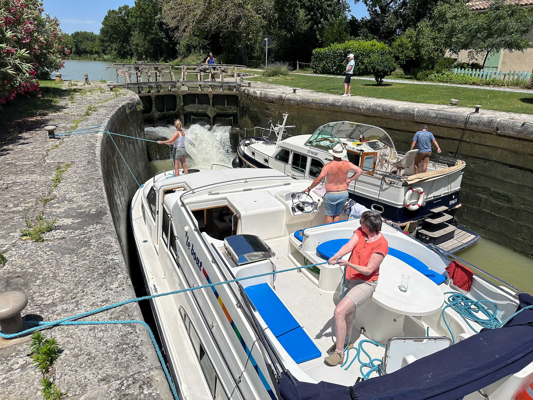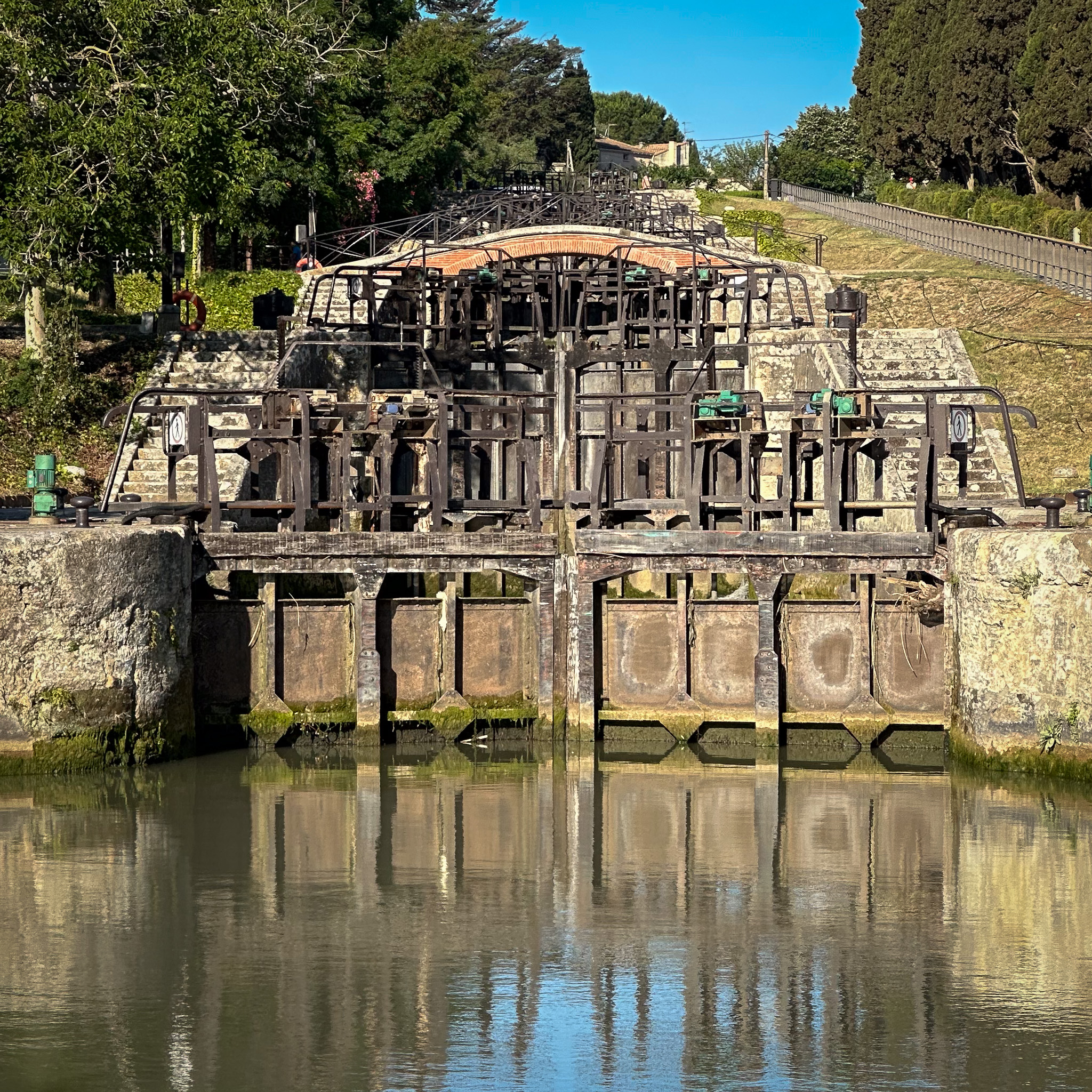 By the time we got to the seven gate Fonserannes Lock Staircase at Beziers we were old hands. The staircase is 312 metres long and lifts boats 25 metres through 6 ovoid lock chambers and 7 gates. A fascinating experience shared with crowds of onlookers who were there just to ensure we got it right at each stage and to keep us under pressure. No problem.