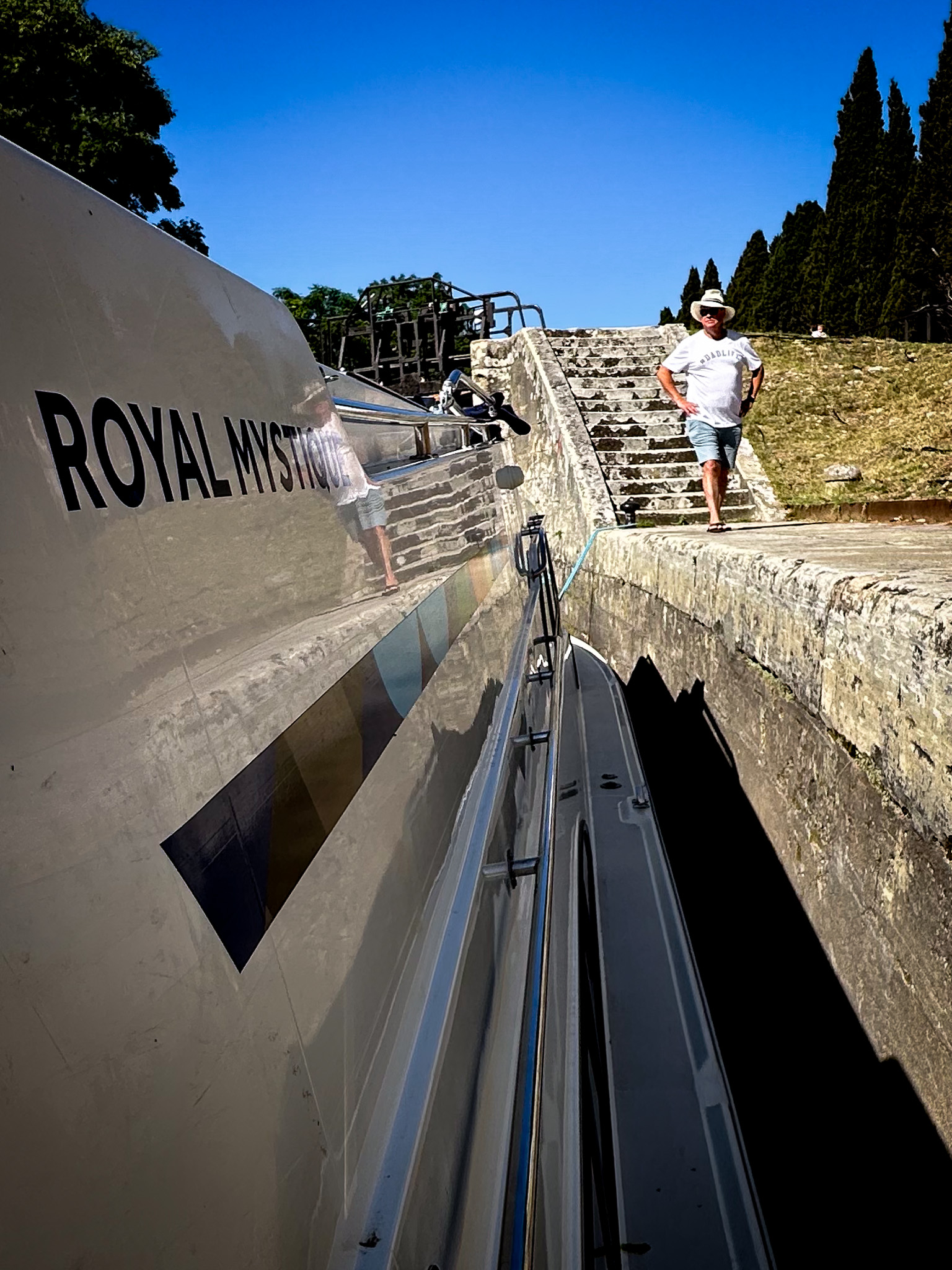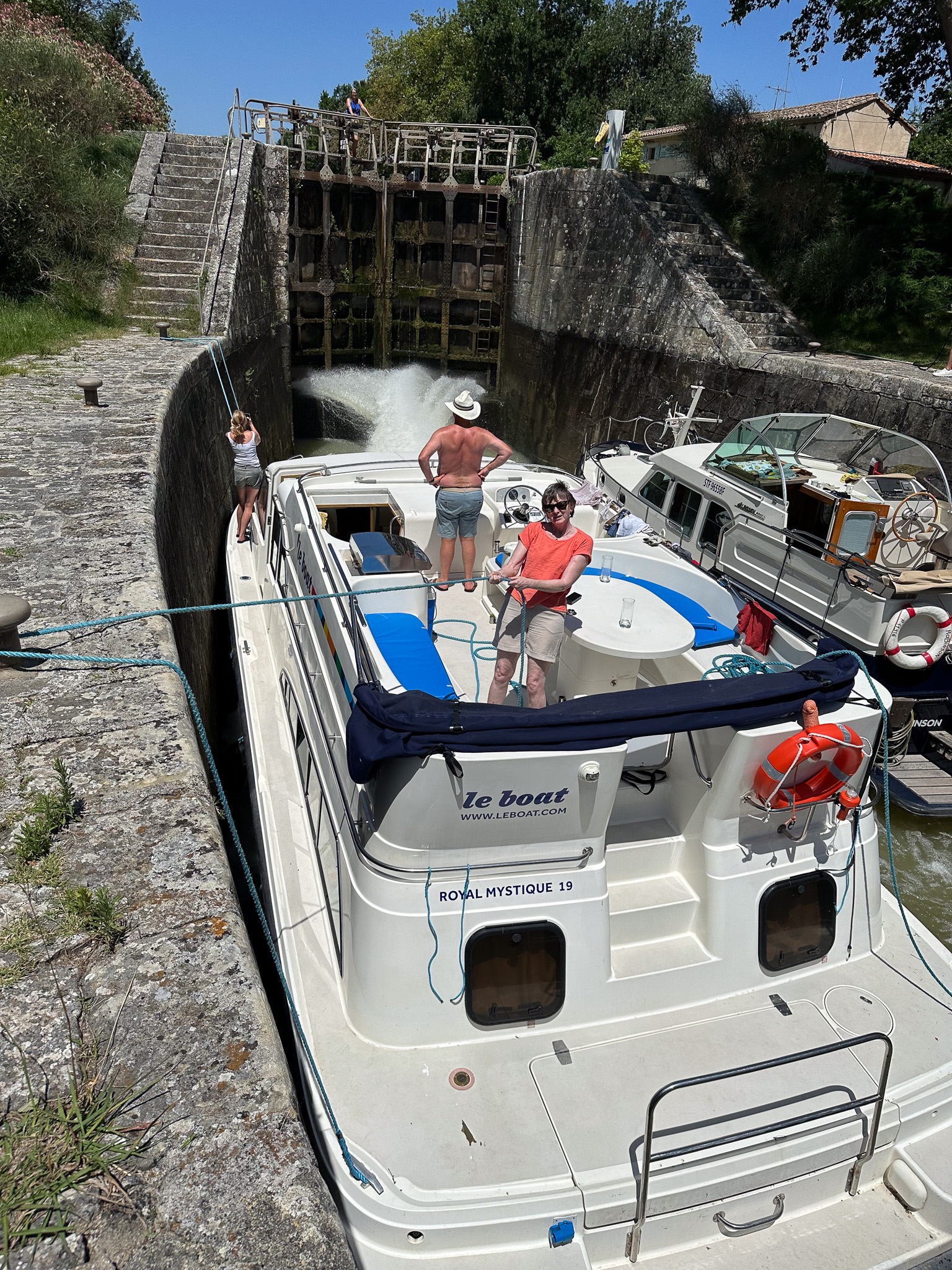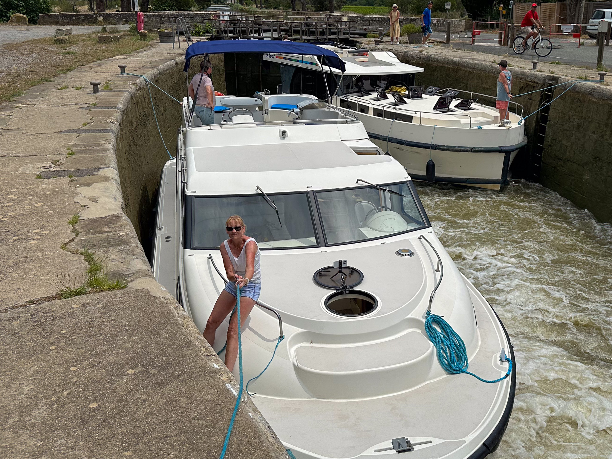 By the time we got to the seven gate Fonserannes Lock Staircase at Beziers we were old hands. The staircase is 312 metres long and lifts boats 25 metres through 6 ovoid lock chambers and 7 gates. A fascinating experience shared with crowds of onlookers who were there just to ensure we got it right at each stage and to keep us under pressure. No problem.