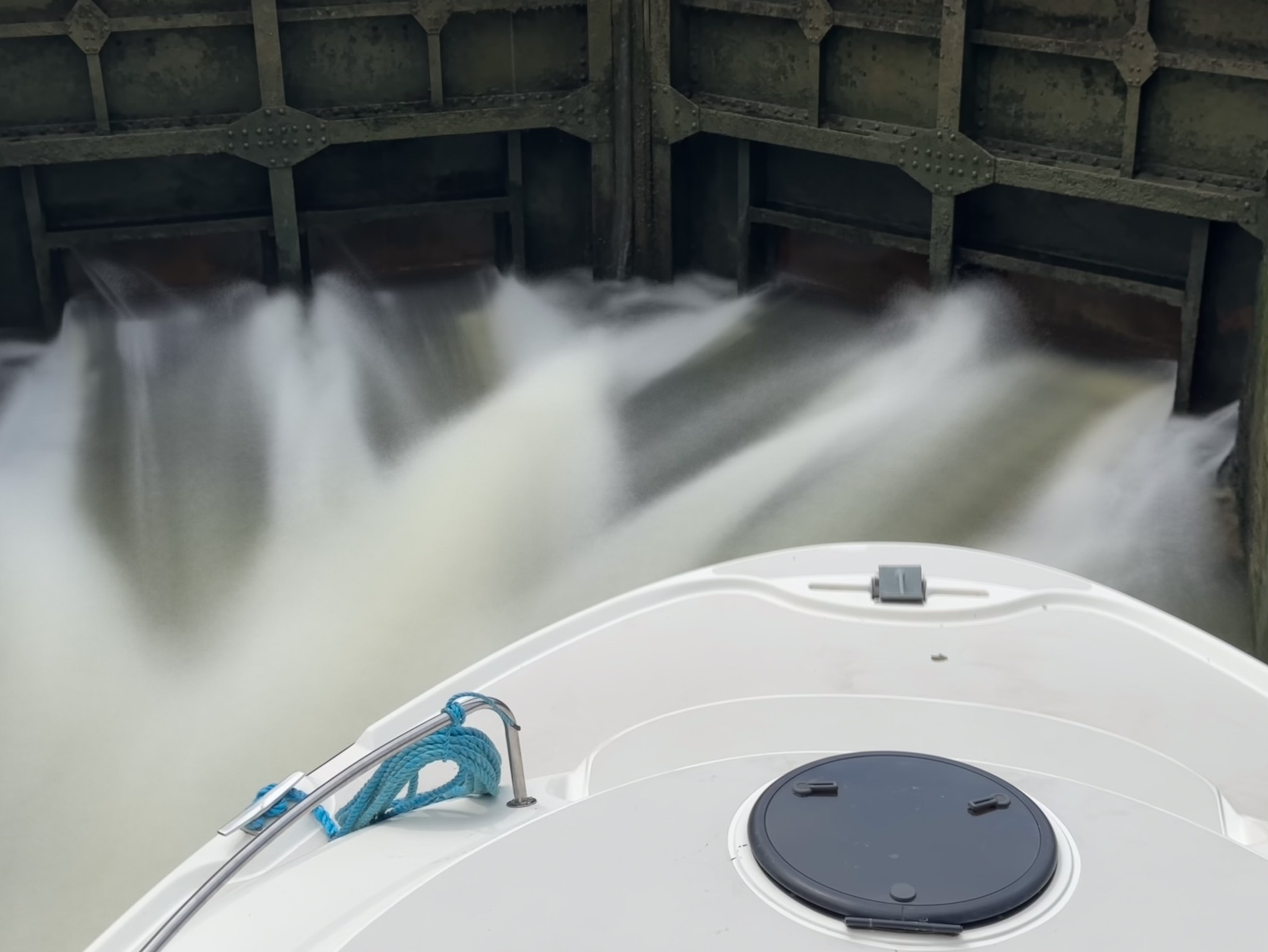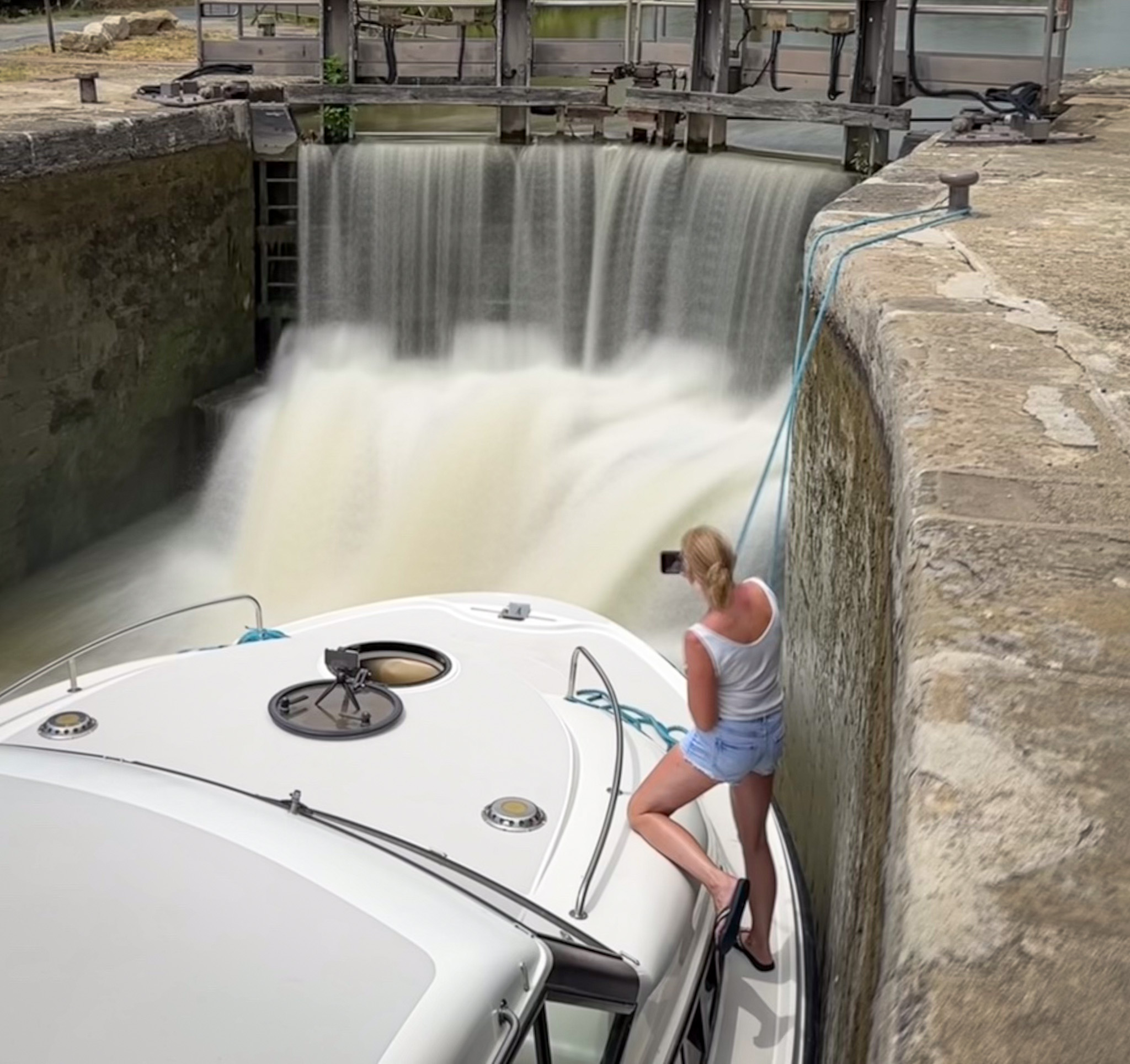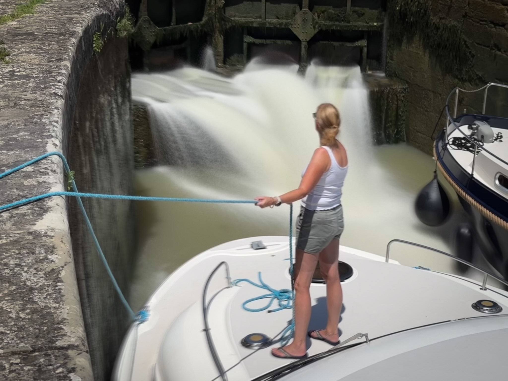 Most locks had red/green lights, visible from a short distance away, to let you know when you were allowed to enter. Each lock had a short ‘quay’ on one side of the canal or other at which we would await the green signal and from which one person would get off the boat and walk up to the lock ready to handle the ropes. Occasionally this person had to go looking for the lock keeper to let them know we were waiting. The boat was then manoeuvred into the lock itself and two people would throw lines from the bow and stern up to the shore person to loop around the mooring posts. The lock keeper then closed the gate and filled the lock. While this was happening the rope handlers had to keep the ropes tensioned to hold the boat in very turbulent water as the lock was rapidly filled and the boat rose. Within a few minutes the waters were still again, the lock keeper would open the upper gates, the shore person would step aboard and we would be on our way again. In the case of double (or triple etc) locks, the lines could be carried along the tow path – making for a much more efficient process – but not before we tried the messier one first!