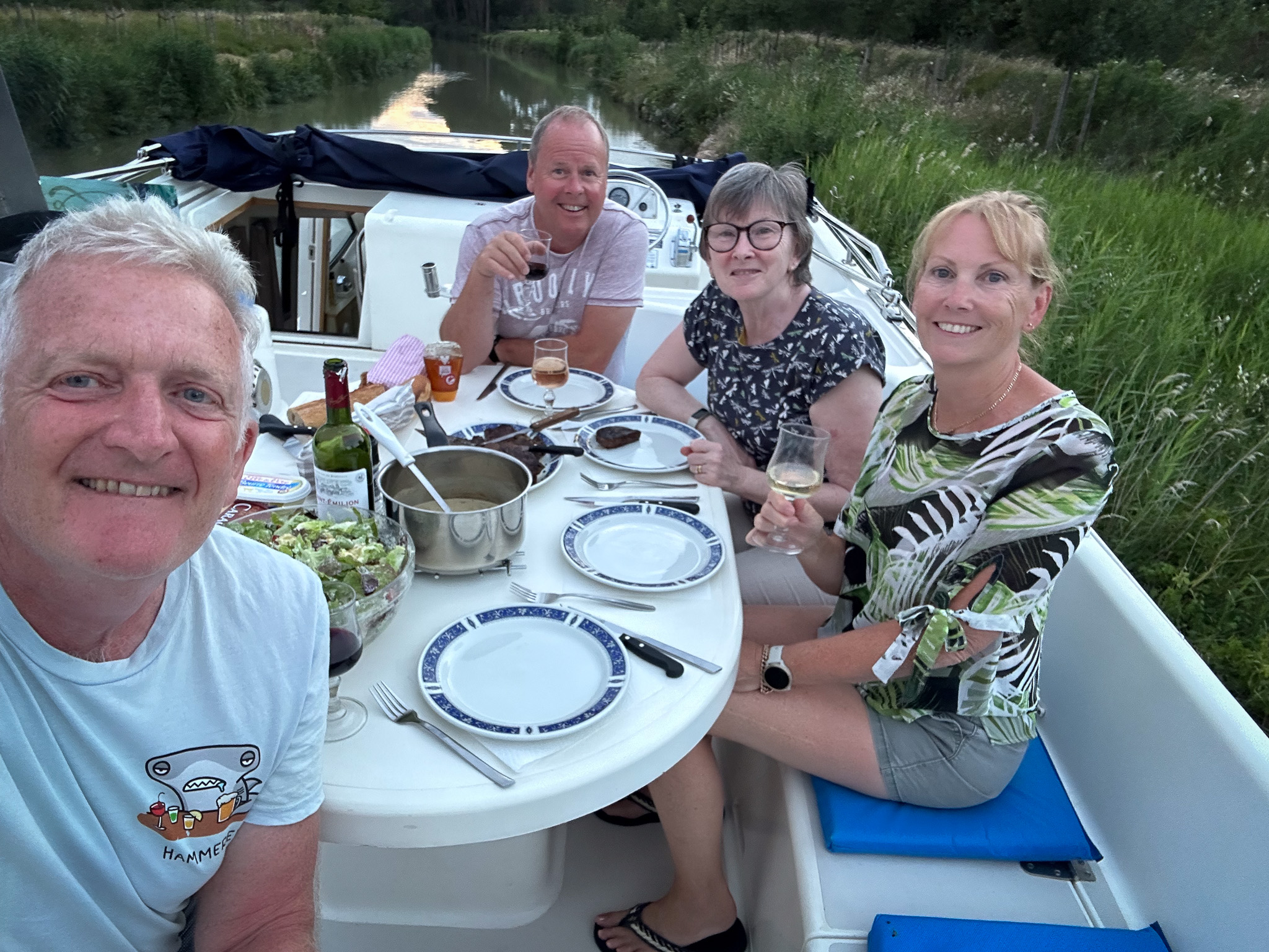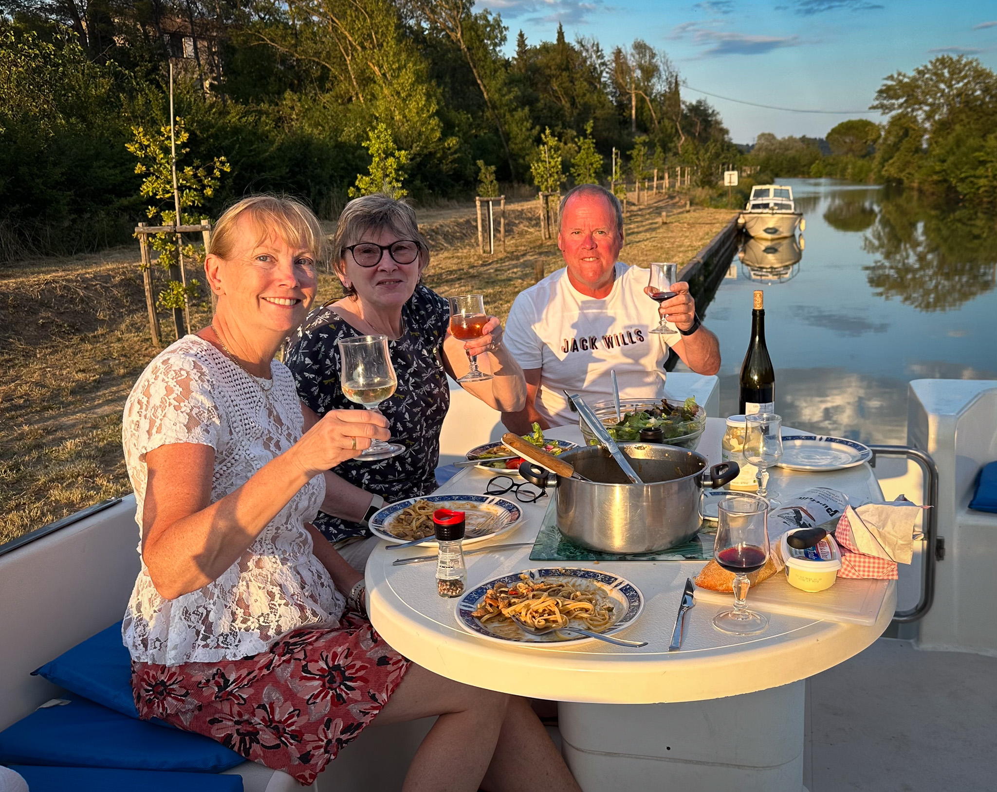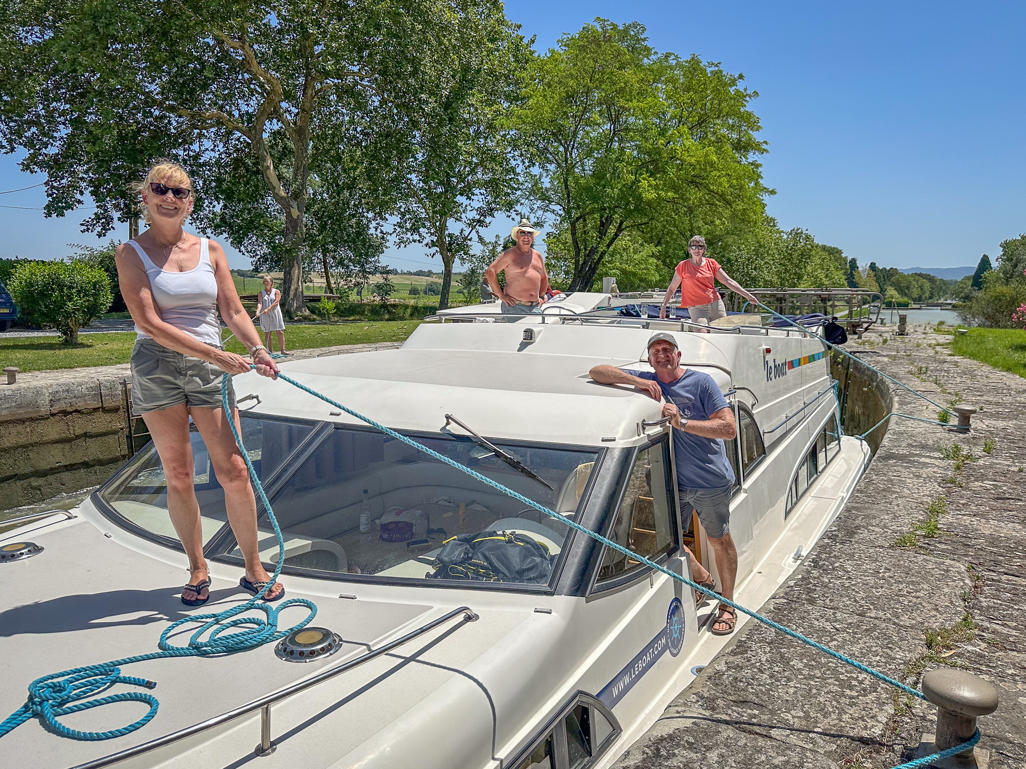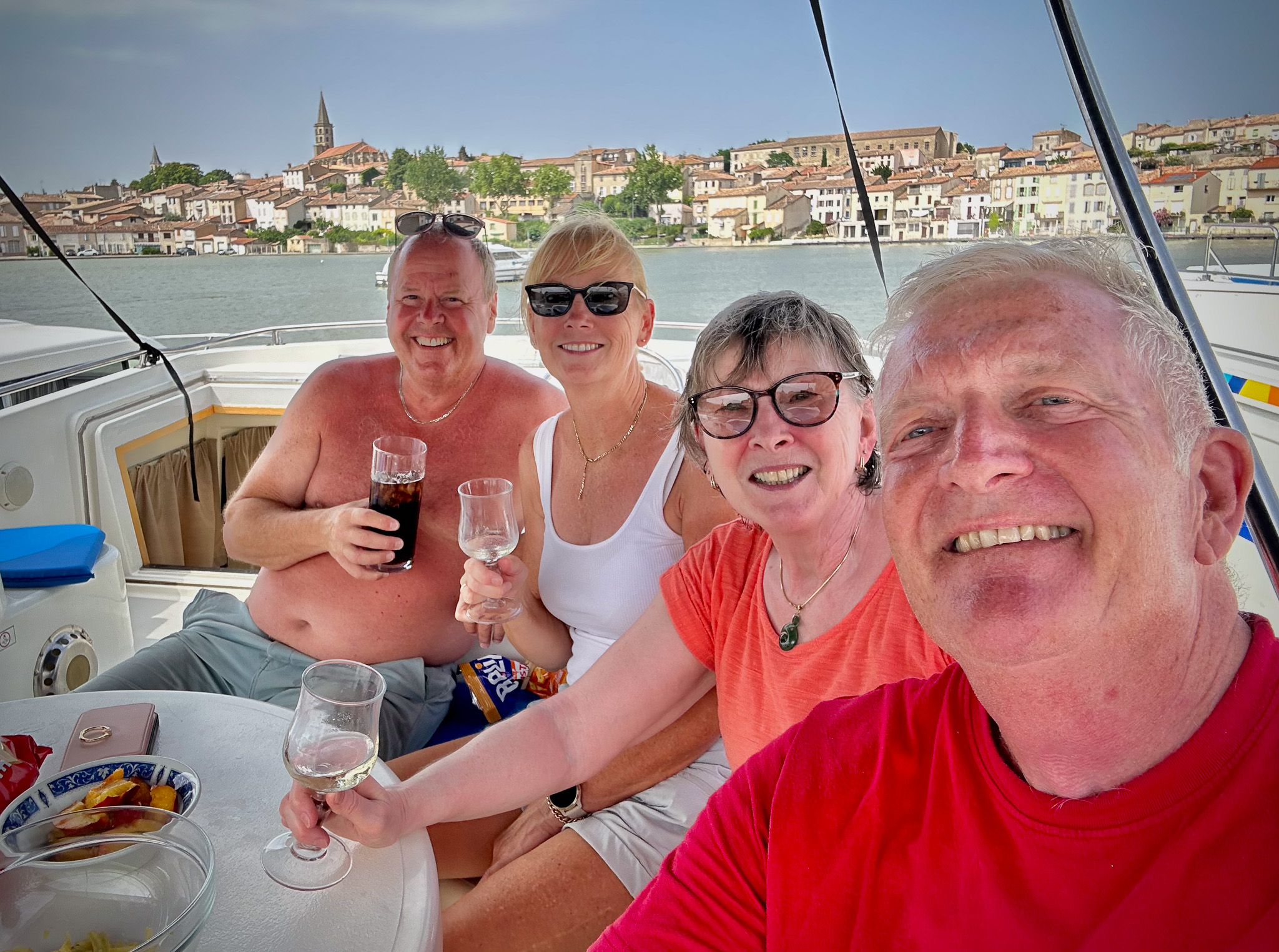Nigel and Jonathan had a half hour lesson on driving the boat while Sue and Claire organised provisions at a local supermarket. Then we were off for ten days of leisurely cruising, navigating canal locks, exploring ancient villages and towns and of course lots of eating and drinking of French wines and food.
