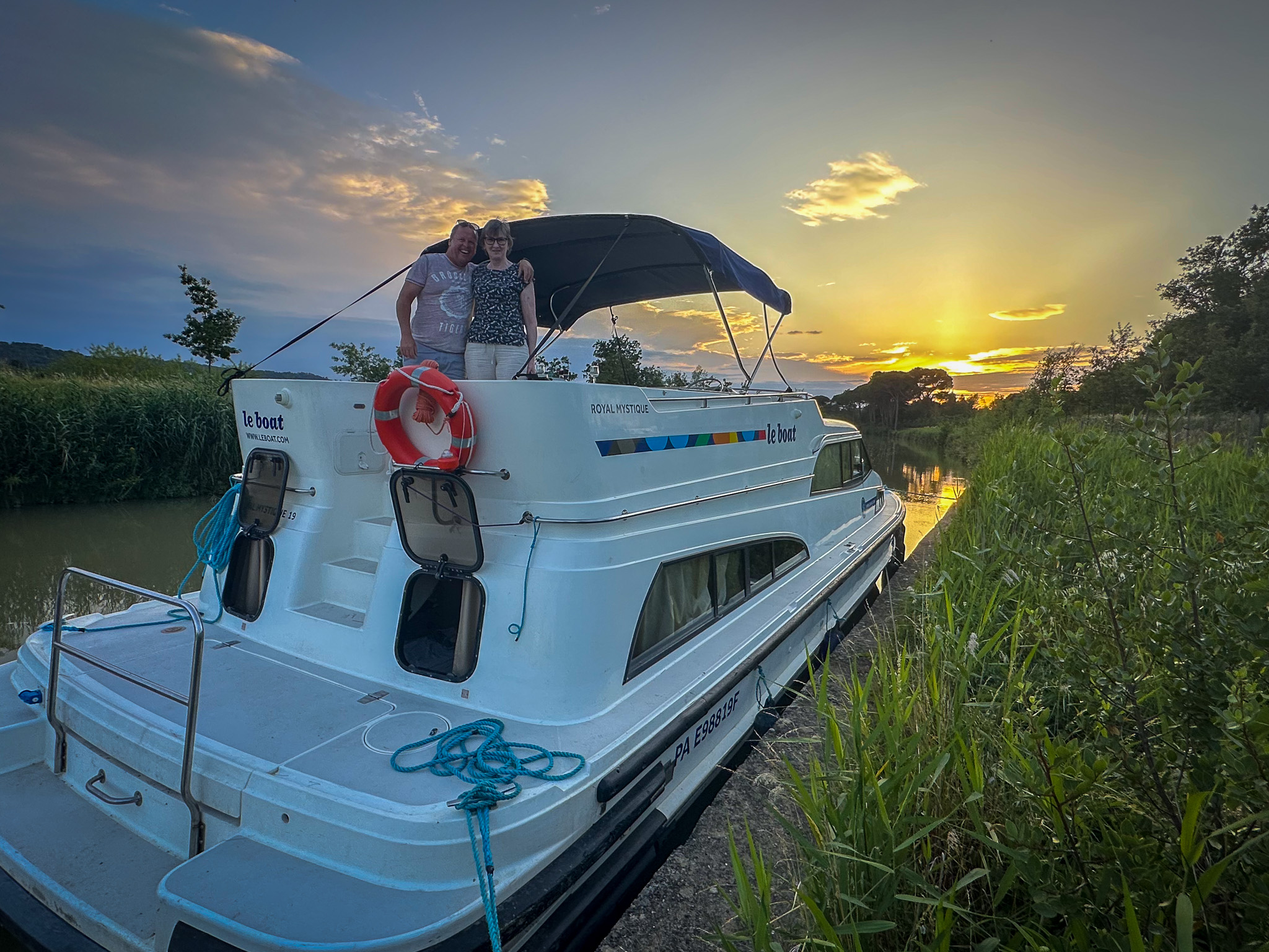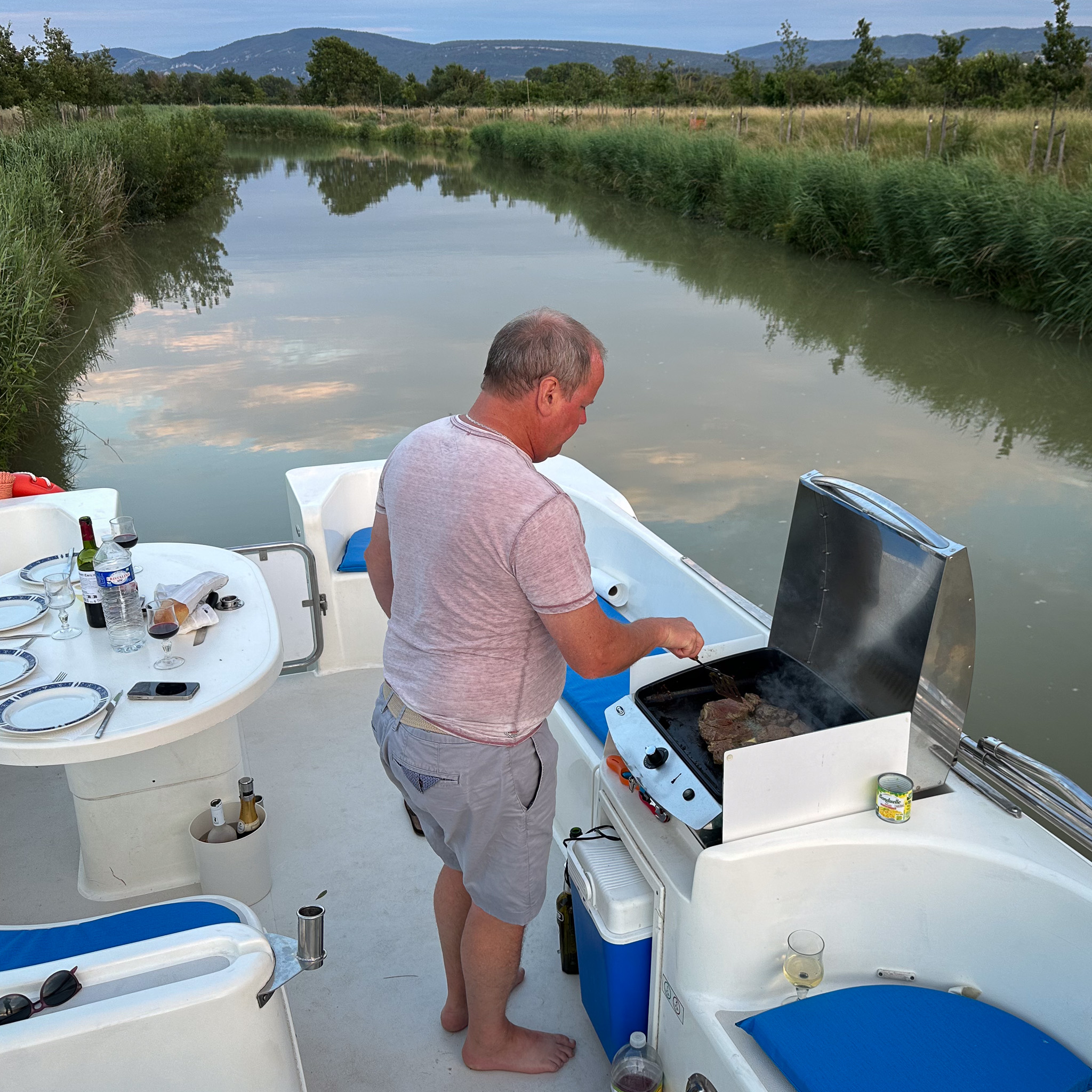 We were too tired and it was too late (it was after 2am) to look for alternative accommodation so Claire and Jonathan braved the high level bed while we slept in a normal bed which had a strange steel frame around it. When we saw the stock of plywood and other building supplies outside the apartment the next morning, we realised that he was planning to build another mezzanine floor above this bed. Crazy! Once Sue began showing signs of an allergic reaction to a cat (which had apparently died two years earlier – its cage and blanket and other paraphernalia were still in the lounge!) that was all the excuse we needed to move out and spend the day travelling all the way to the Mediterranean coast ready to collect our canal boat the next day. A night in a perfectly comfortable hotel and a restaurant meal meant we were all well rested and ready for our holiday to begin.