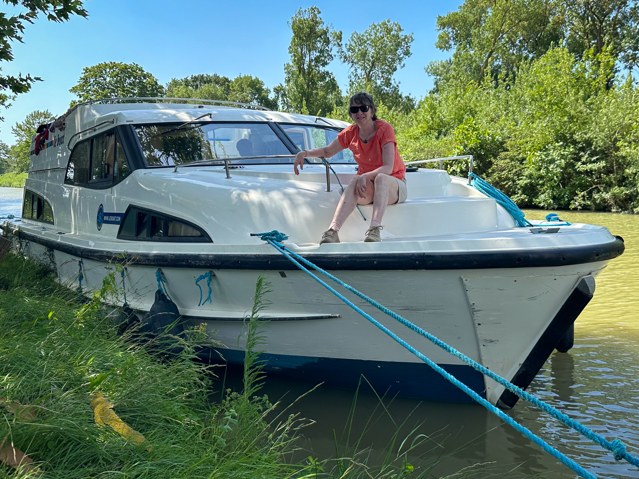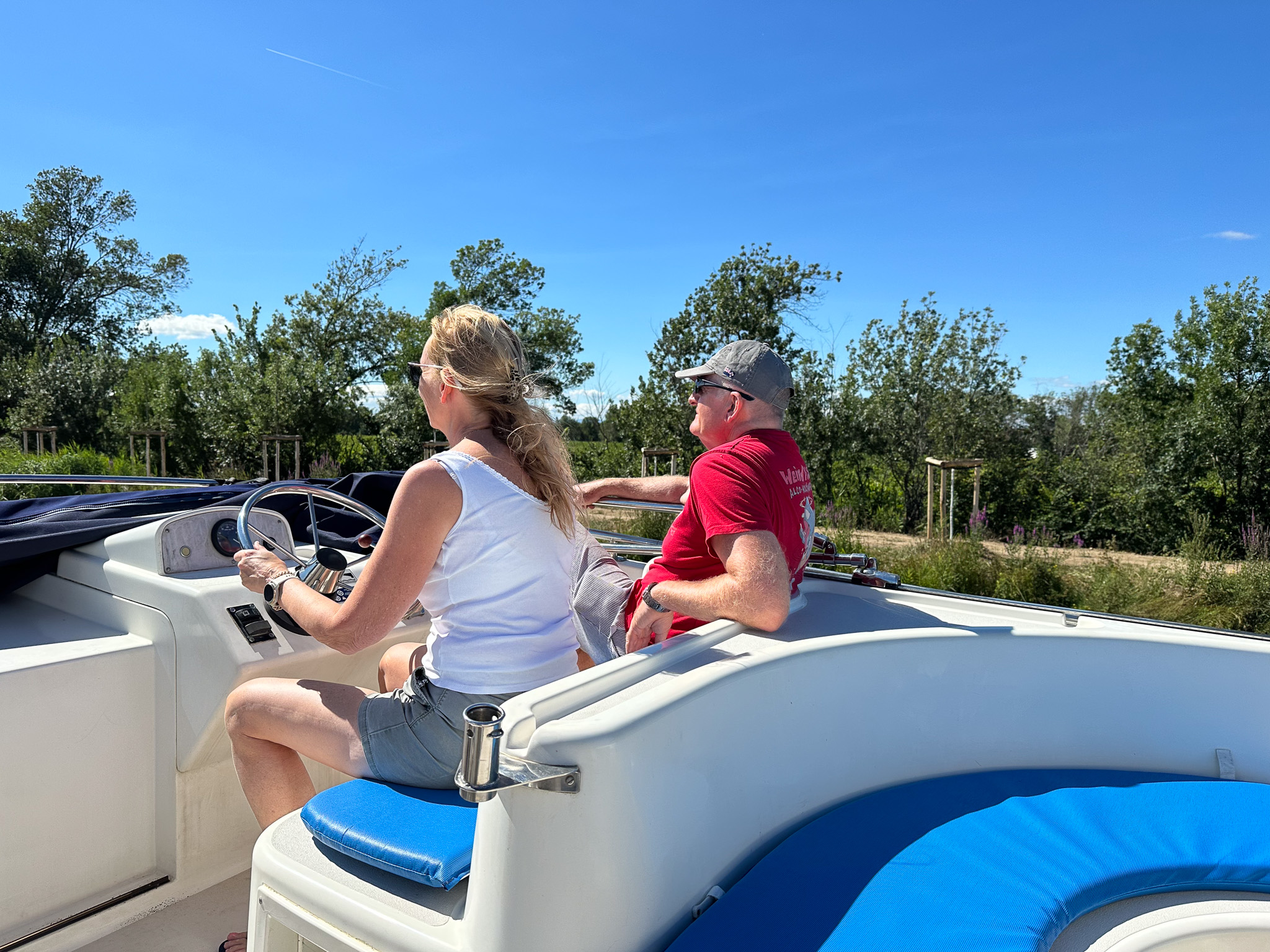Despite the sedate pace, the helmsman’s job was trickier than it looked. The boat needed to be actively steered, especially when heading into the wind. Even a slight breeze would push the bow off course and if you overcorrected you would end up zigzagging down the canal. The helmsman in the boat below obviously panicked as he approached the narrow bridge, overcorrected, had to reverse and then backed into the bank before finally getting it all under control and passing under the bridge while we waited. Nigel gave him a round of applause as we passed. We were not sure that he appreciated it.
