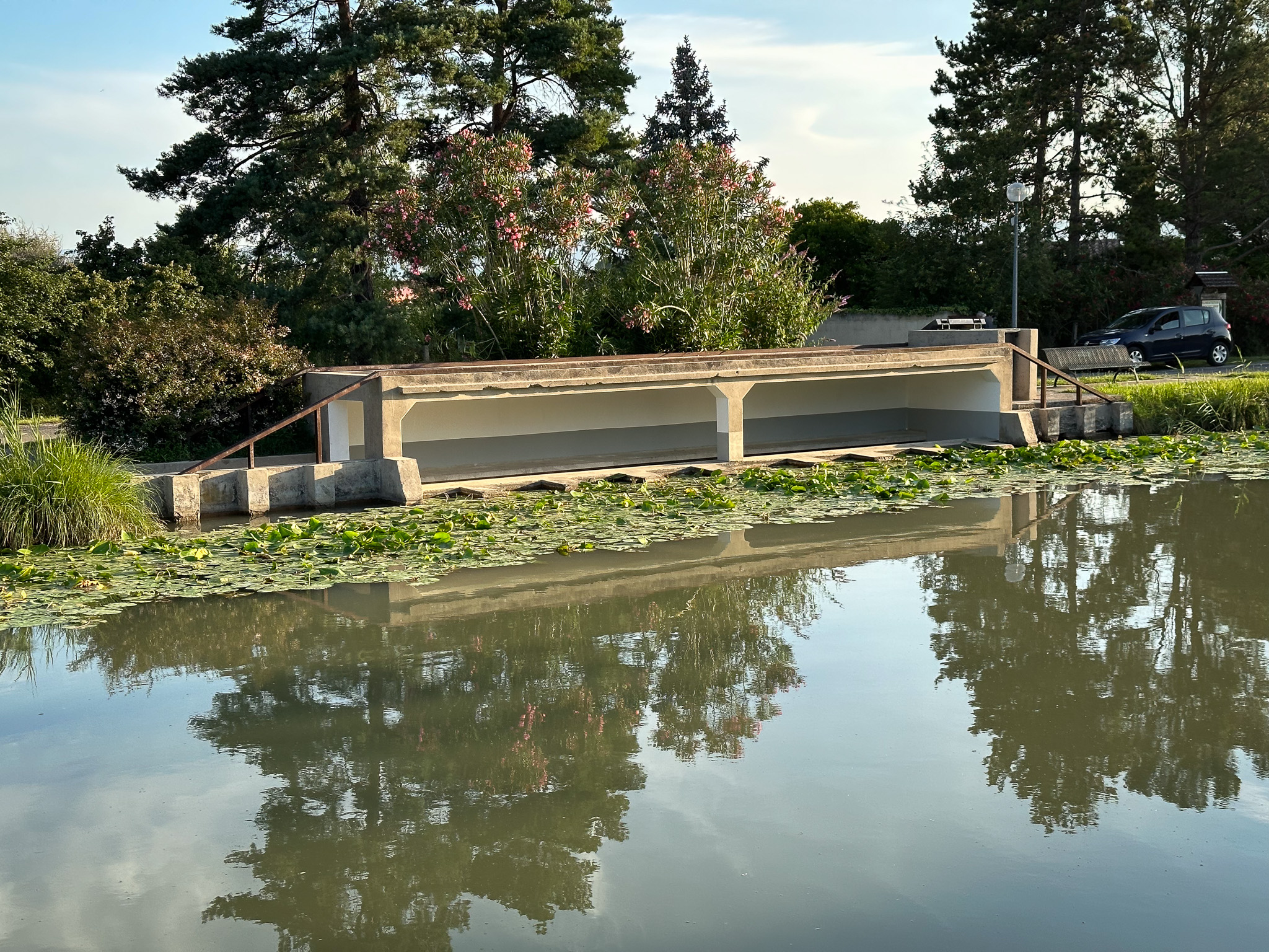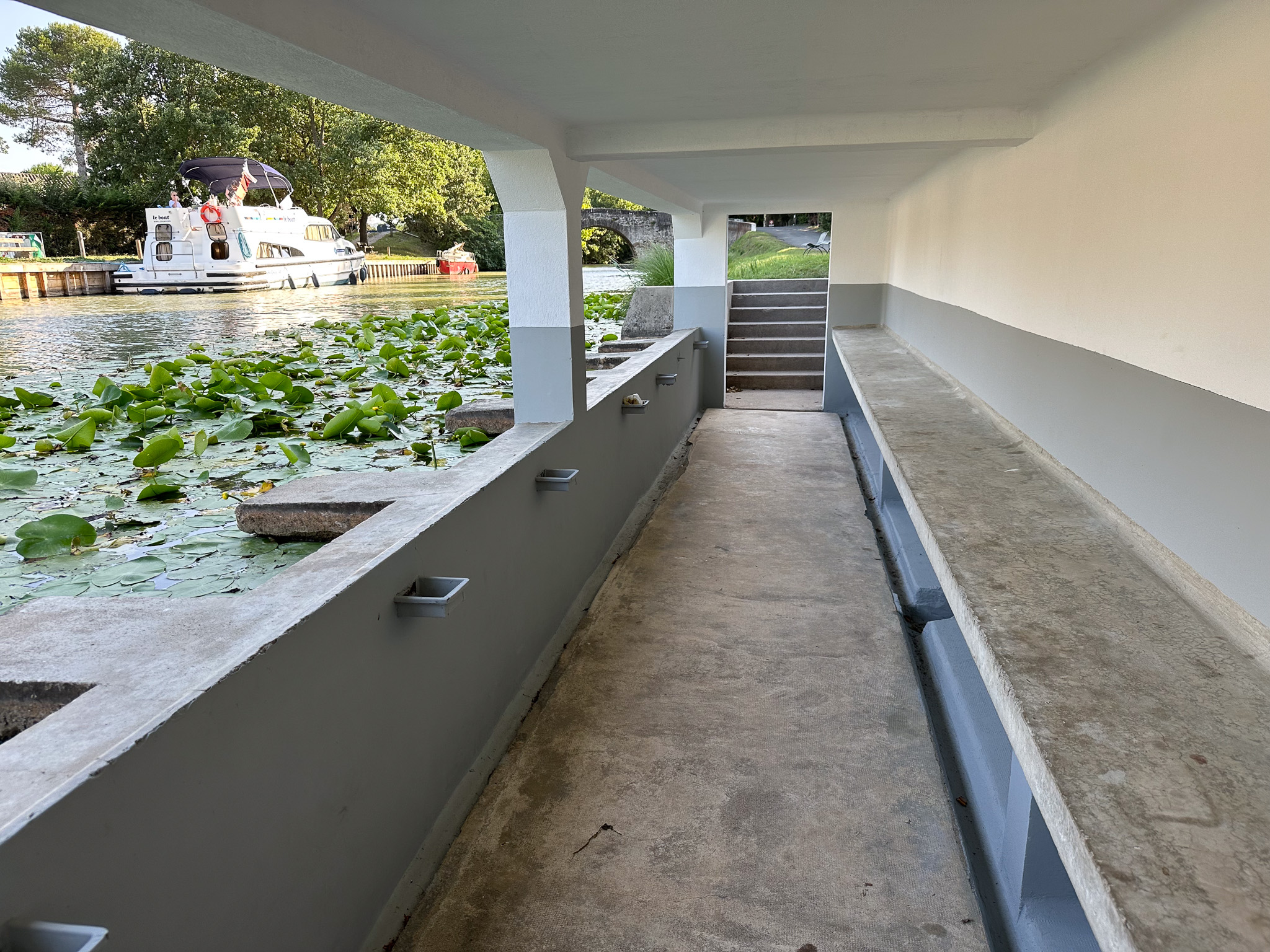 In several places we passed old washing stations or lavoirs. These were public places set aside for the washing of clothes. The one at Villesèquelande has been restored and even has a roof. Others were exposed and in various states of (dis)repair. No one would wash anything in the canal these days. We were horrified to learn that there is no requirement for any of the boats to have holding tanks. All boat sewerage is discharged directly into the canal making it more or less an open sewer. Surely something could be done to better manage this.